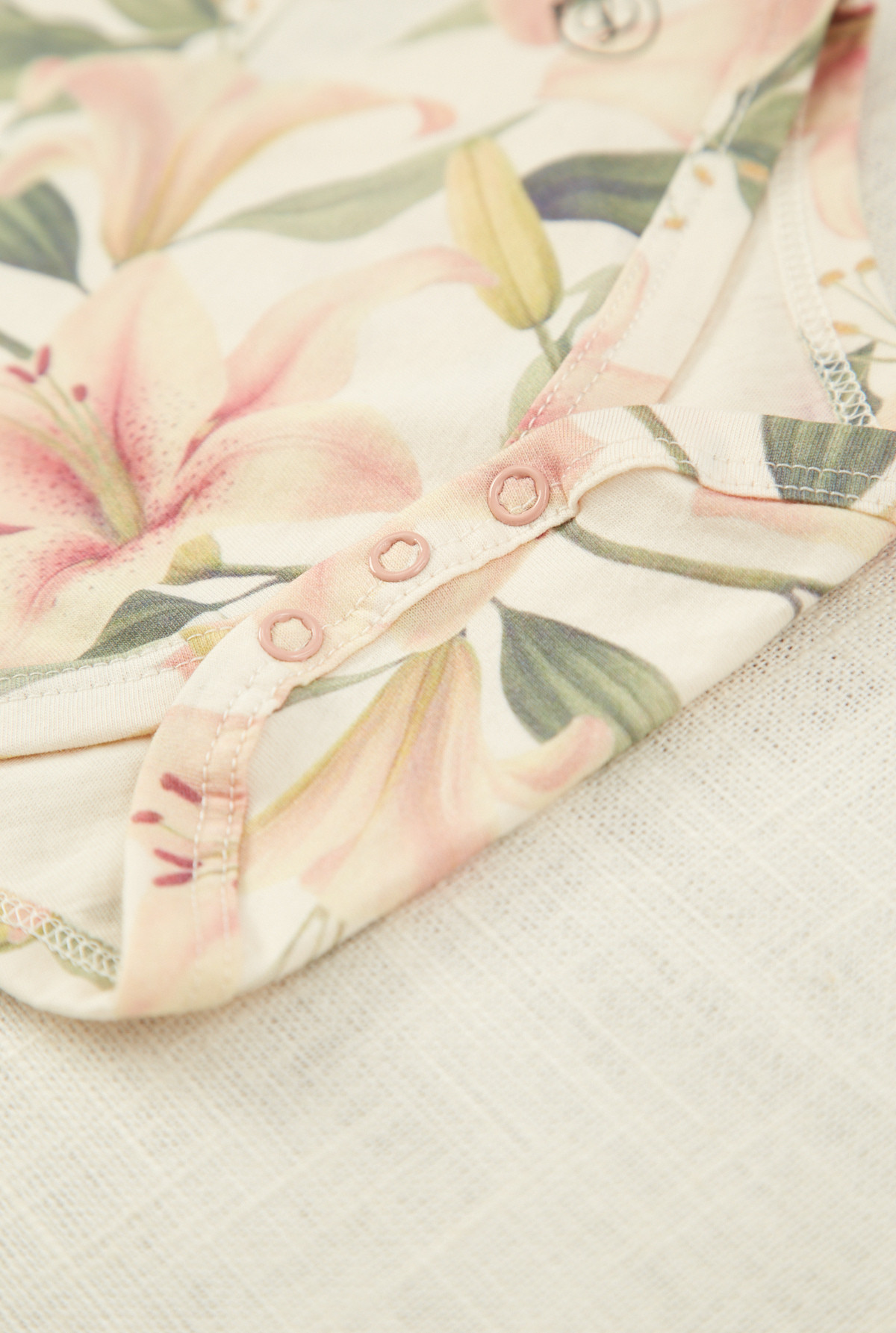 Body manga corta estampado. Con cuello redondo y gota con botón en la espalda para facilitar la colocación del mismo.