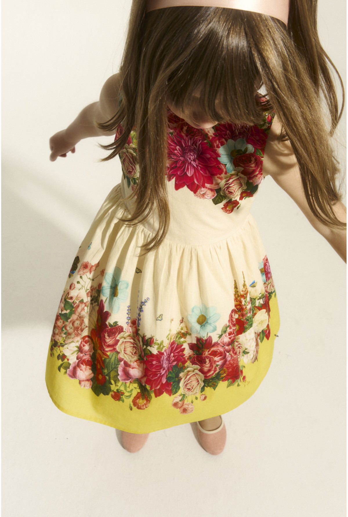 Vestido sin mangas estampado, con falda amplia y detalle de moño de saten en la espalda.