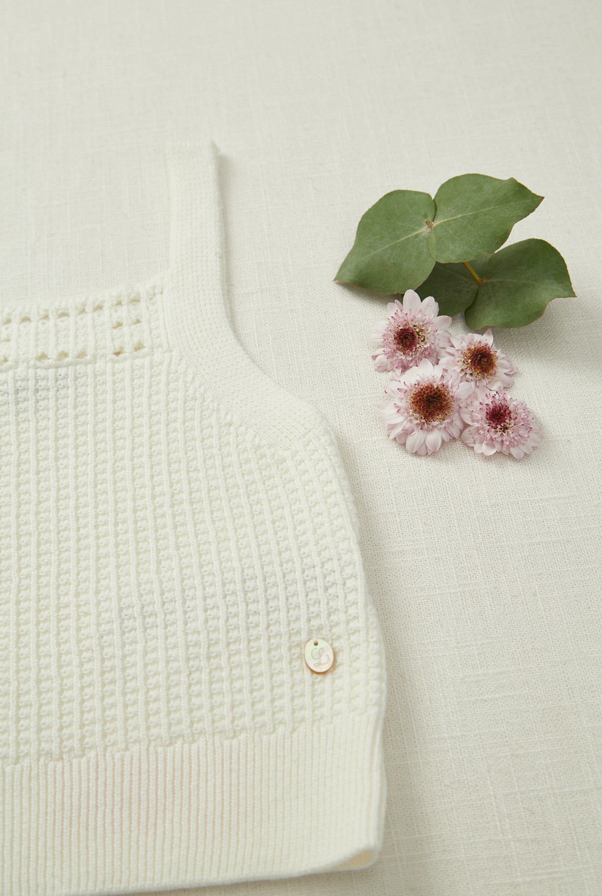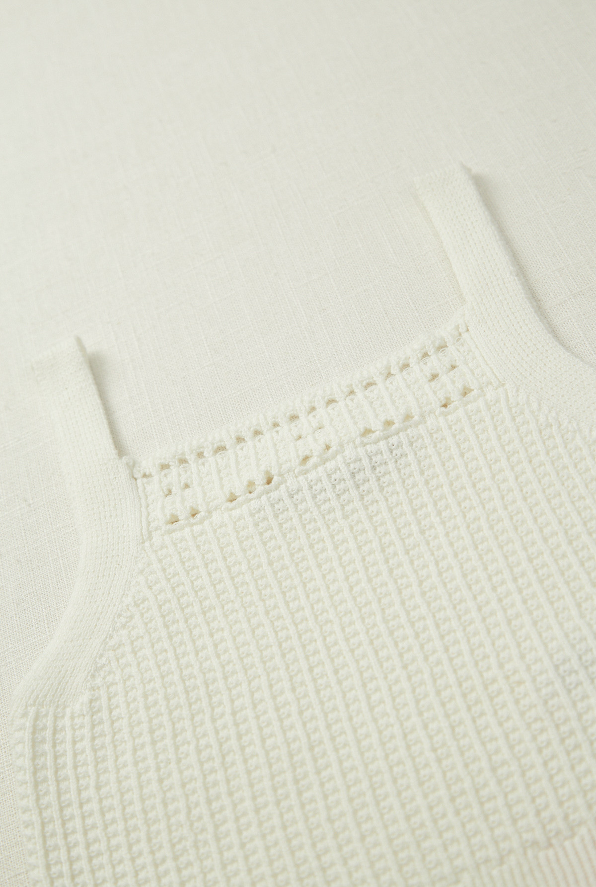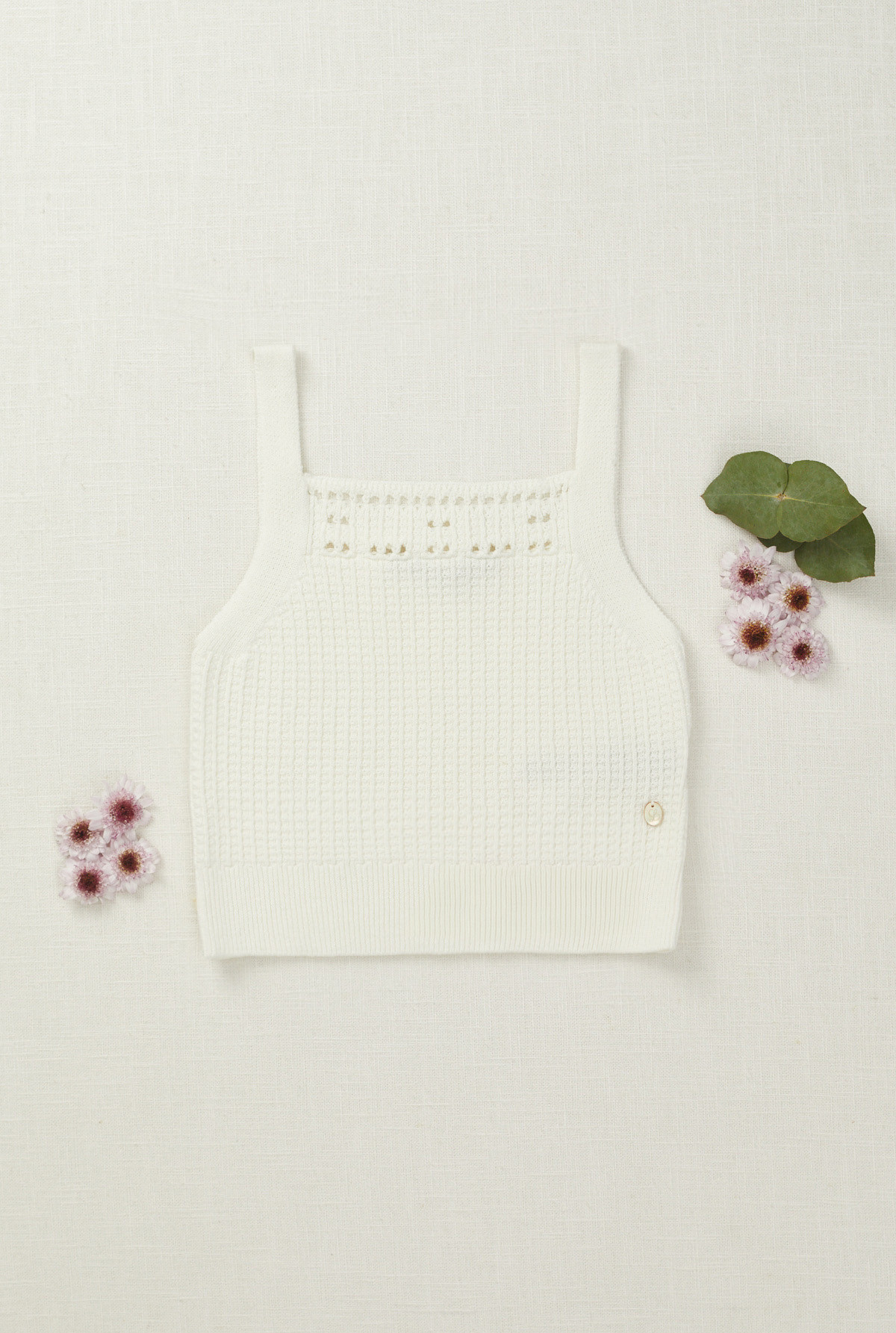 Musculosa con bretel ancho y detalle de tejido crochet en el cuello. Calce recto.