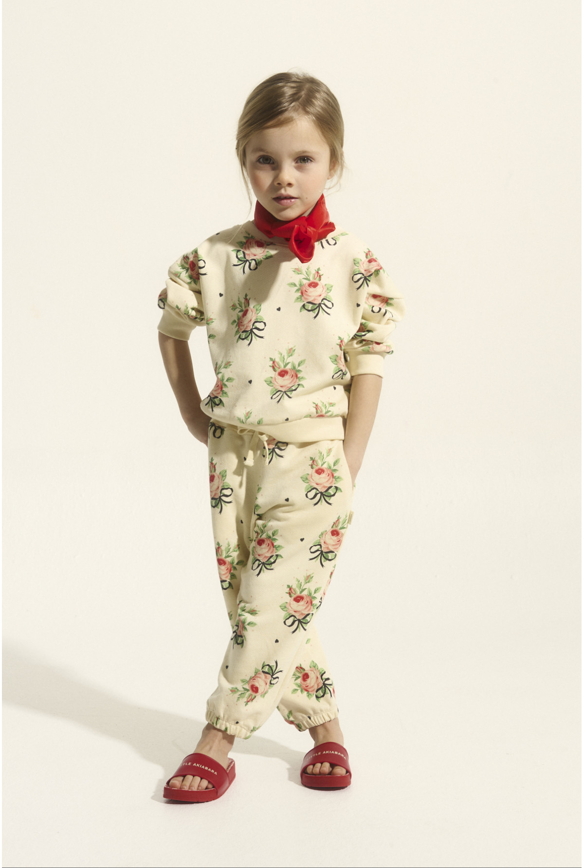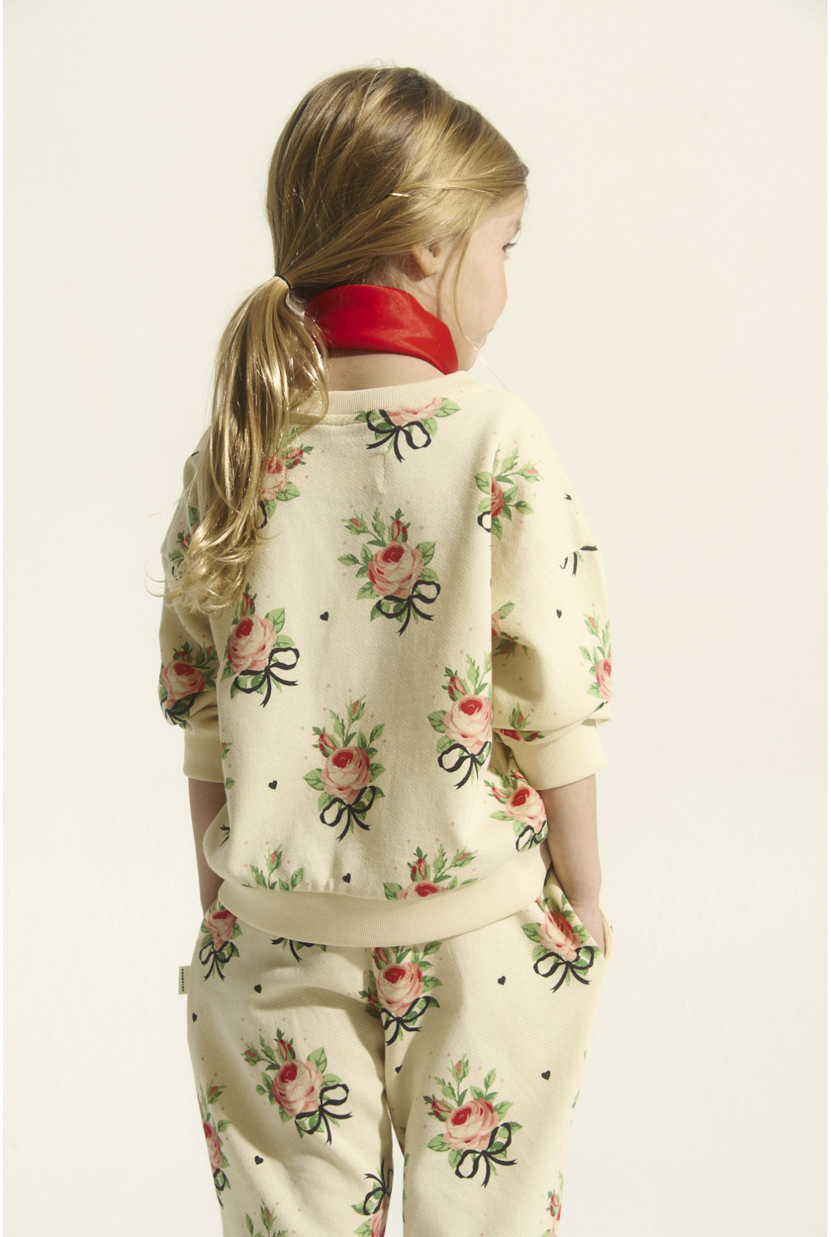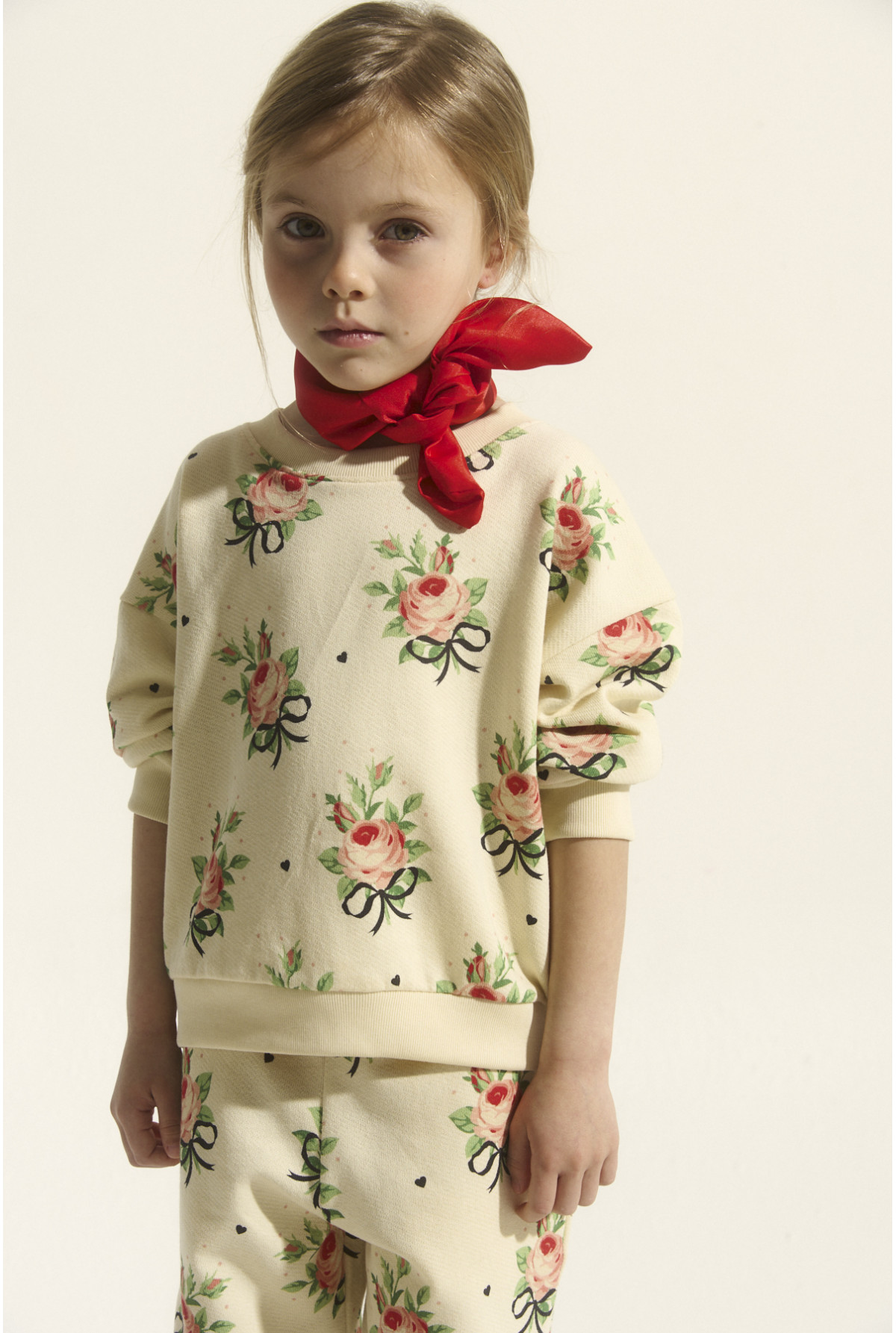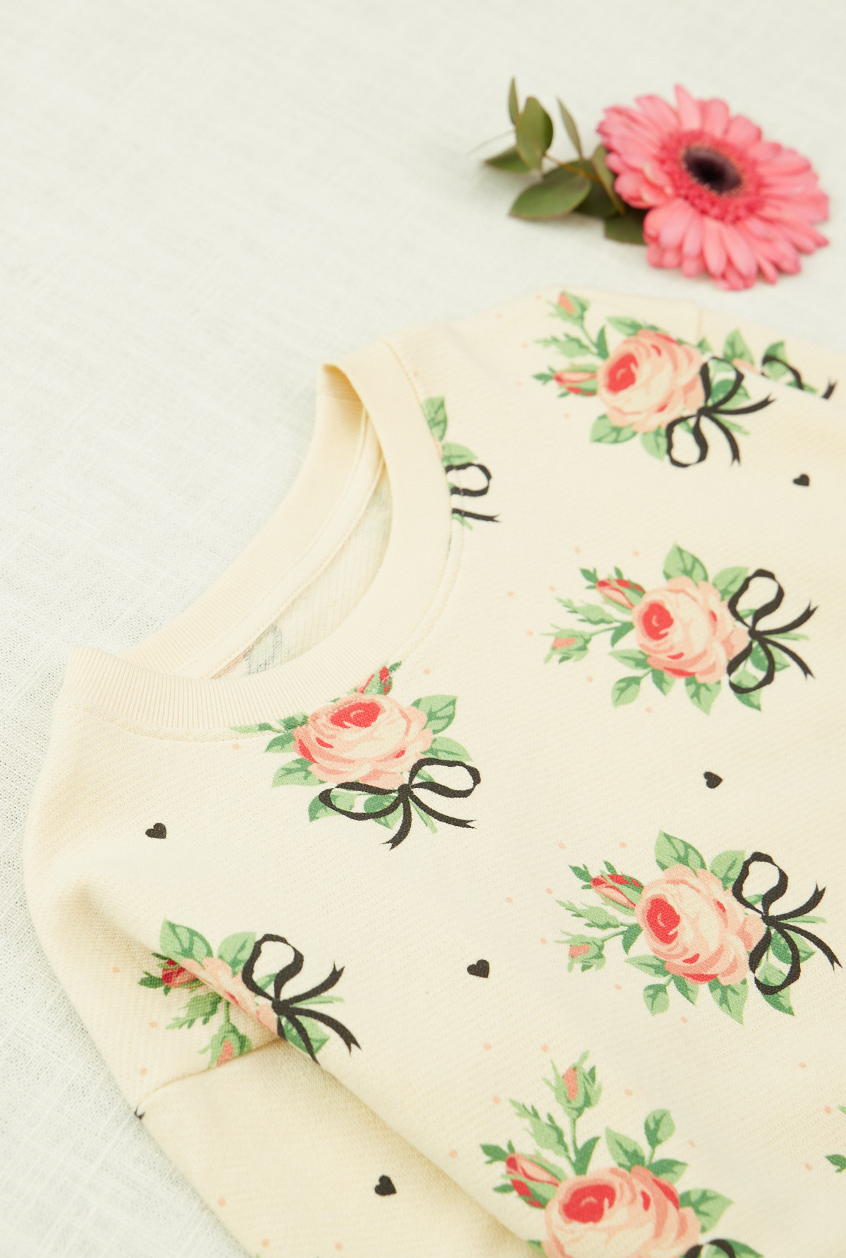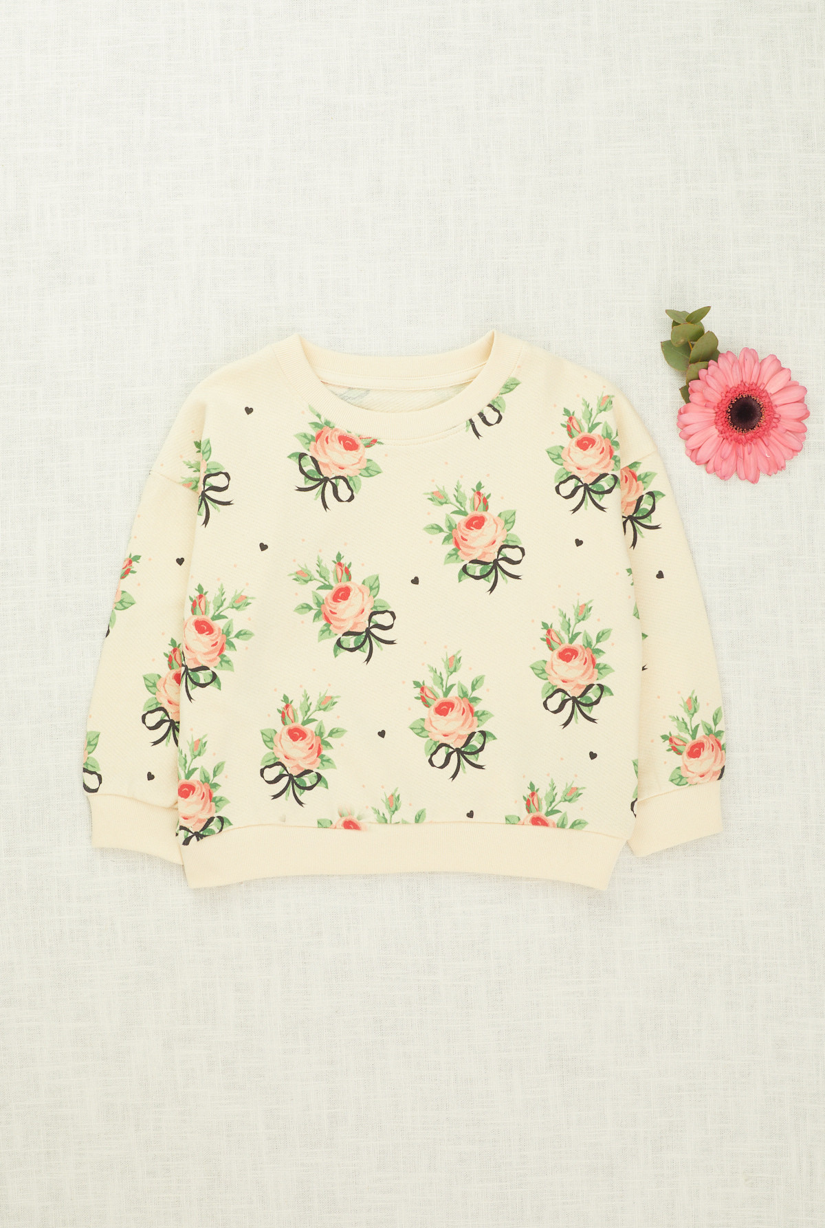 Buzo estampado con motivo floral, cuello redondo manga larga con rib doble en puños, cintura y escote.
