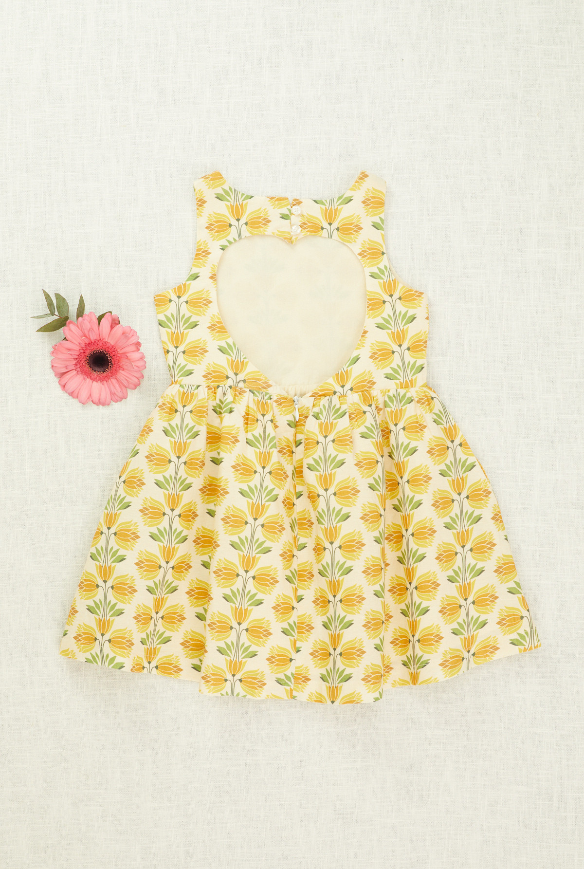 Vestido sin mangas estampado, con falda amplia y detalle espalda abierta.