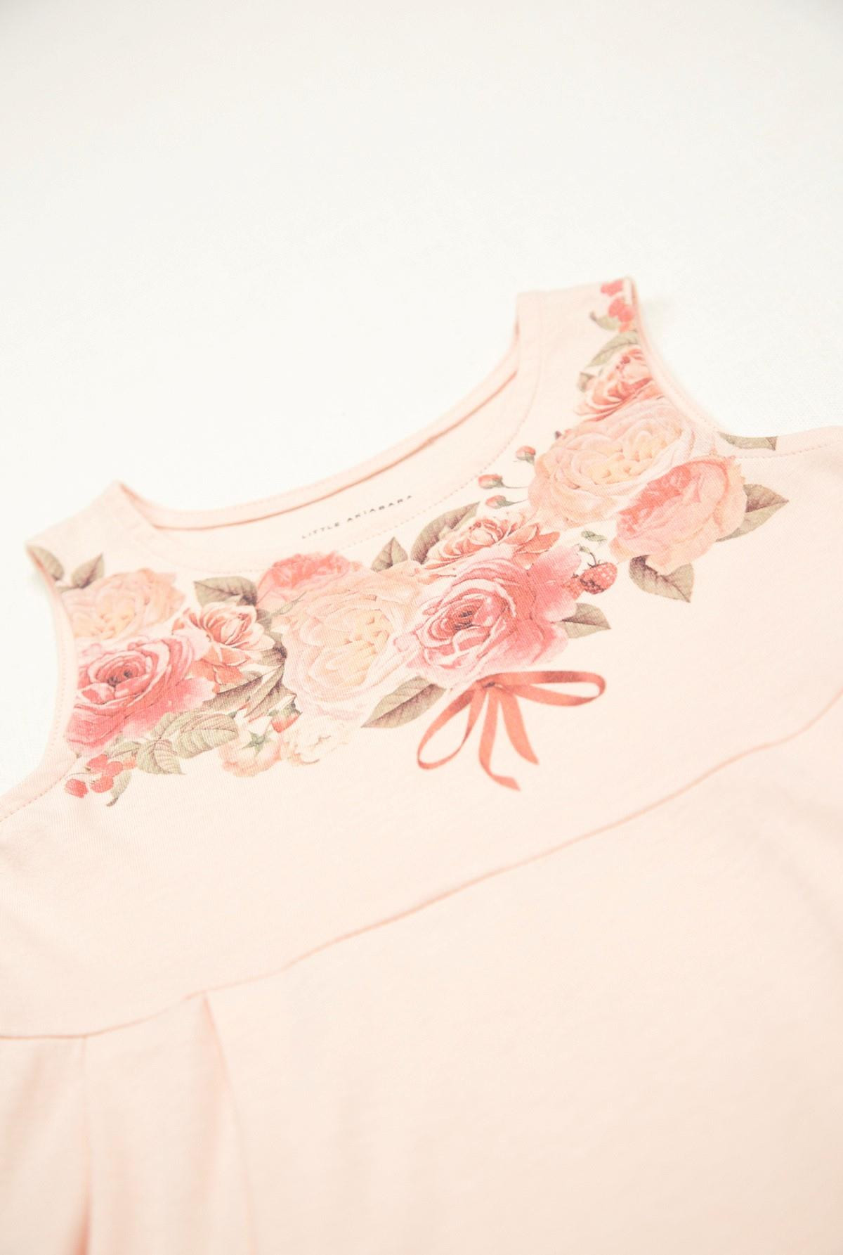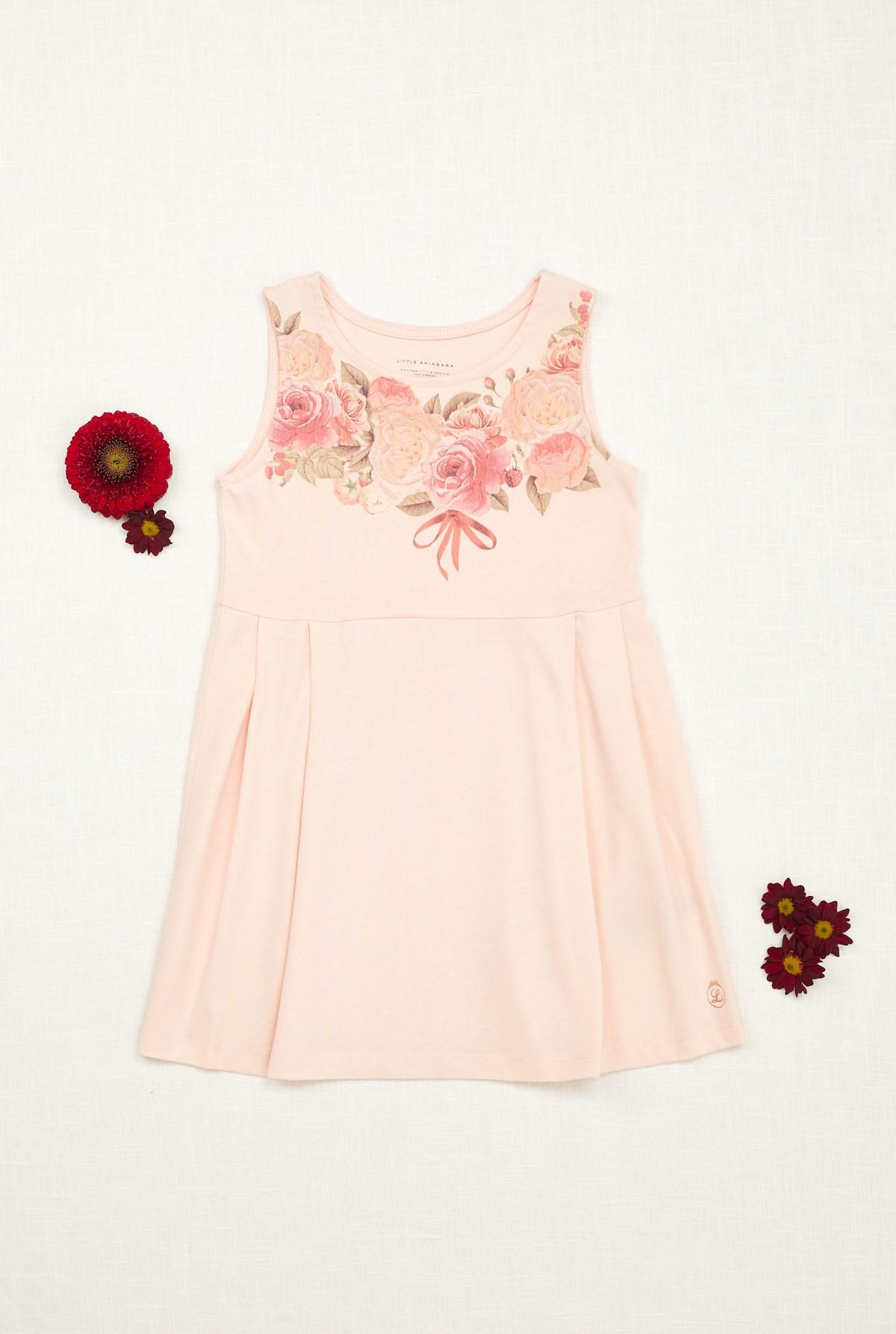 Vestido a la rodilla, cuello redondo, manga americana en algodón. Pechera delantera estampada con bouquets de rosas. Recorte en pechera y falda con tablas.