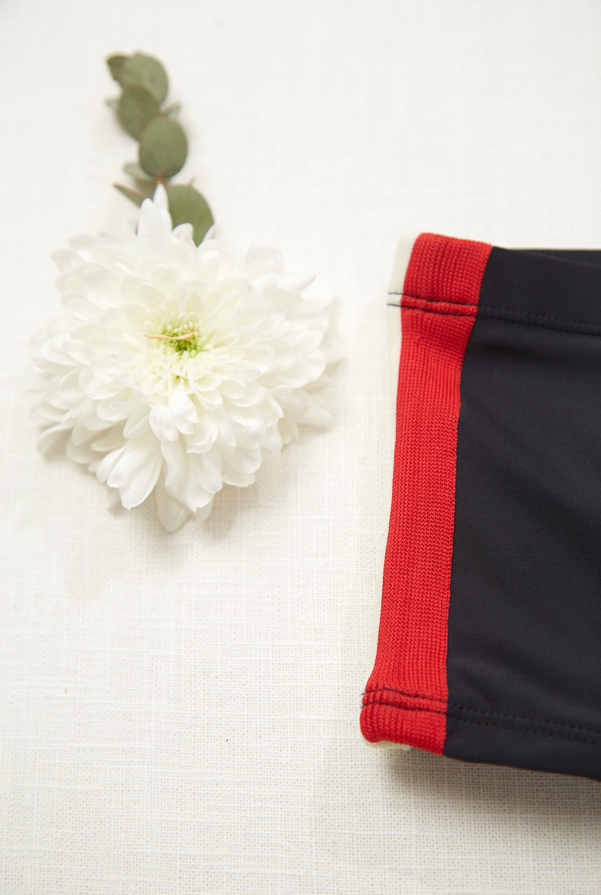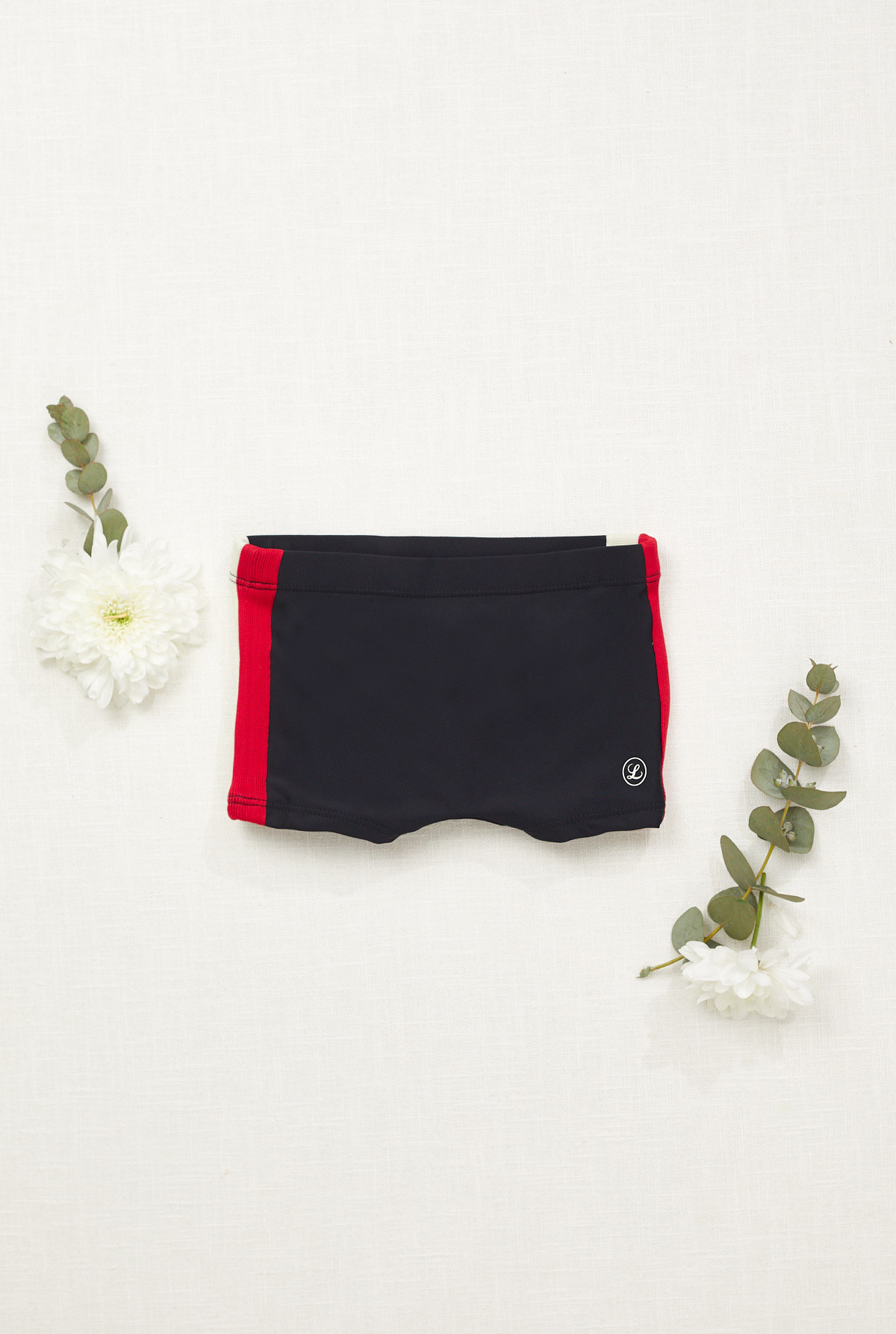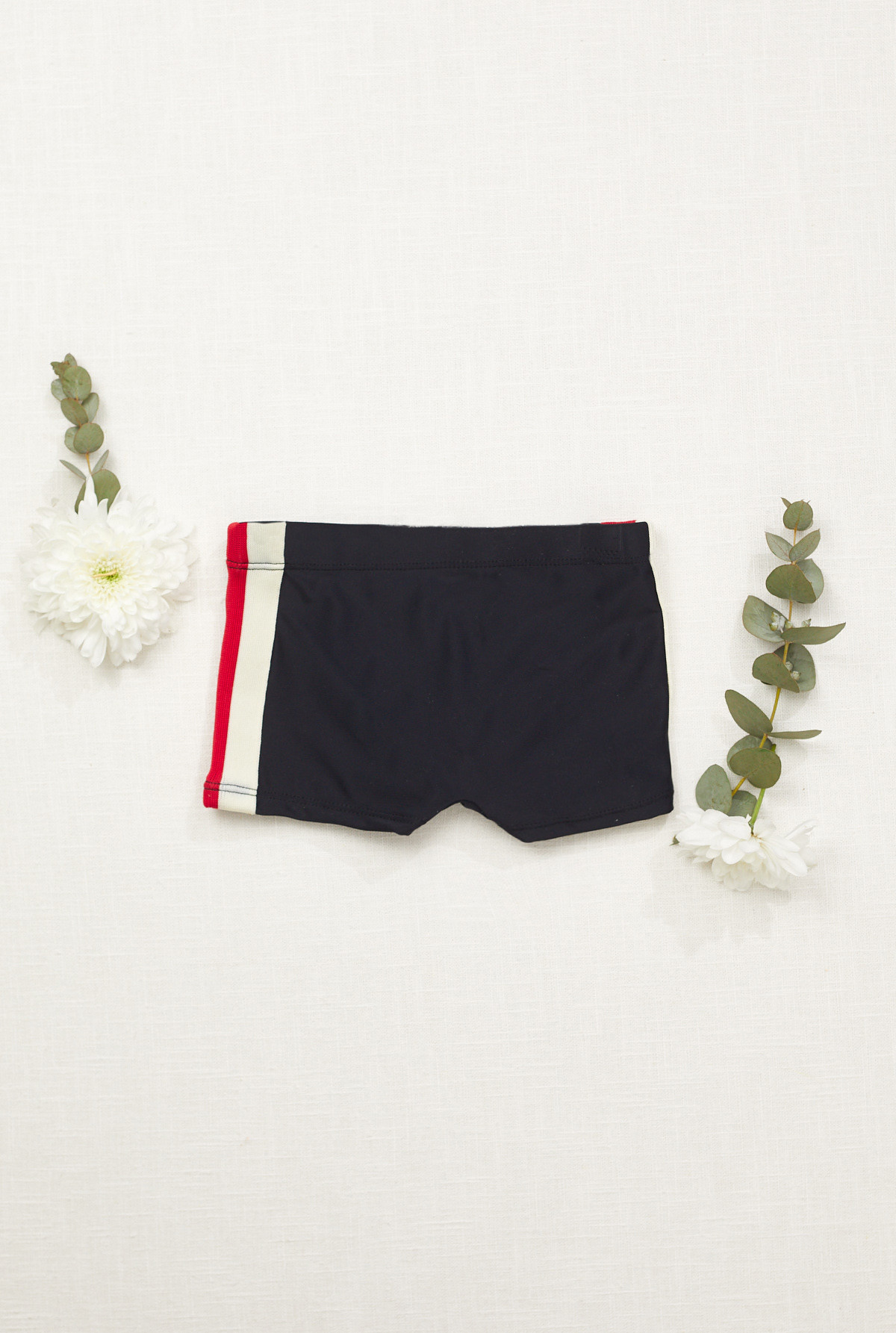 Short de baño liso forrado de nylon elastizado con detalles de tiras rayadas tejidas en laterales.