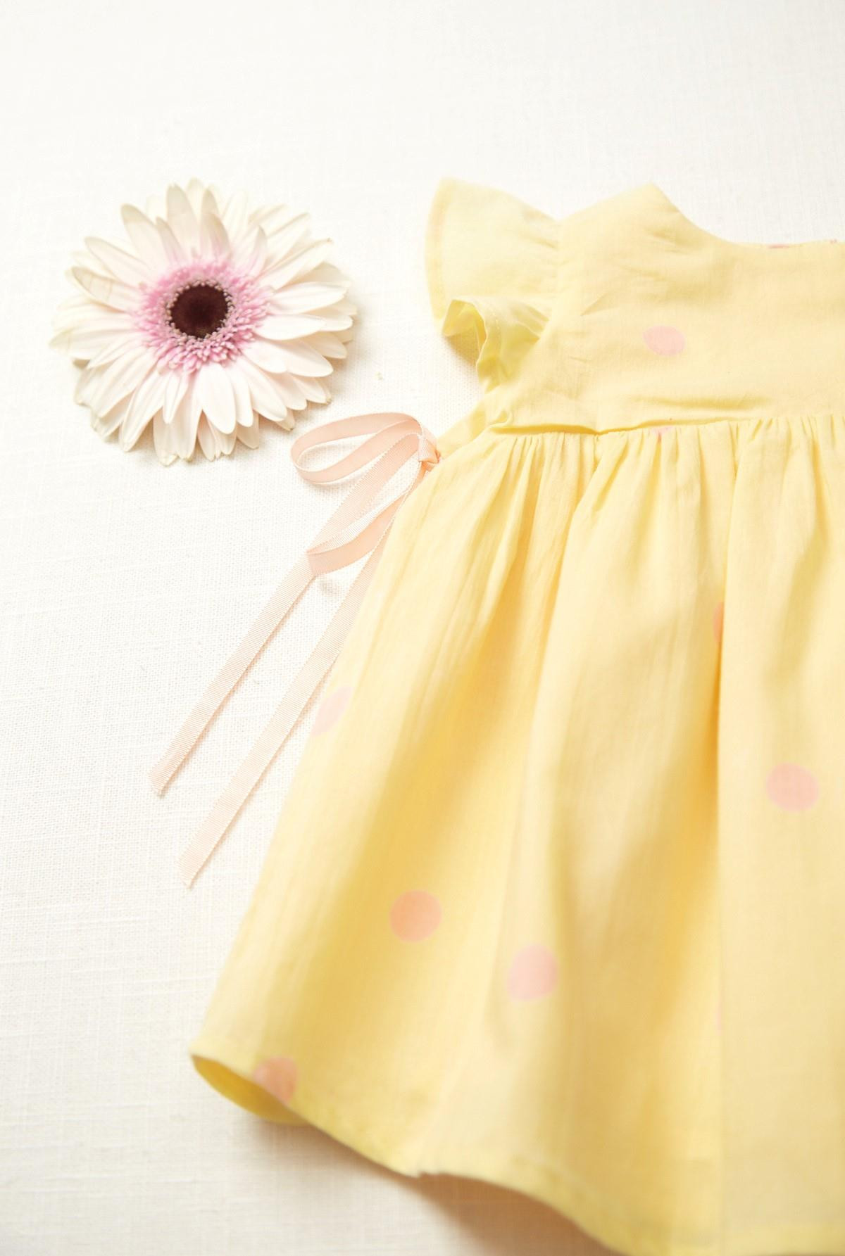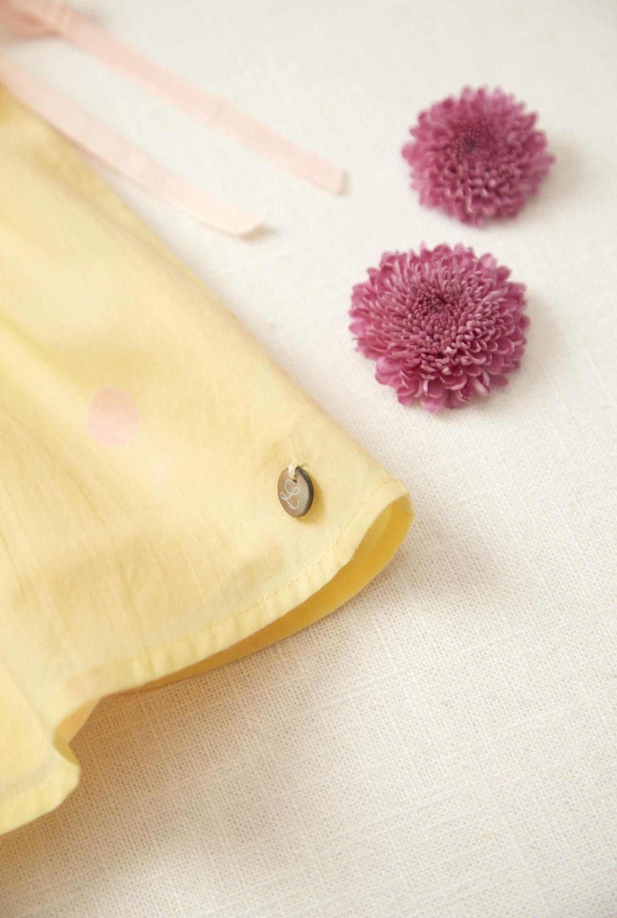 Vestido manga corta, largo arriba de la rodilla de voile de algodón estampado con lunares. Tajitos en laterales con lazo para atar. Con forrería de algodón.