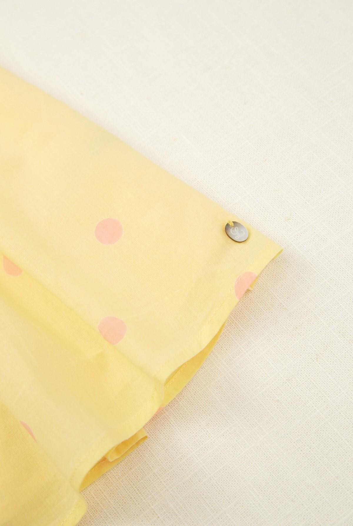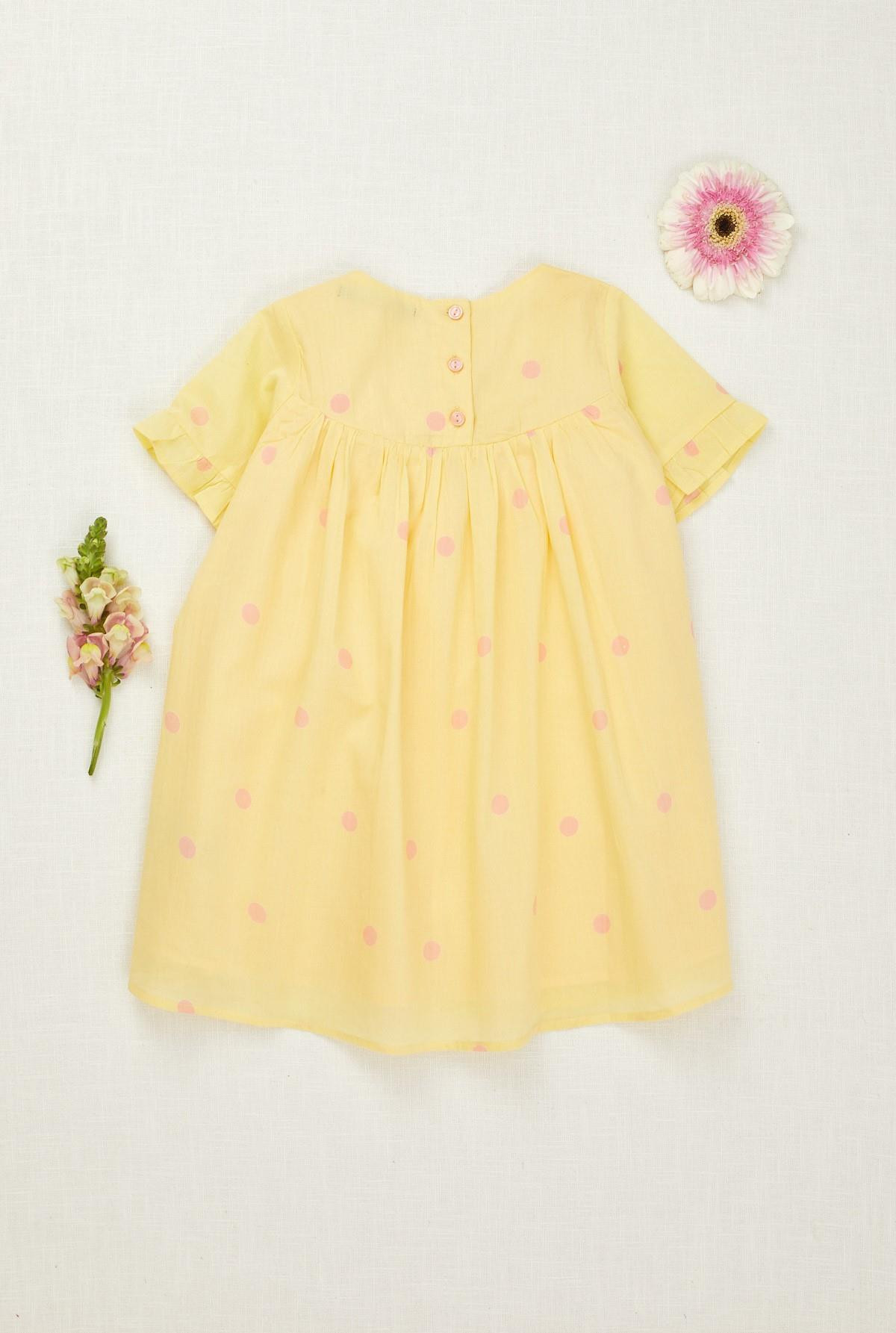 Vestido amplio manga corta, largo arriba de la rodilla de voile de algodón estampado con lunares. Detalle de voladitos en terminación de manga. Con forrería de algodón.