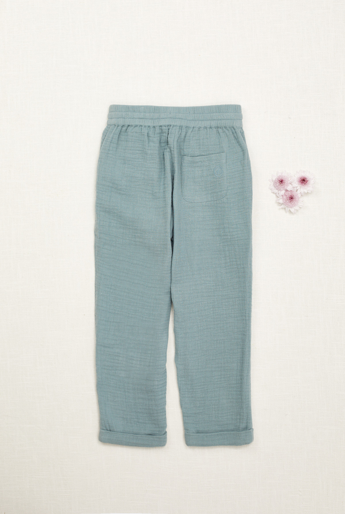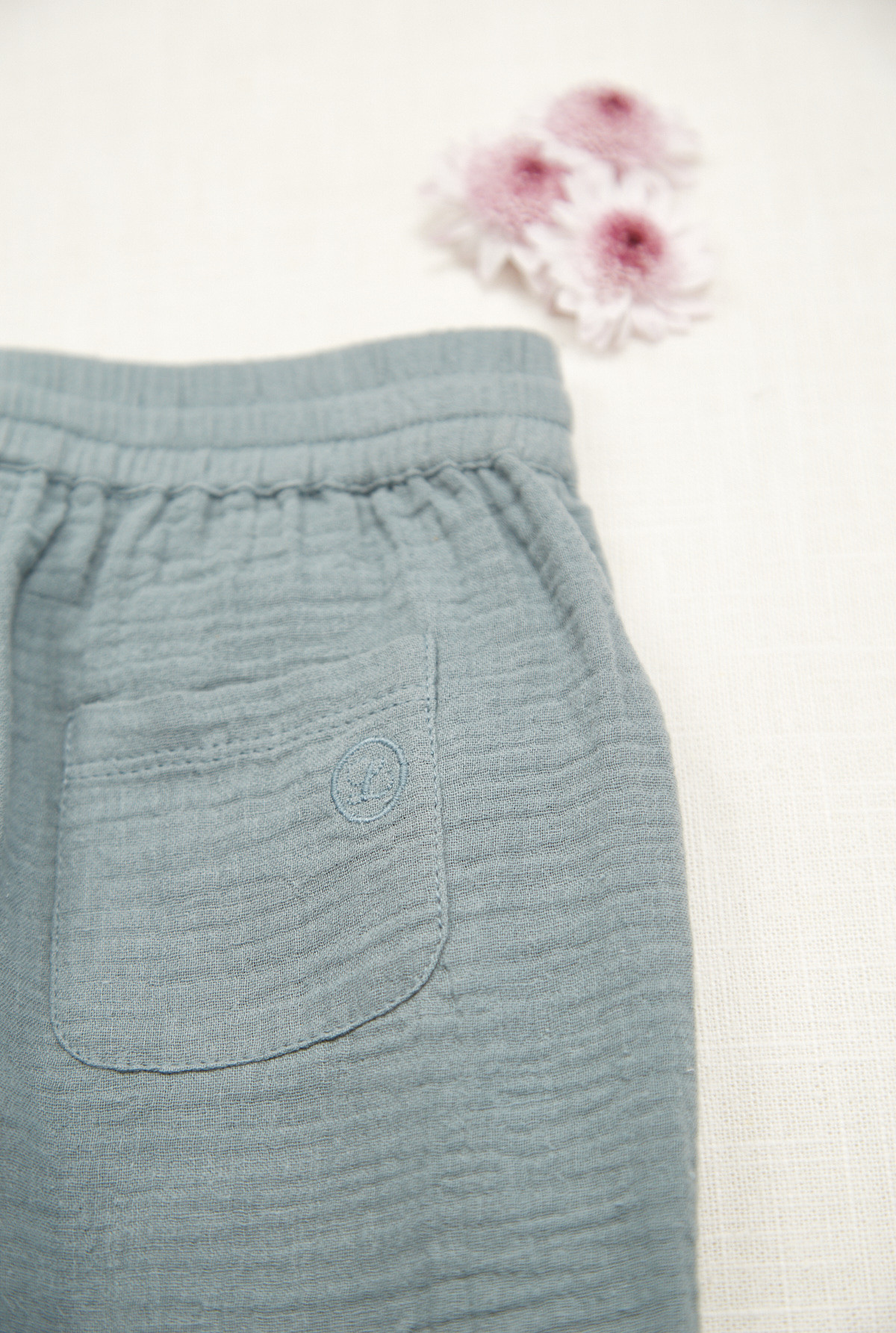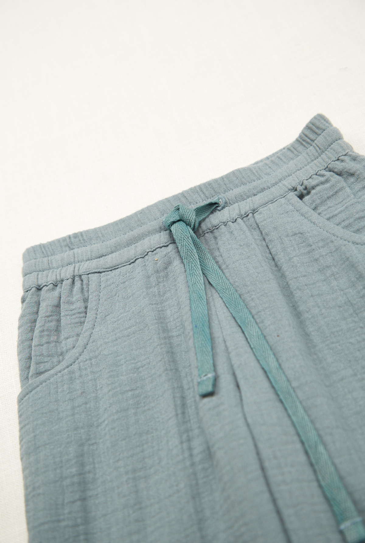 Pantalón con cintura elastizada y cordones para atar. Bolsillos funcionales en frente y bolsillo tipo plaqué redondeado en espalda. Botamanga con detalle de remangado.
