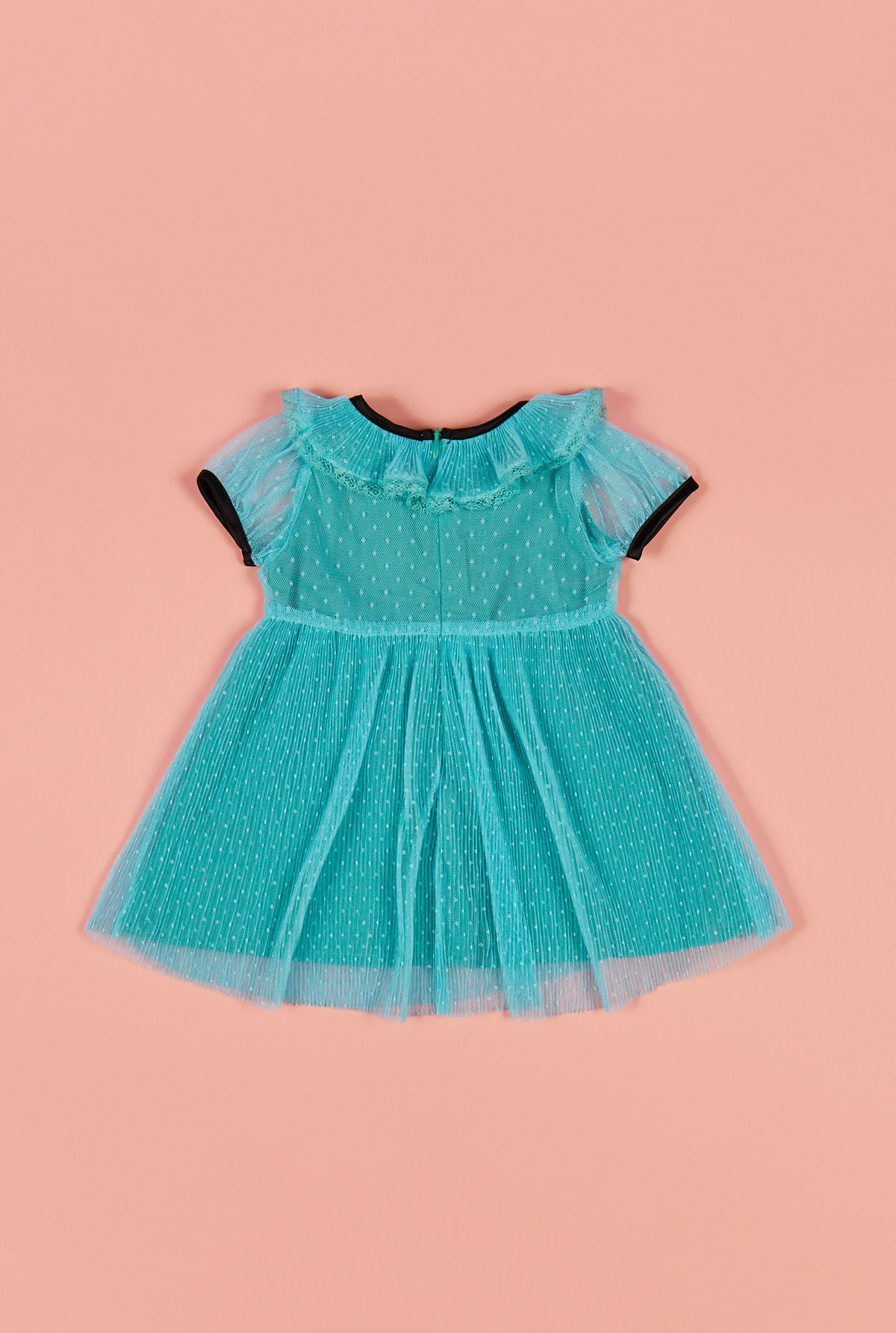 Vestido manga corta, largo arriba de la rodilla de tul plumetí. Falda y cuello plisado con puntilla y detalles de vivos y lazo de raso. a contratono.