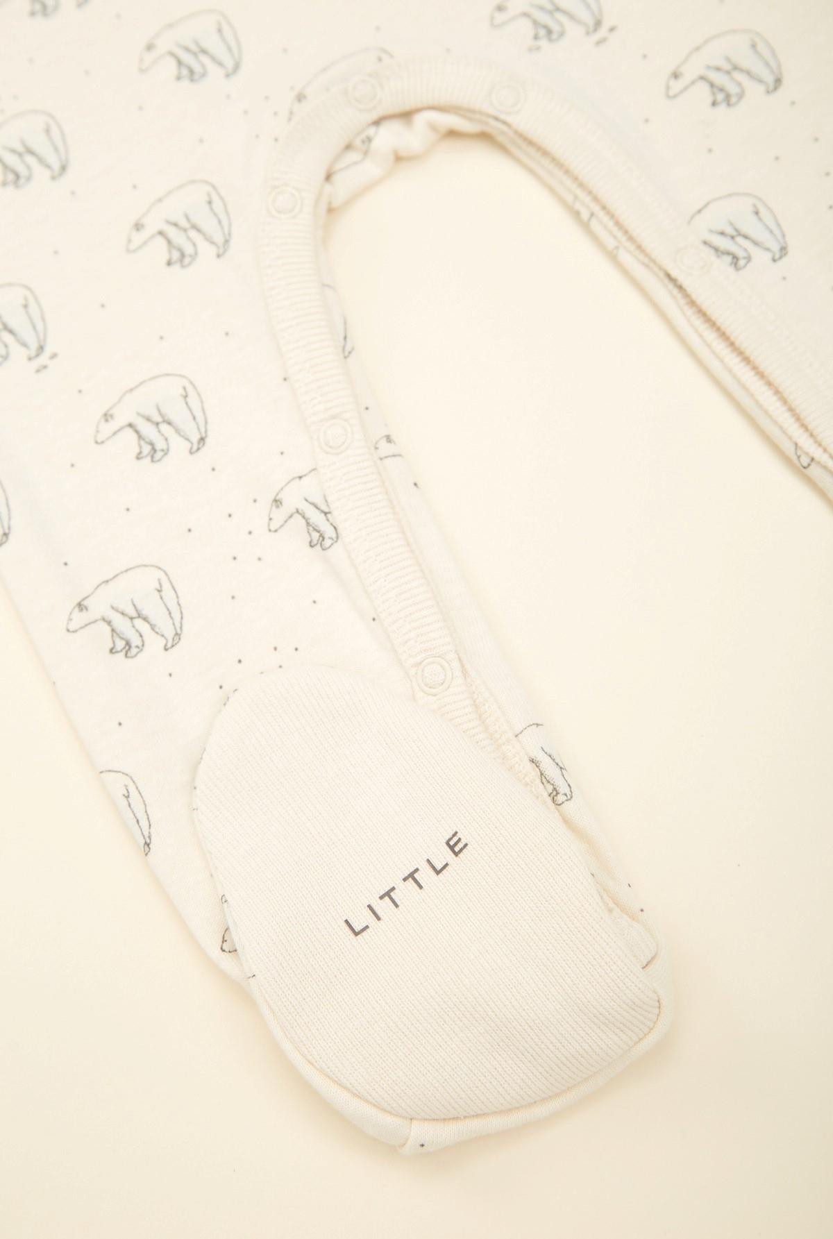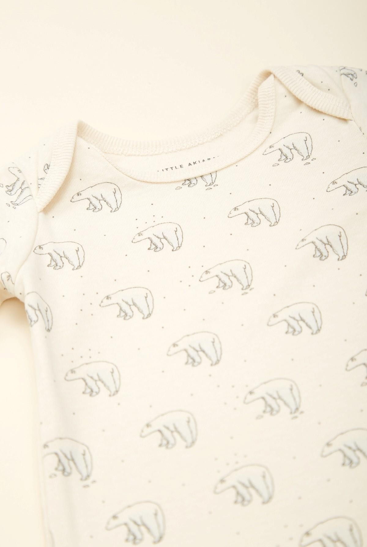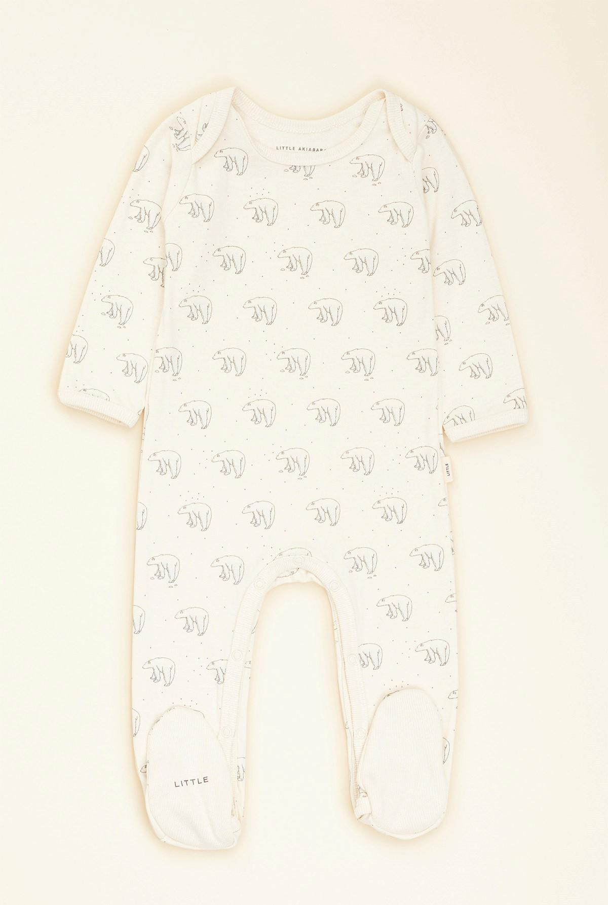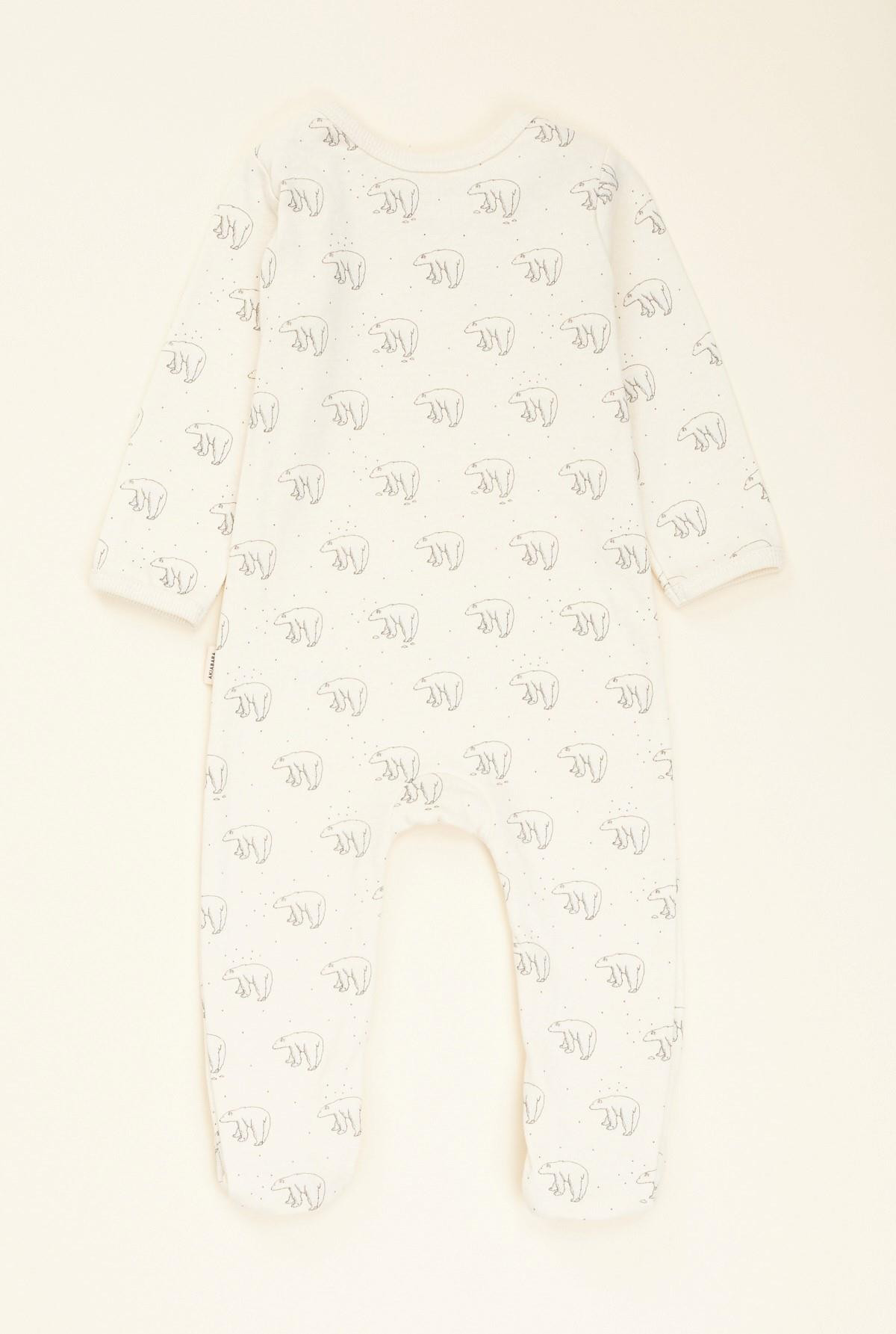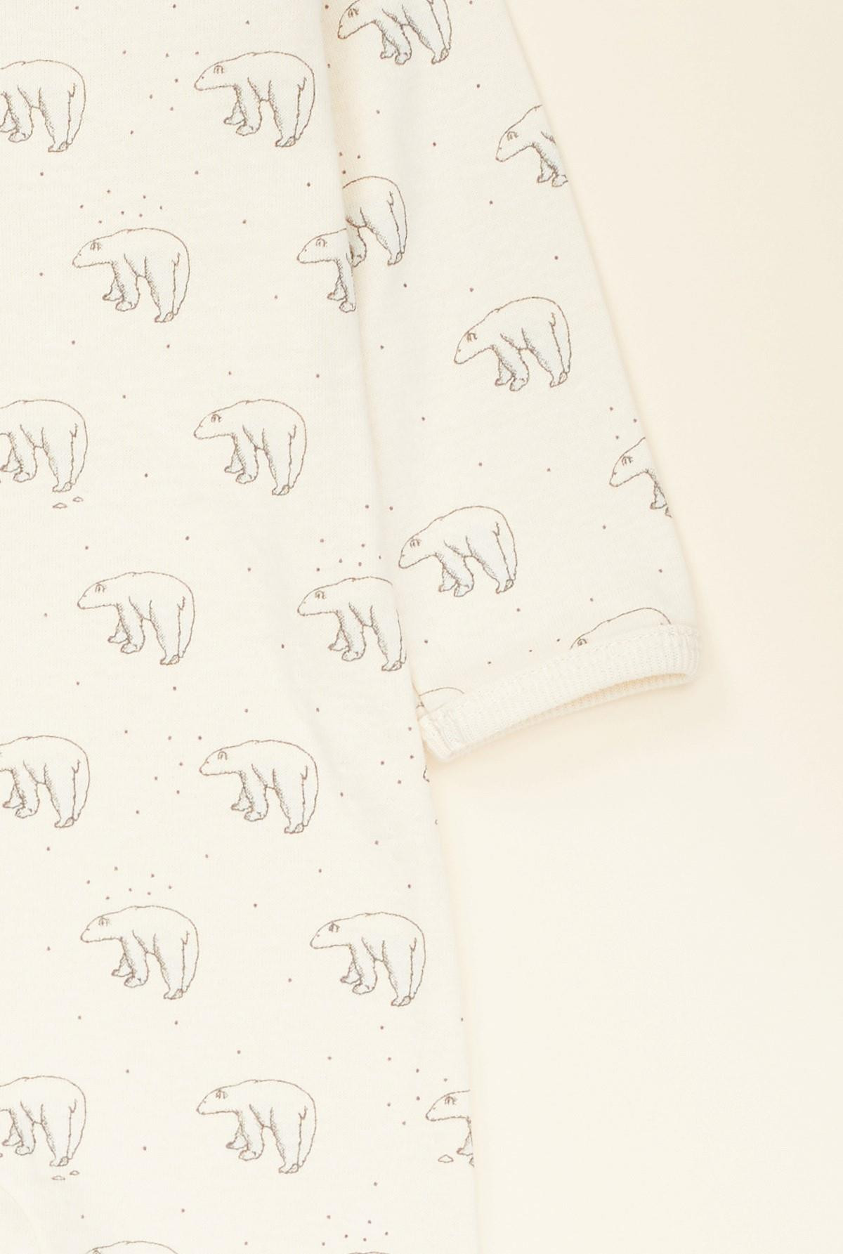 Osito cuello americano, manga larga, en suave jersey doble de algodón peruano, estampado con ositos. Abertura total en entrepierna con snaps para un fácil acceso.