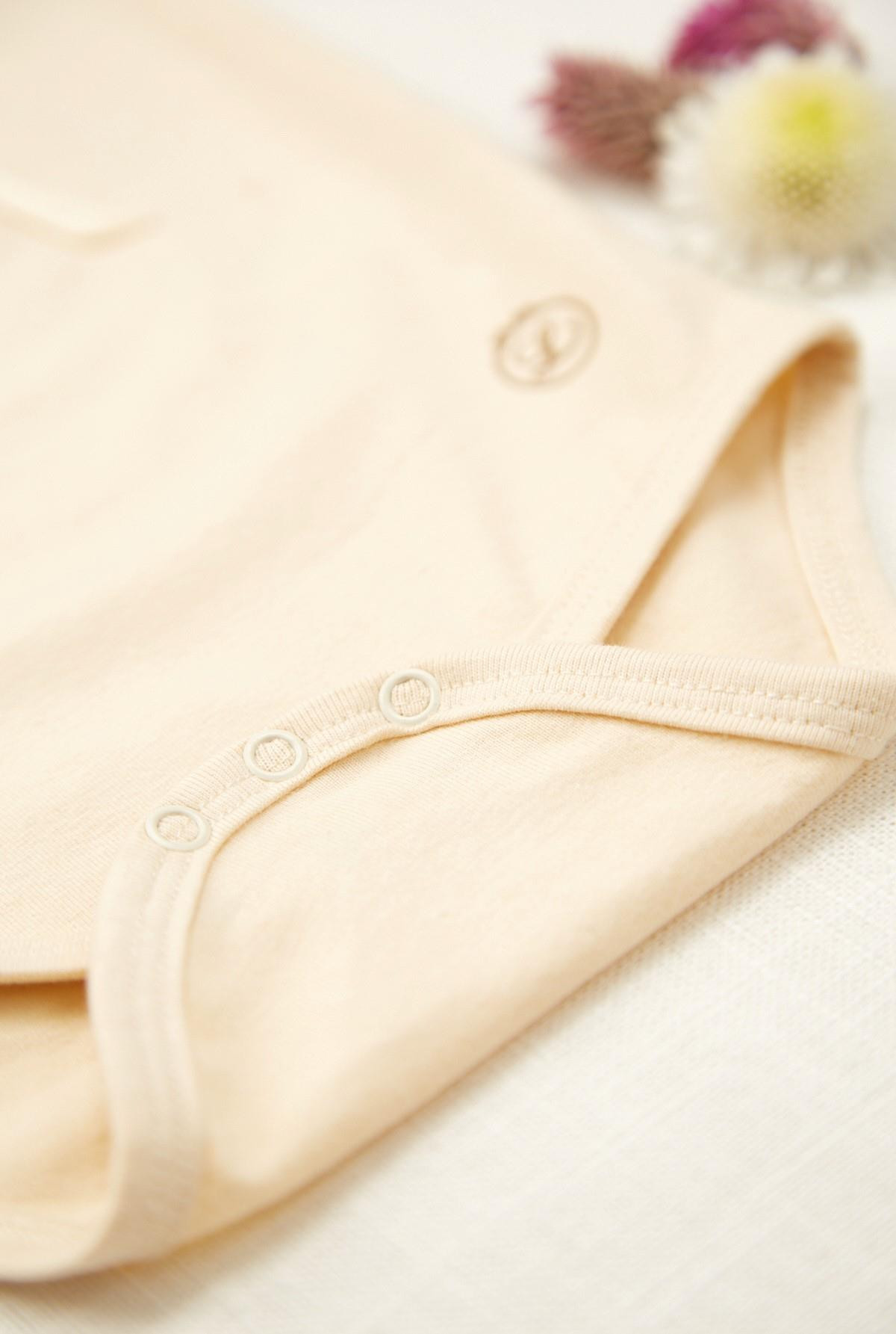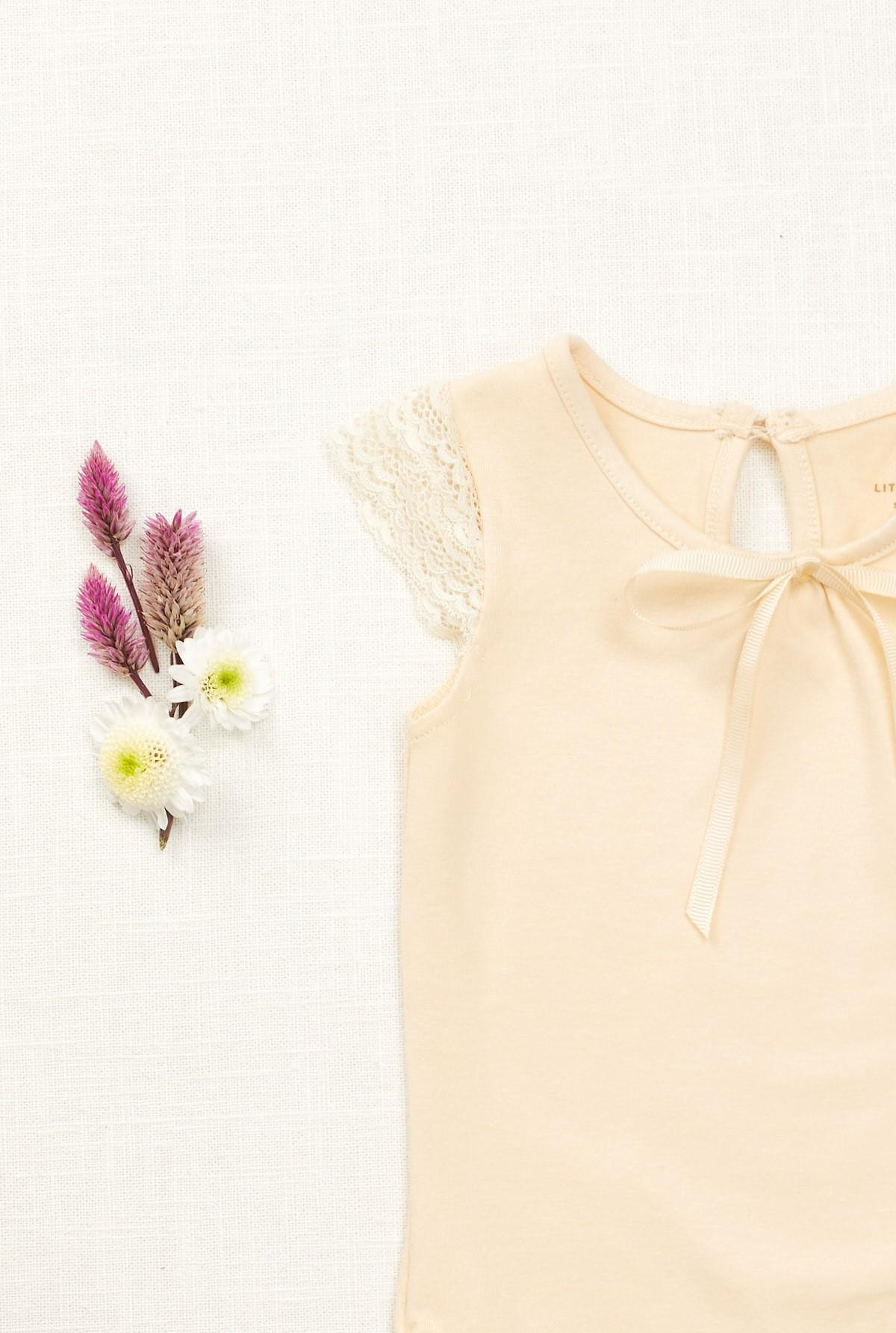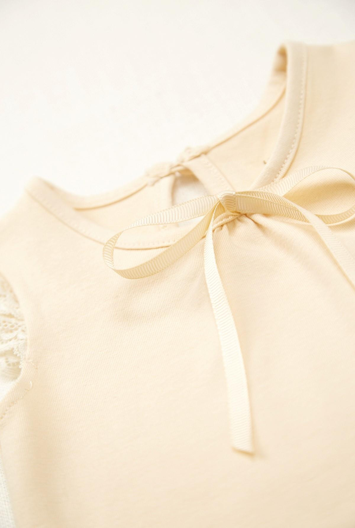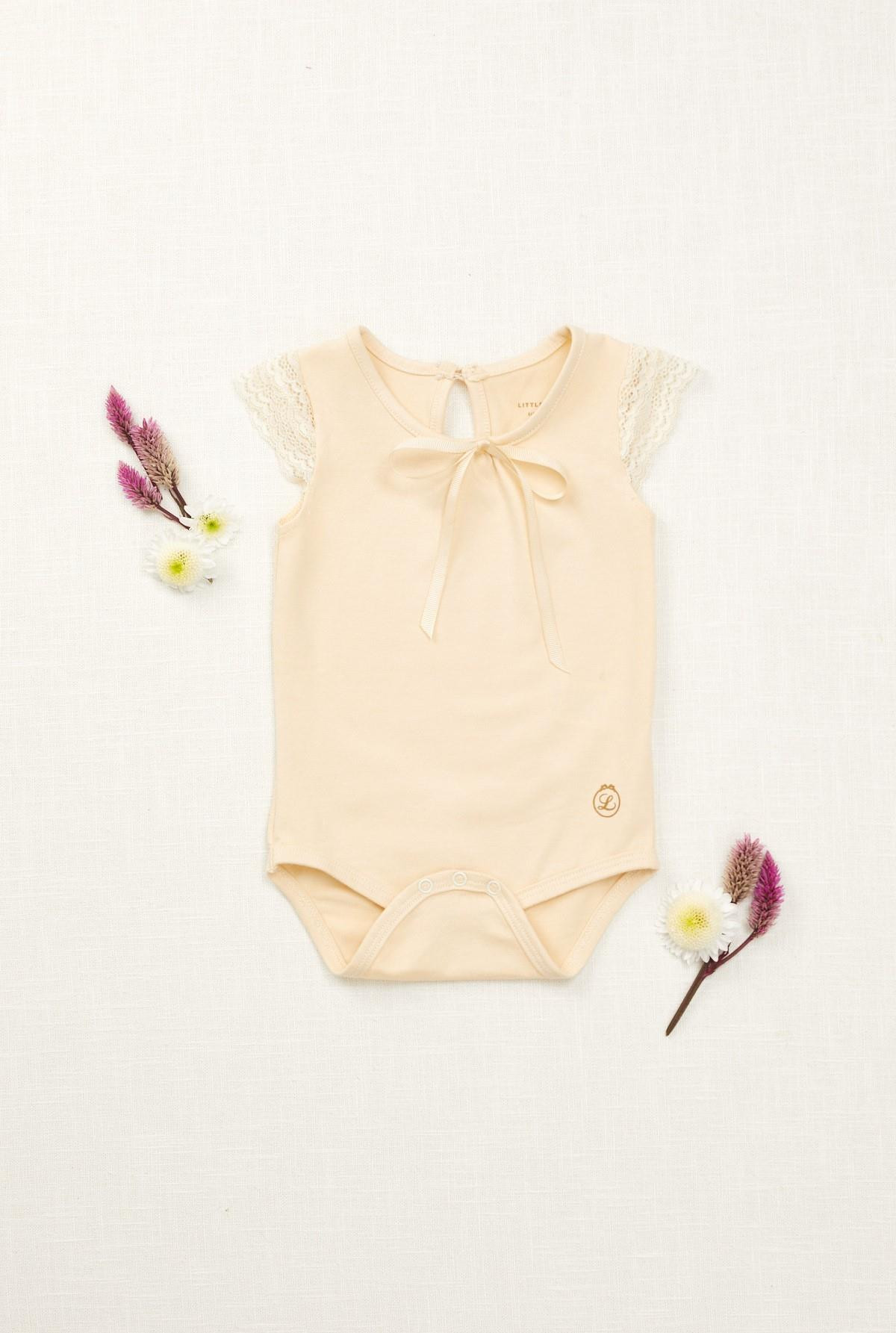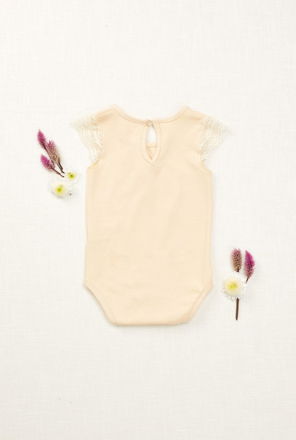 Body sin mangas terminado con doble volado de puntilla. Detalle de moño en escote delantero. Gota con botón en espalda y snaps al tono en entrepierna