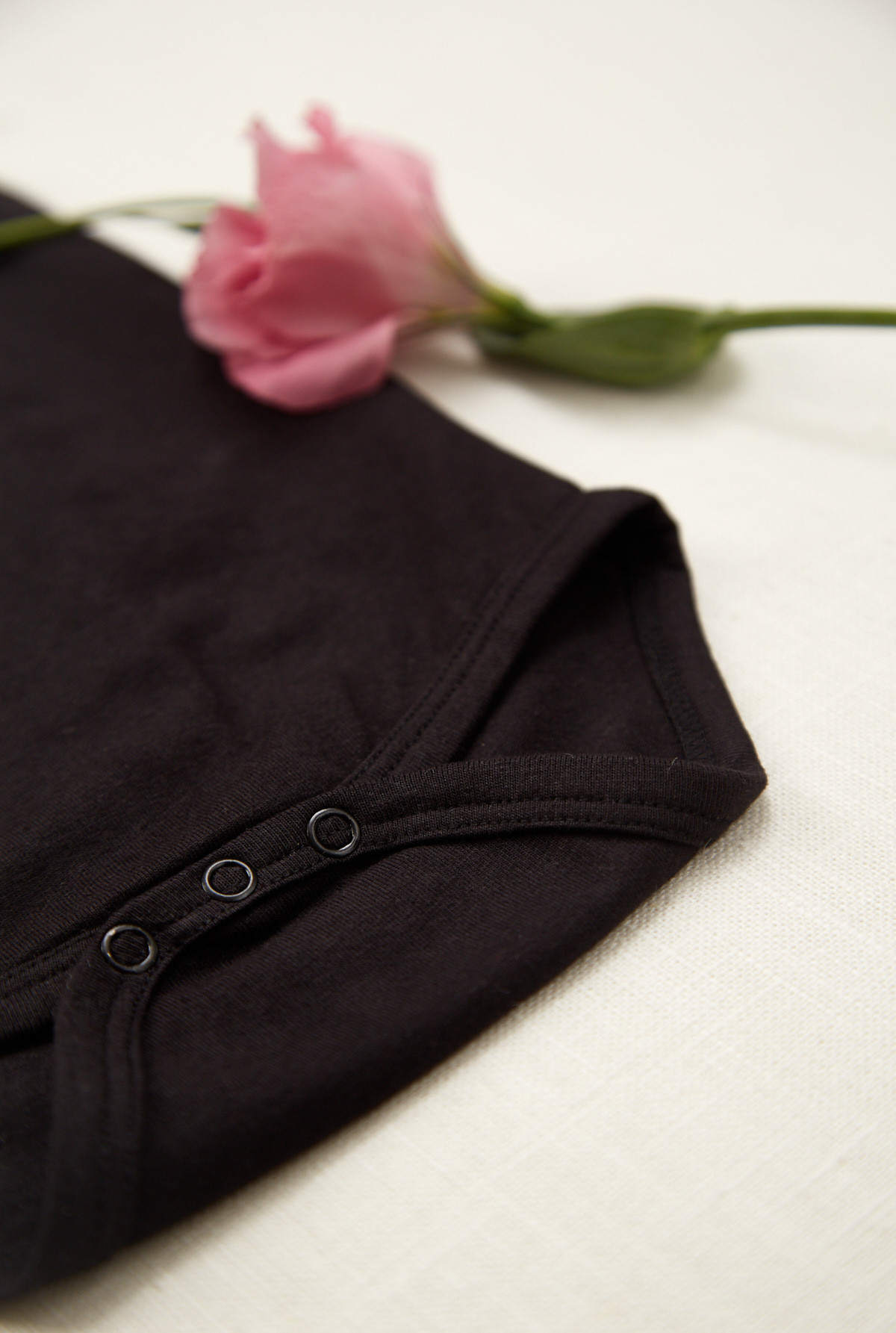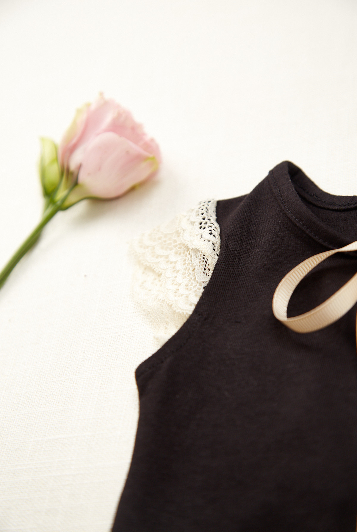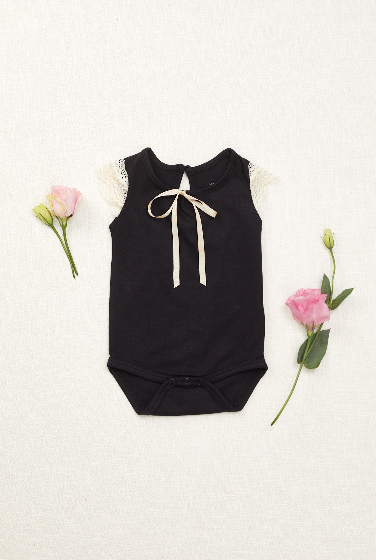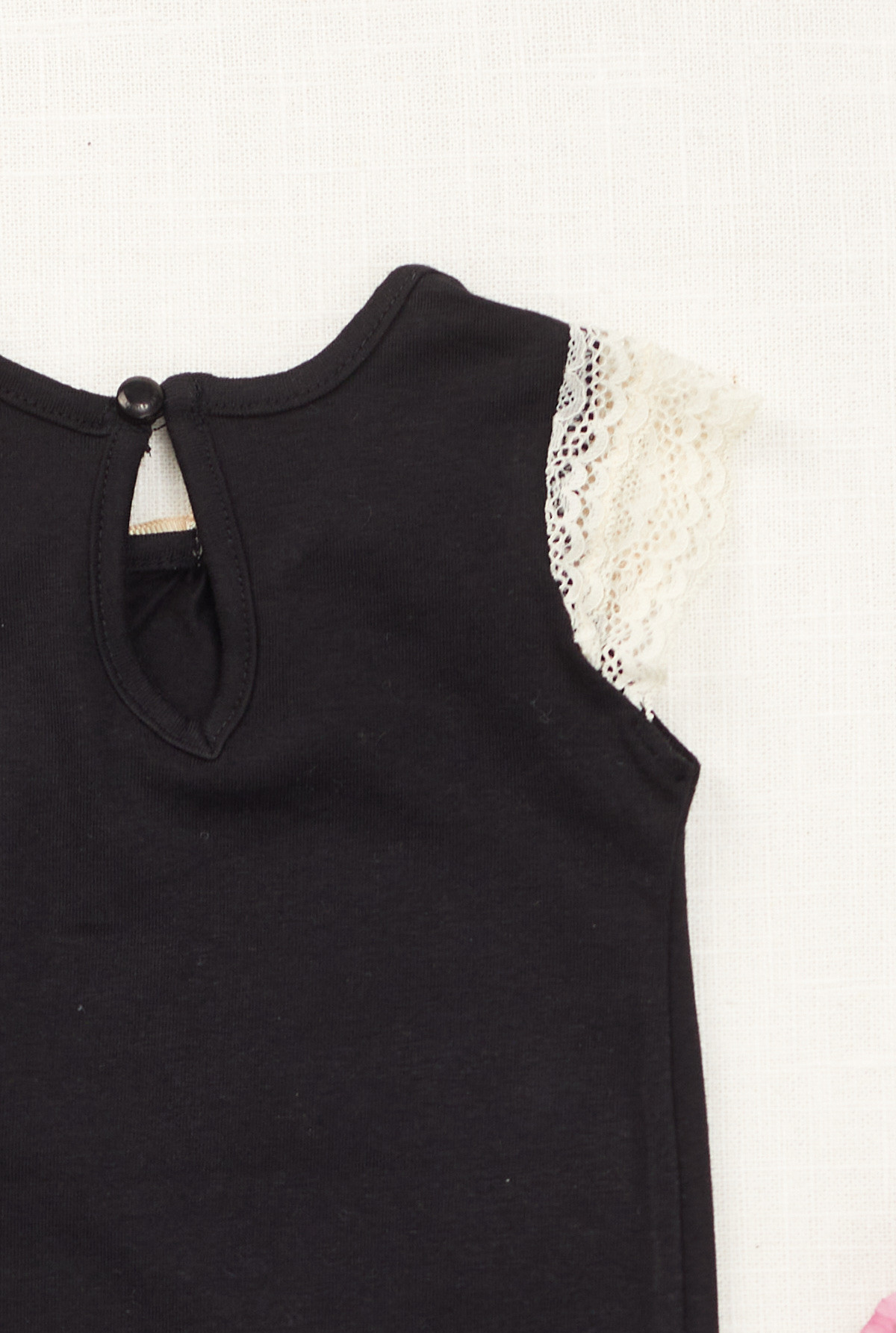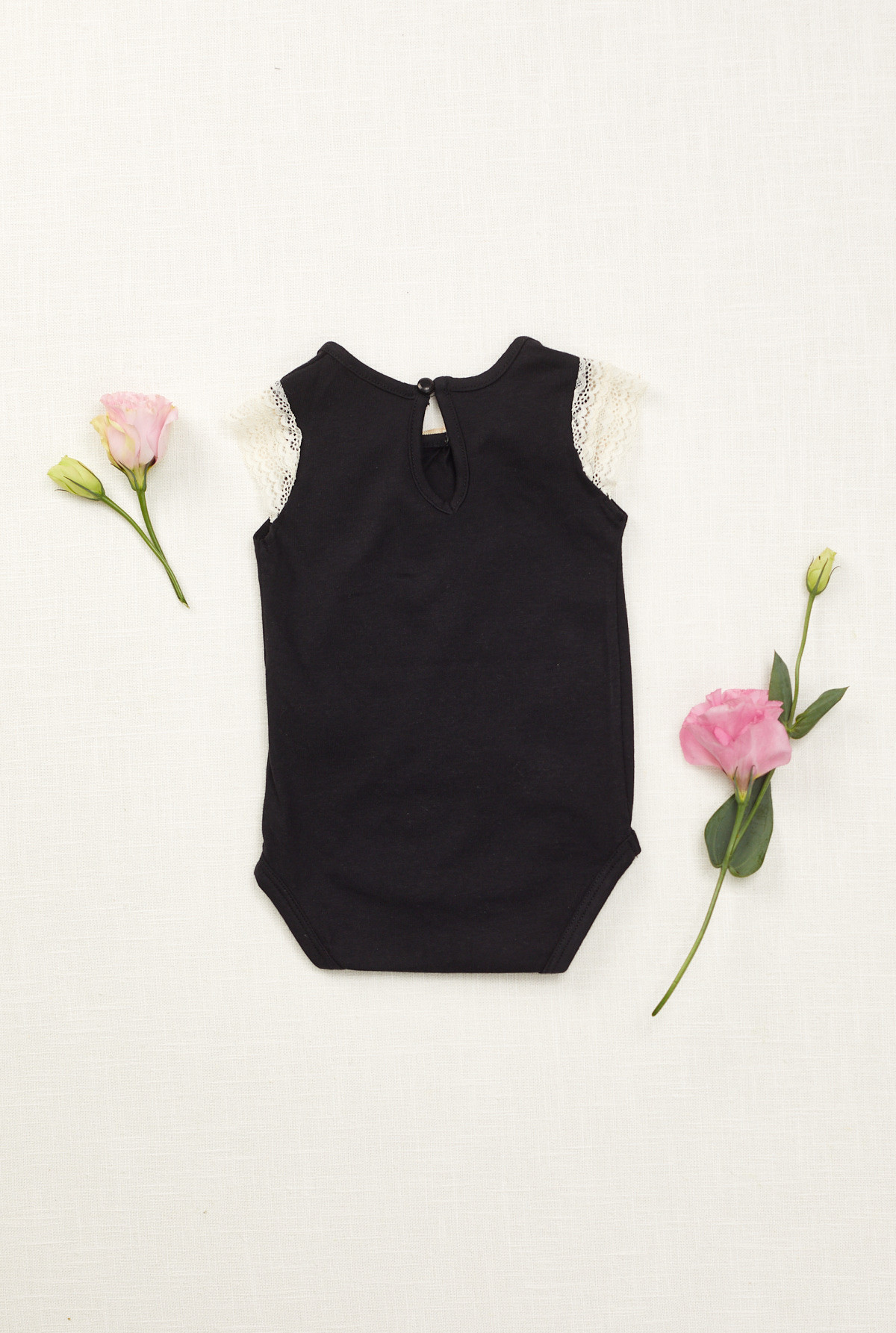 Body sin mangas terminado con doble volado de puntilla. Detalle de moño en escote delantero. Gota con botón en espalda y snaps al tono en entrepierna