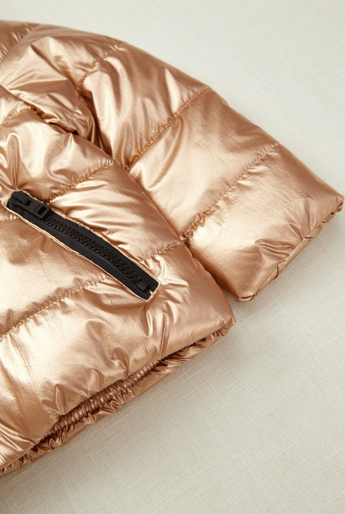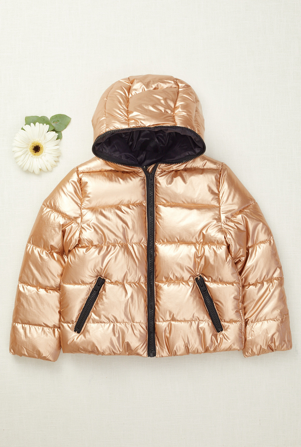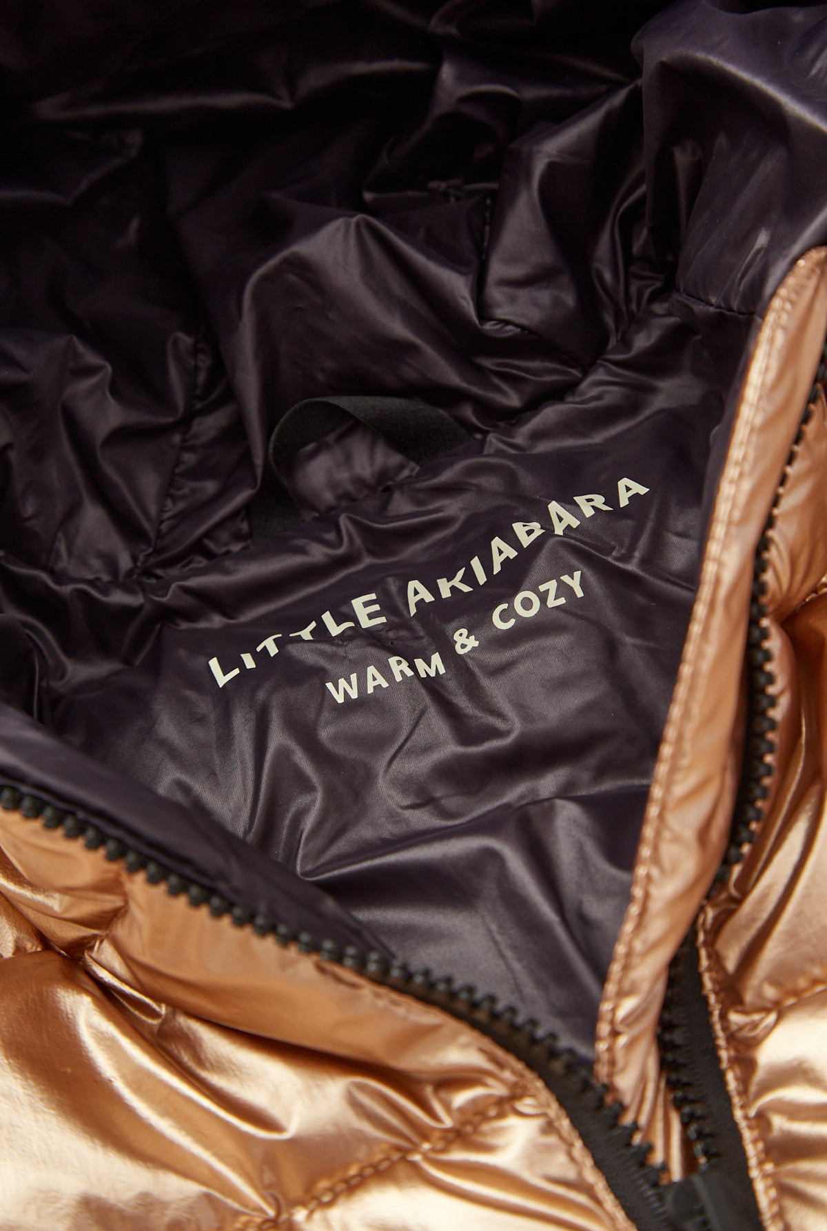 Campera ultralight con capucha, manga larga de nylon con relleno "warm & cozy" de fibra sustentable. Detalles contratono en vivos y cierres de nylon. Estampa en espalda