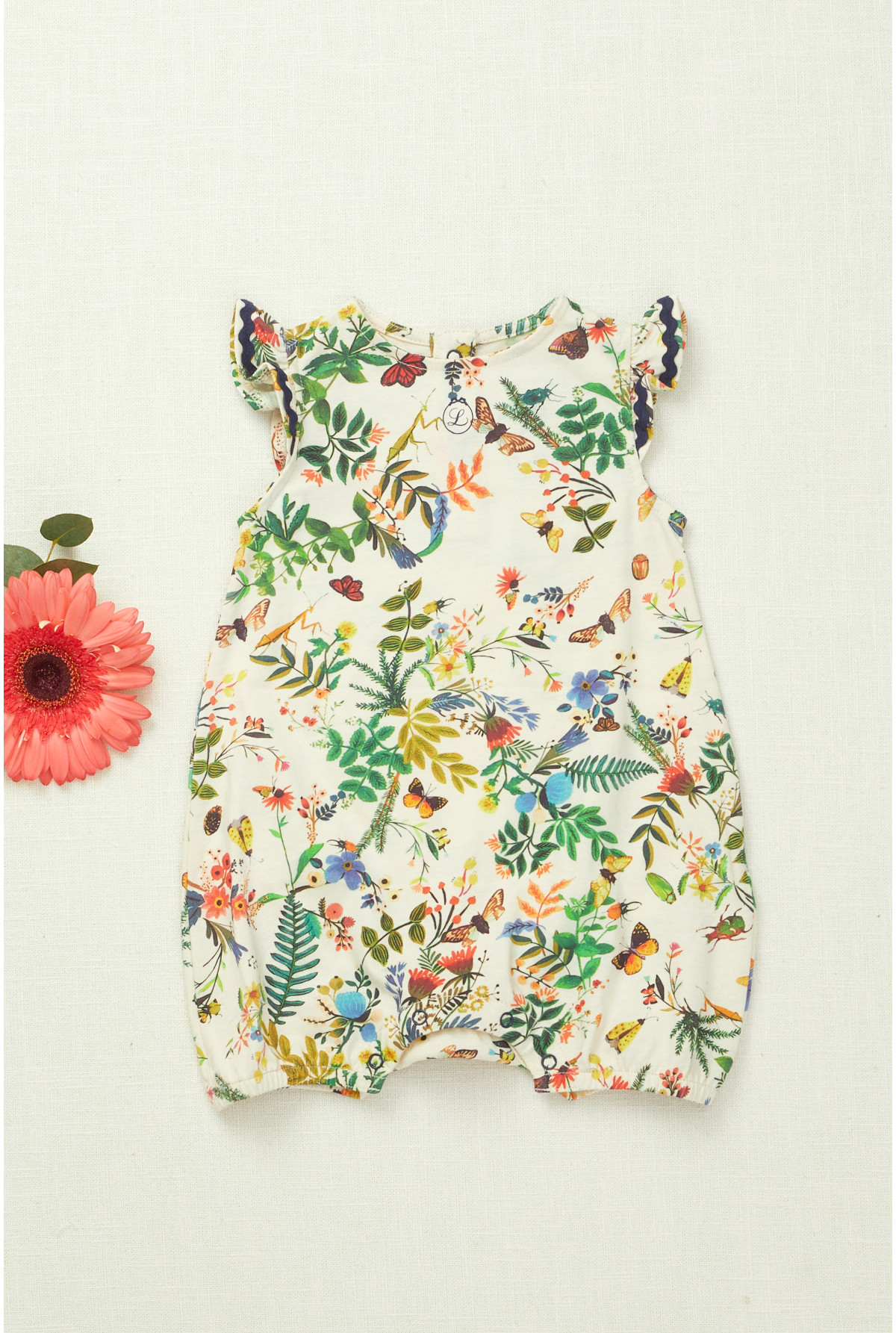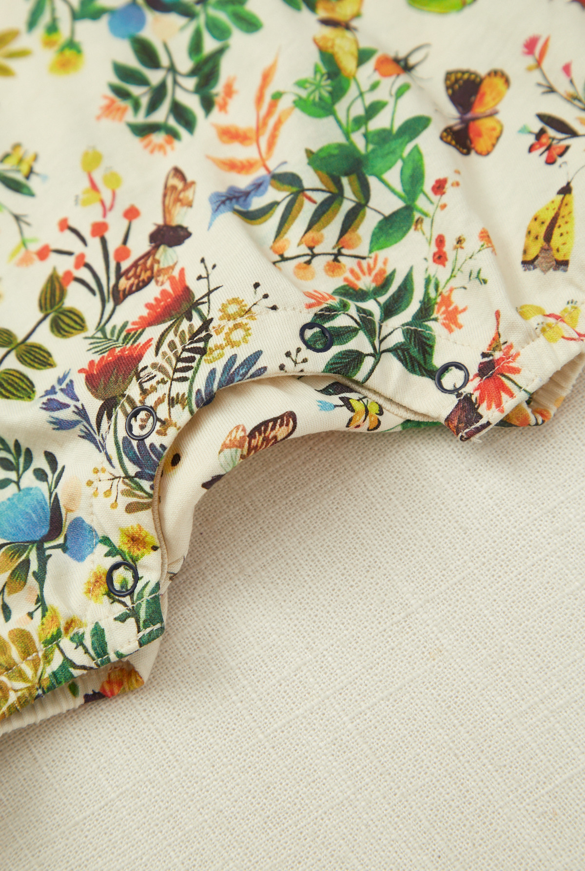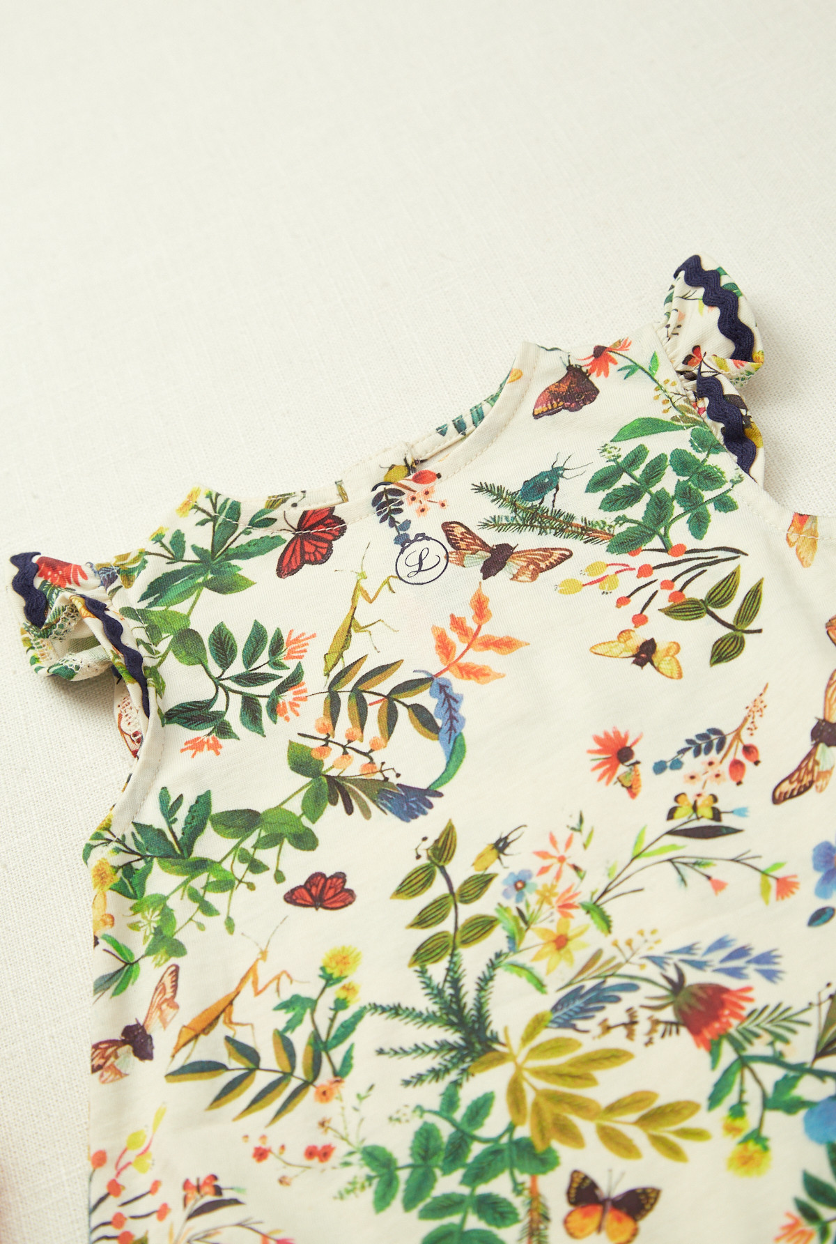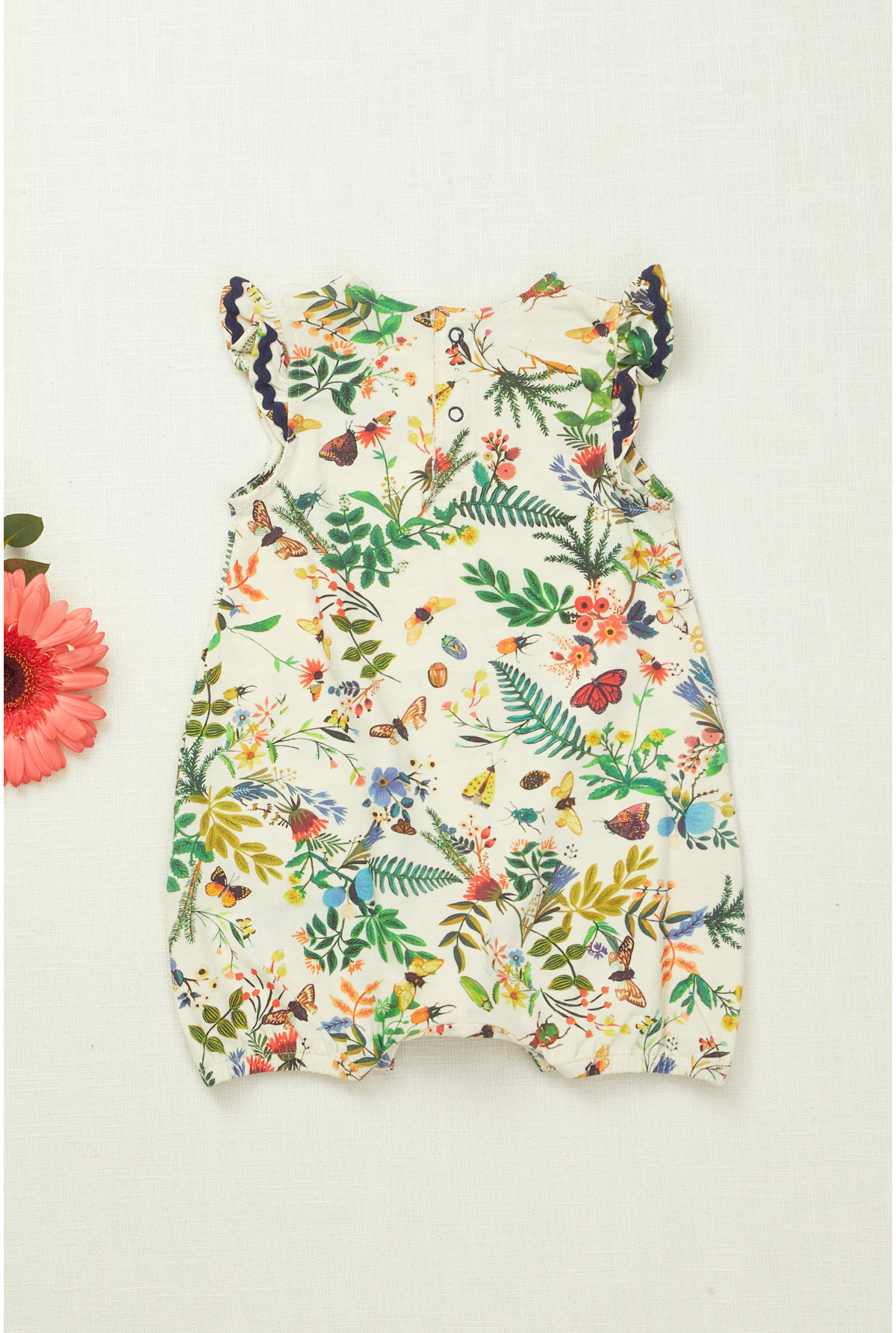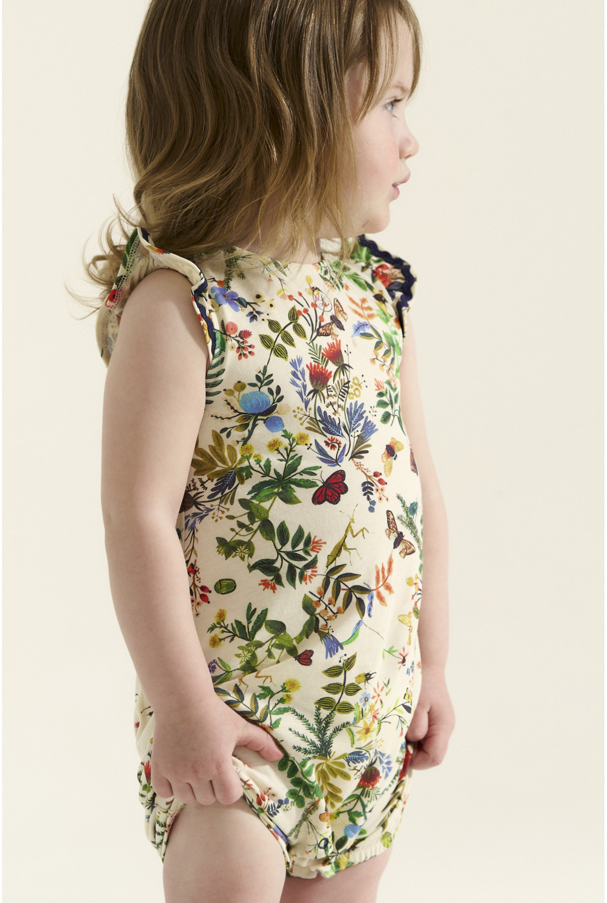 Enterito estampado. Es estilo musculosa, con detalle de volados en el hombro y tiene una cartera con snaps en el centro espalda para facilitar la colocación de la prenda. También tiene snaps en la entrepierna para abrir por completo la prenda.