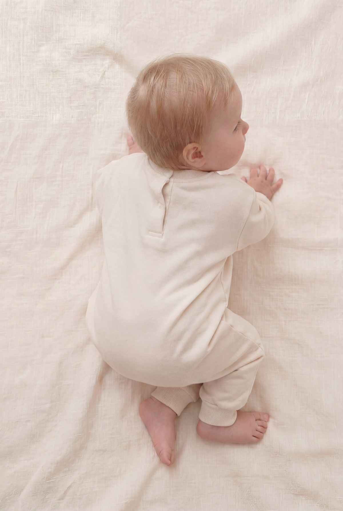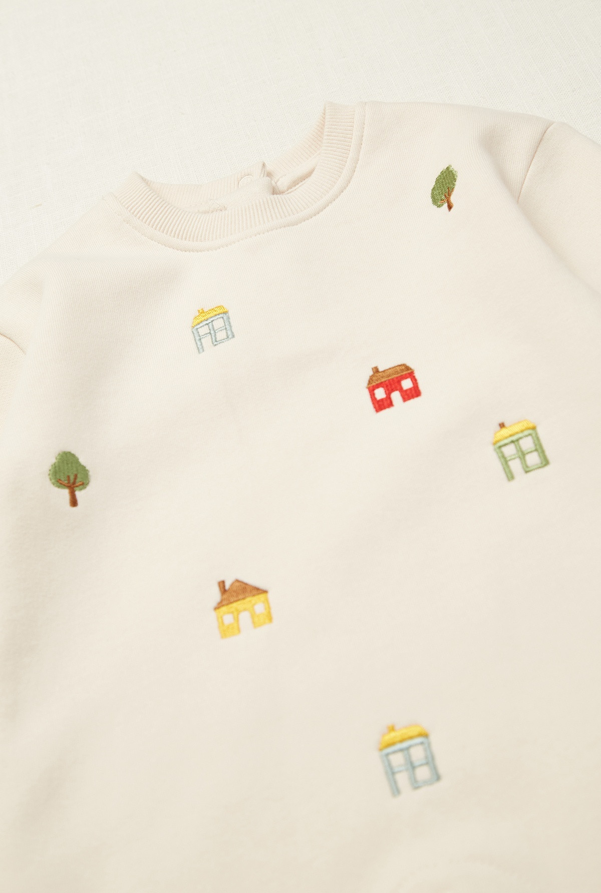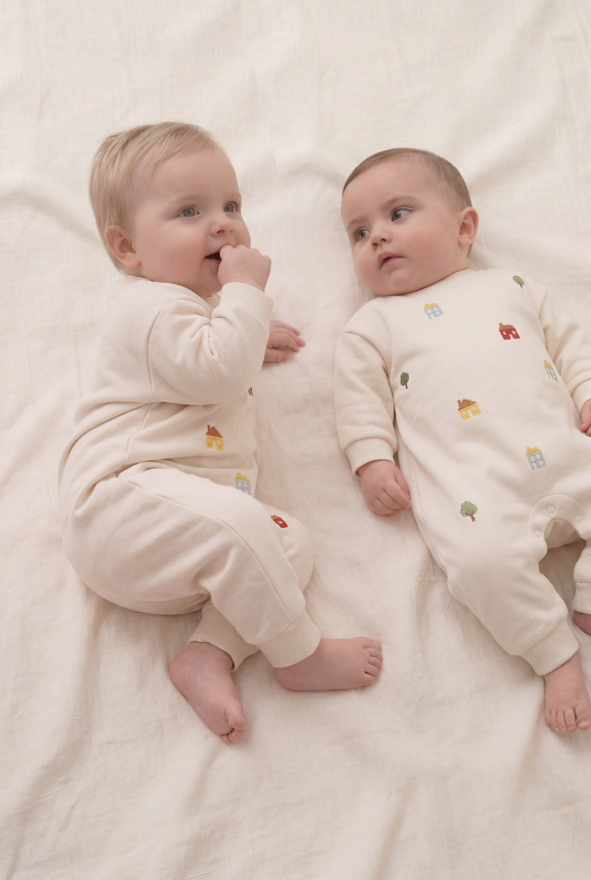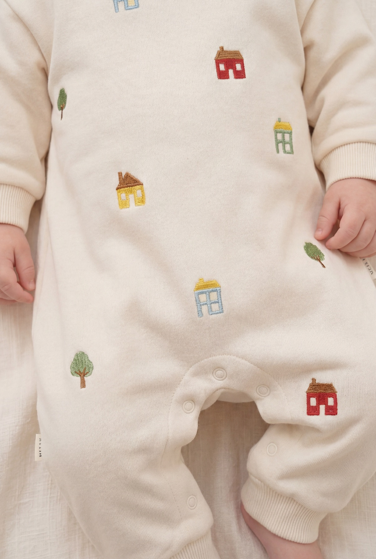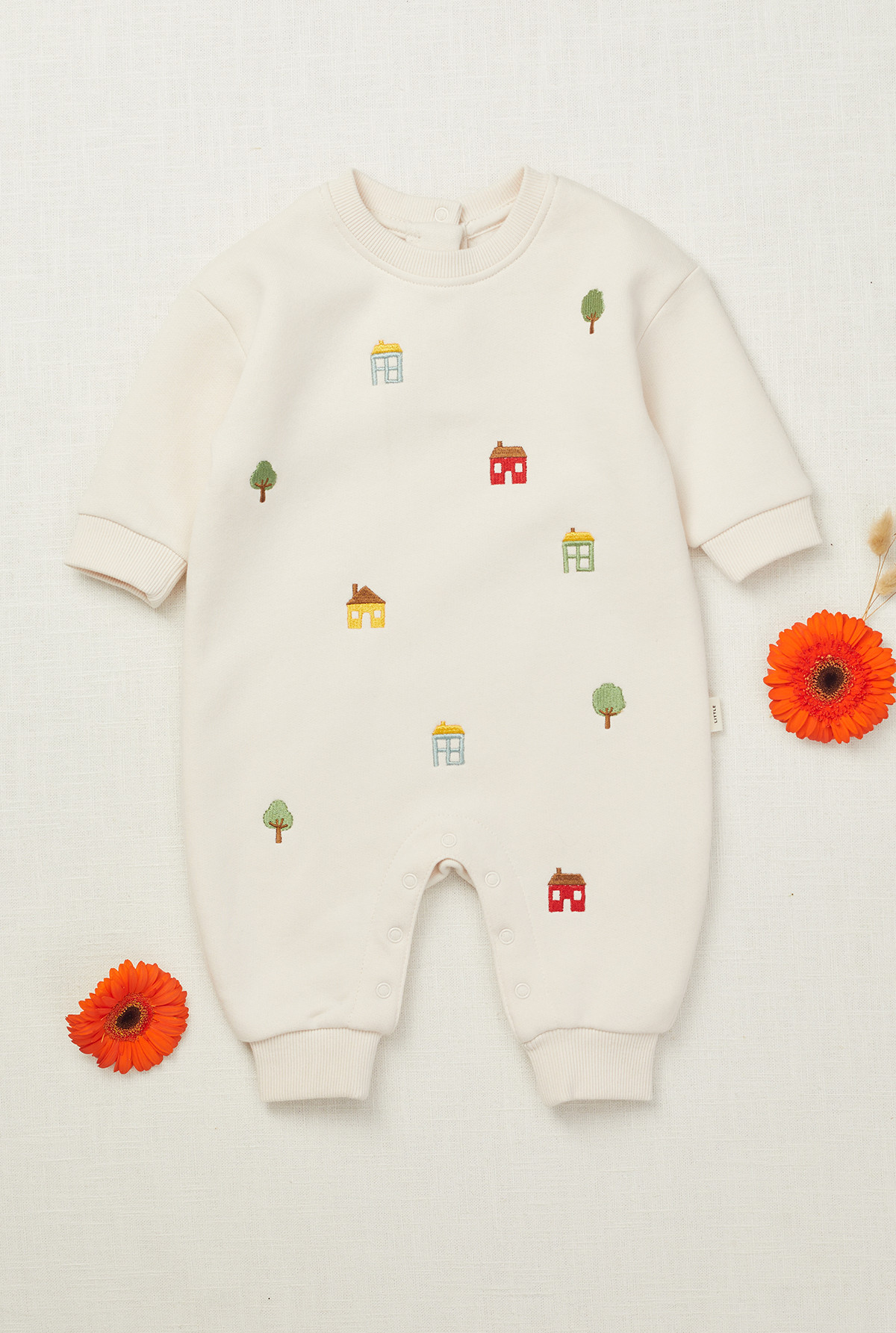 Enterito oversize bordado en el frente. De cuello redondo y con puños de rib para un mejor y cómodo ajuste. La entrepierna se abre mediante snaps lo que garantiza un fácil acceso.
