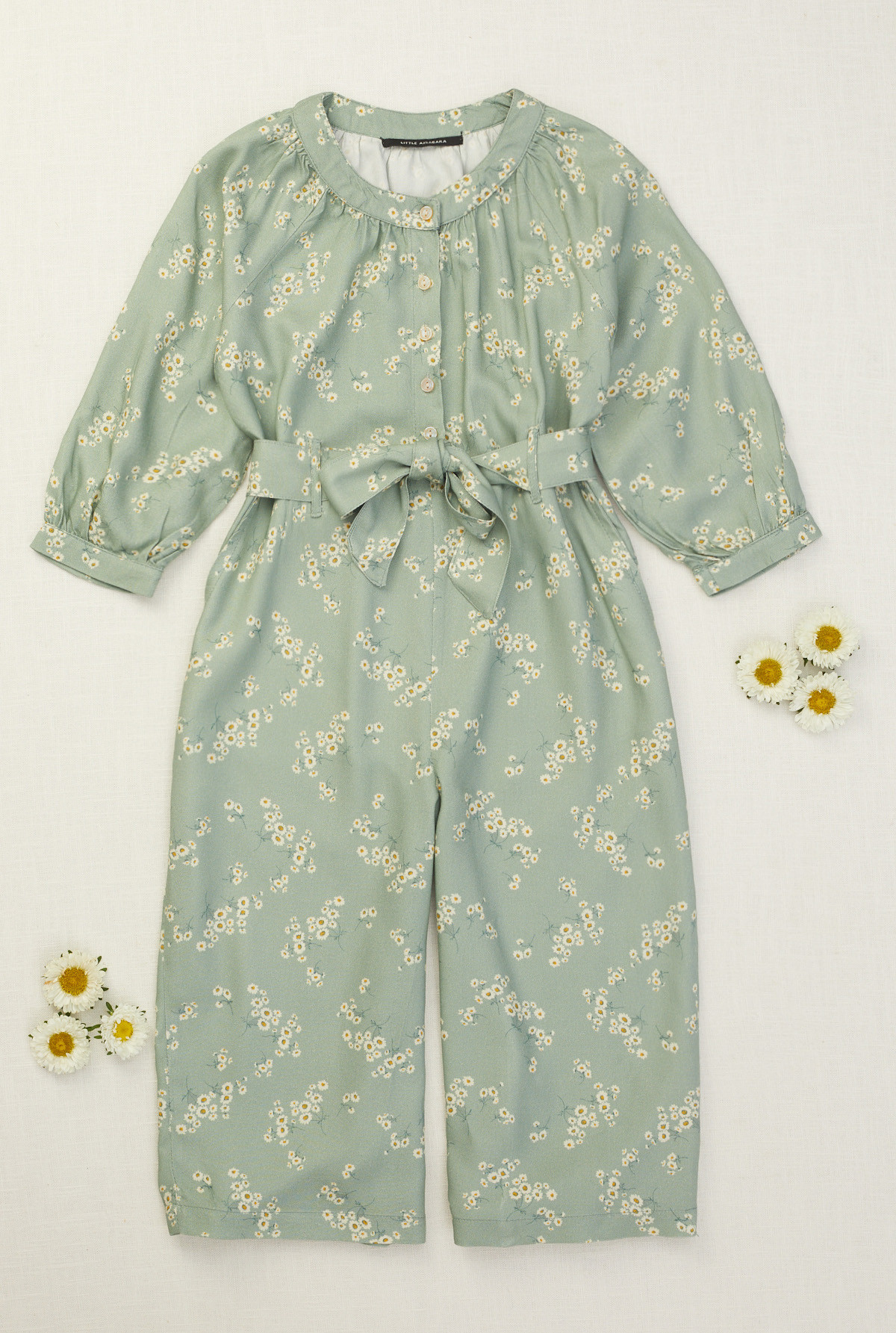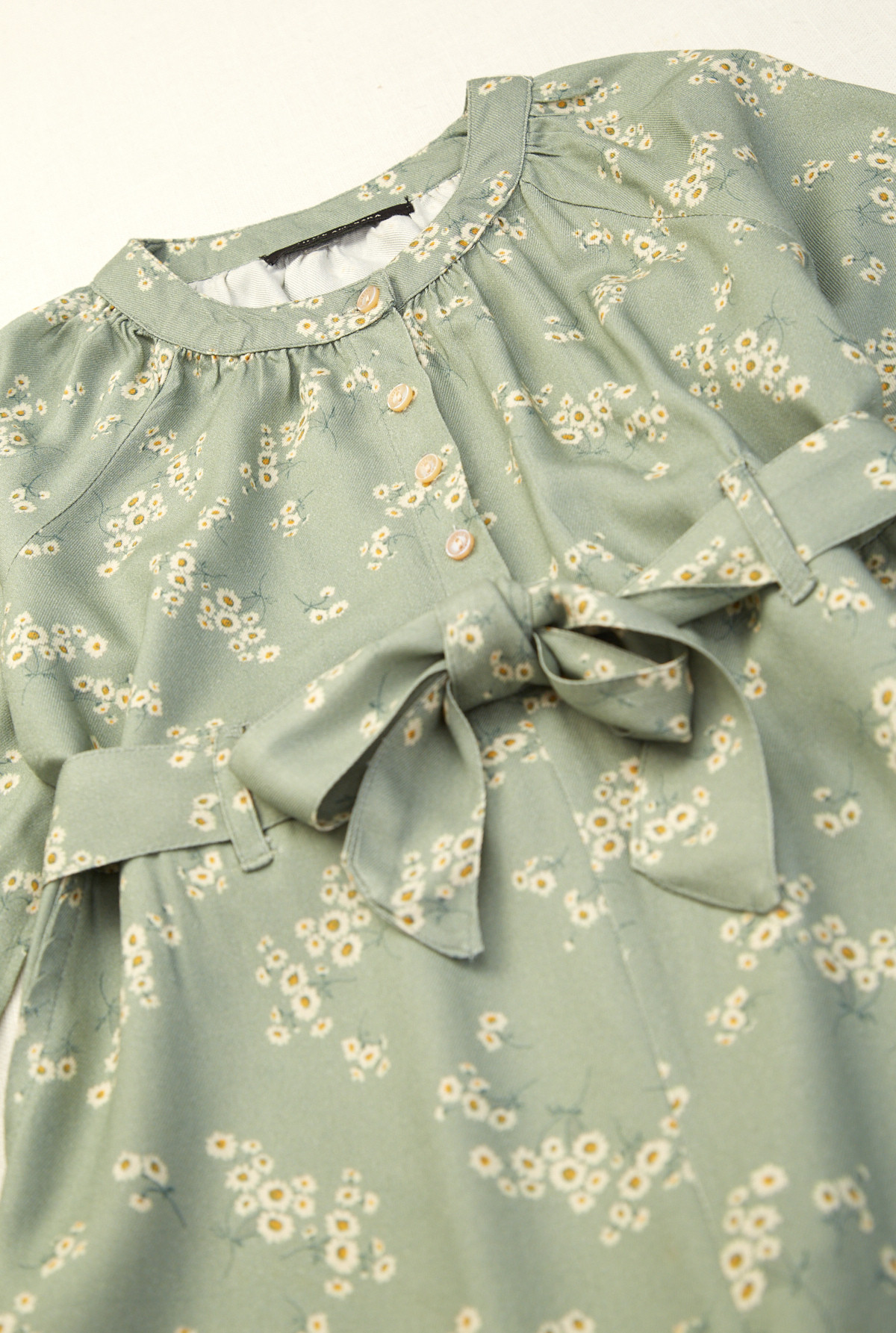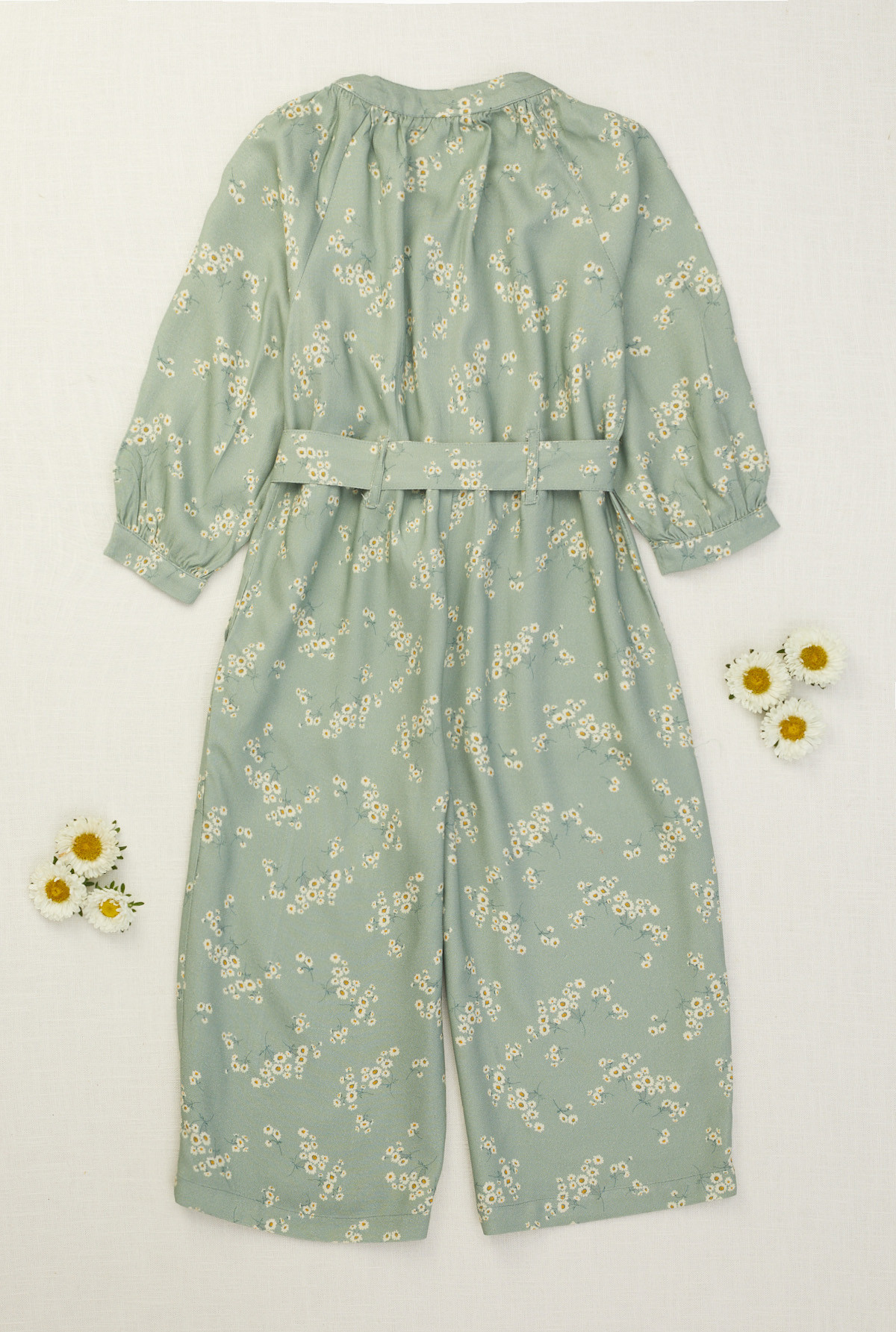 Mono largo con manga larga. Botones personalizados en cartera. Lazo en cintura para proporcionar ajuste y permite el armado de un moño. Cuello amplio con frunces alrededor.