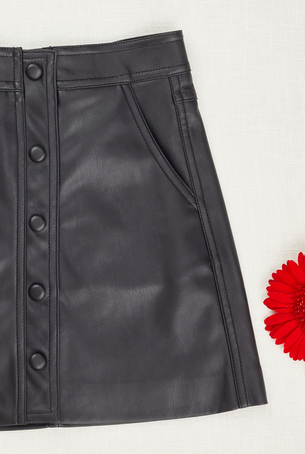 Falda en PU largo arriba de la rodilla, bolsillos rectos en el frente, cremallera frontal con botones a presión recubiertos en PU, elástico sobre la espalda en la cintura para un mejor calce y comodidad.
