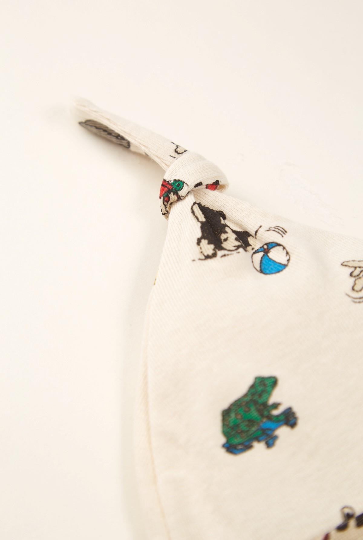 Gorro con nudo regulable, puño doble, en rib de algodón peruano estampado con animalitos.