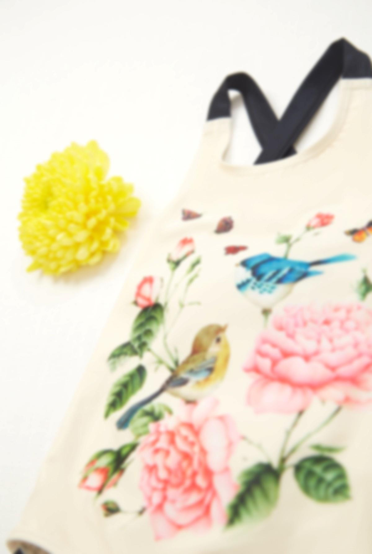 Enteriza forrada con estampa digital en delantero. Espalda abierta y breteles cruzados regulables a contratono.