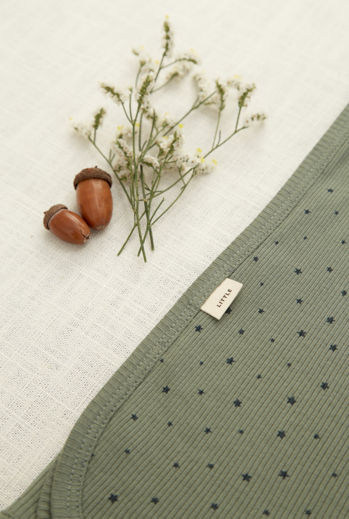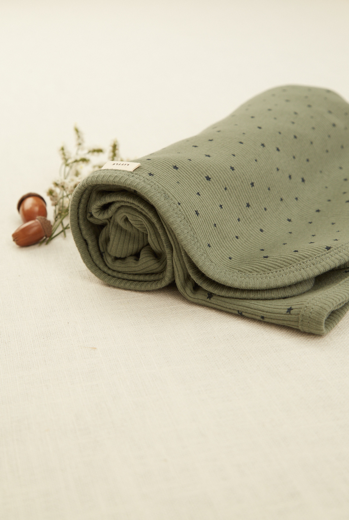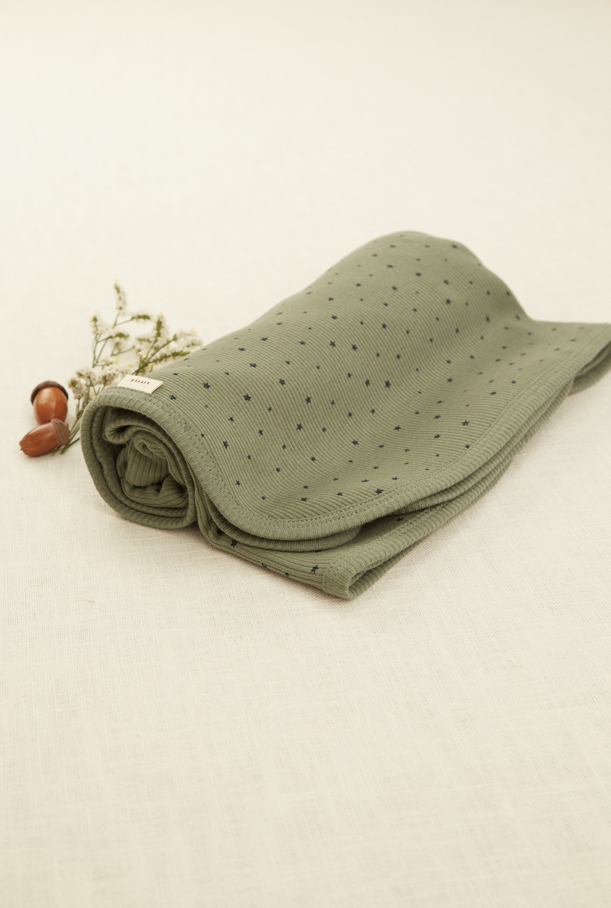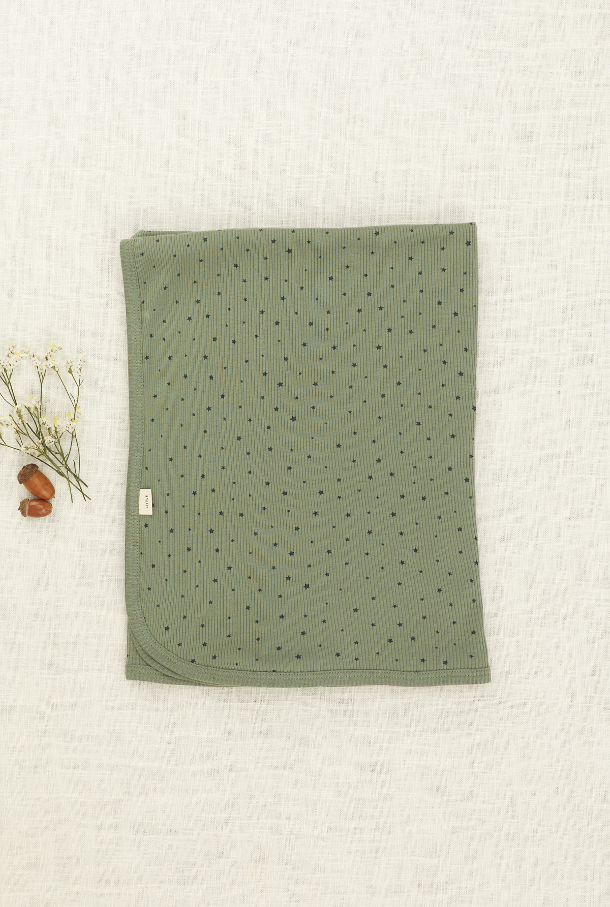 Manta doble en algodón rib peruano estampada con motivo de estrellas . La terminación de la misma es con bordador.