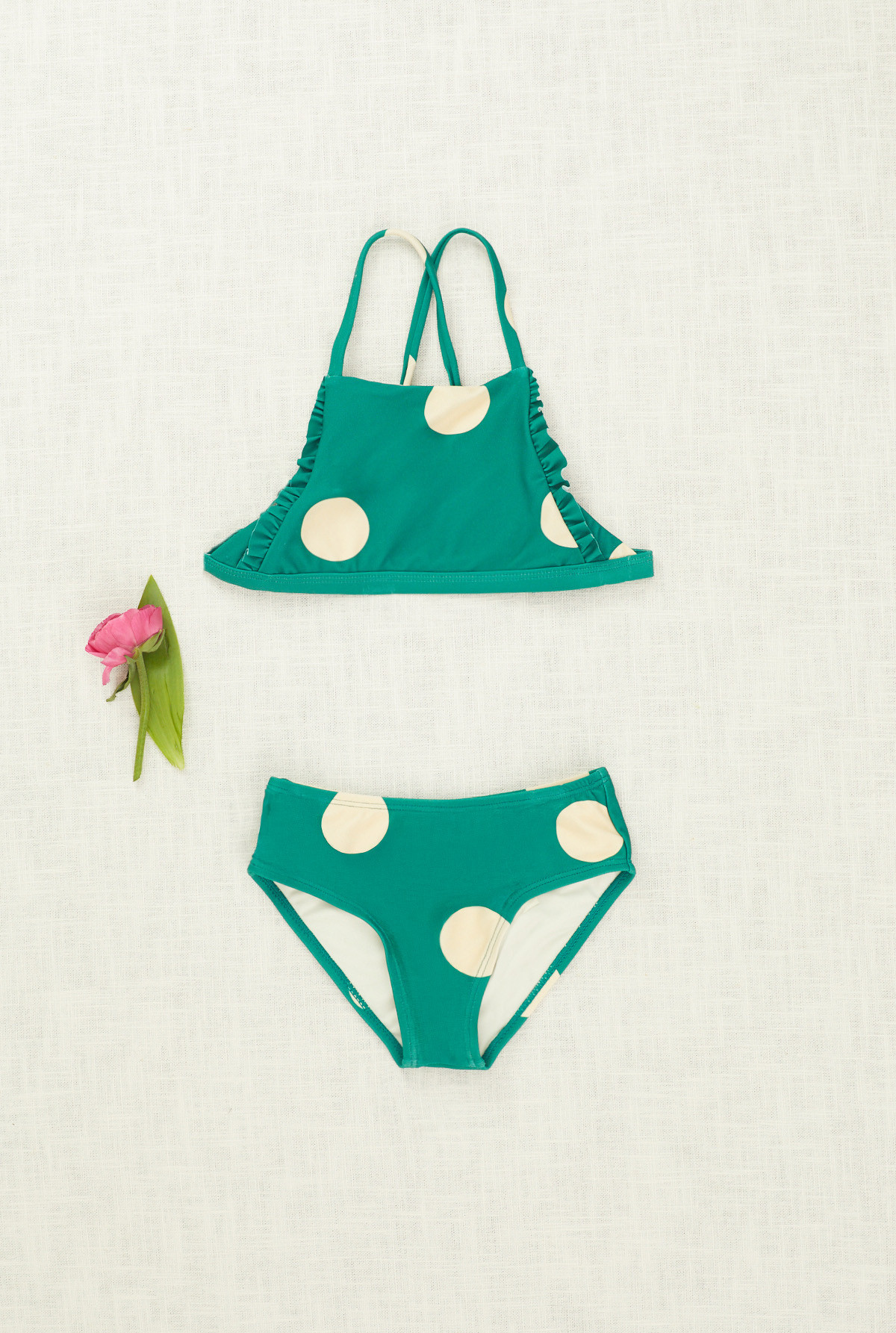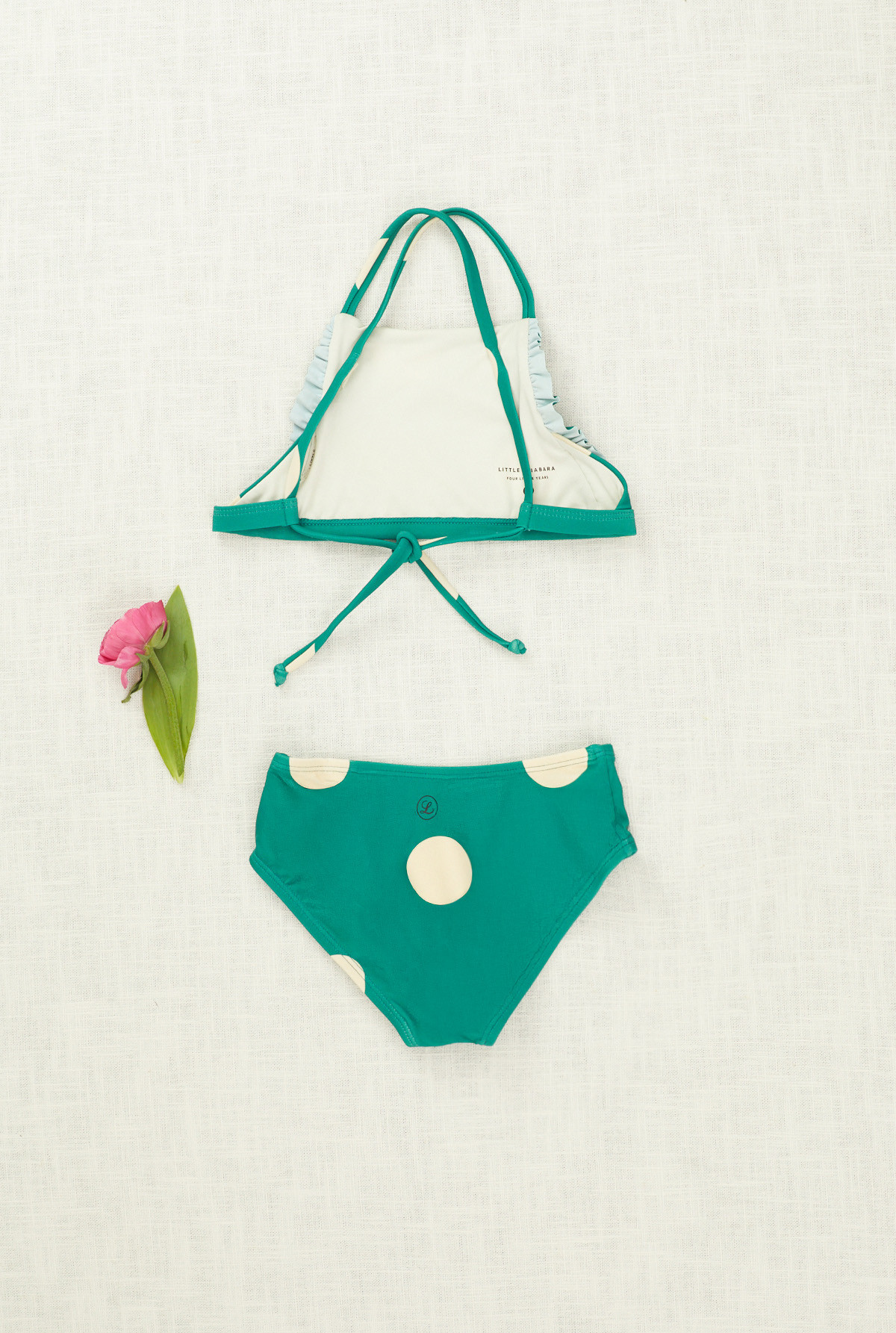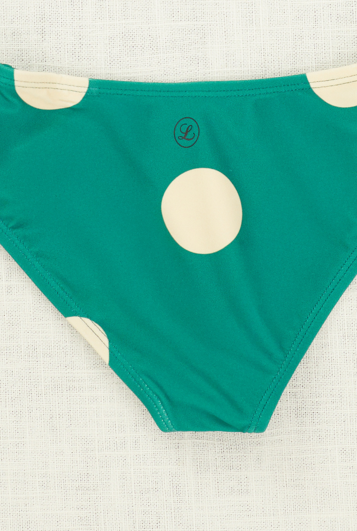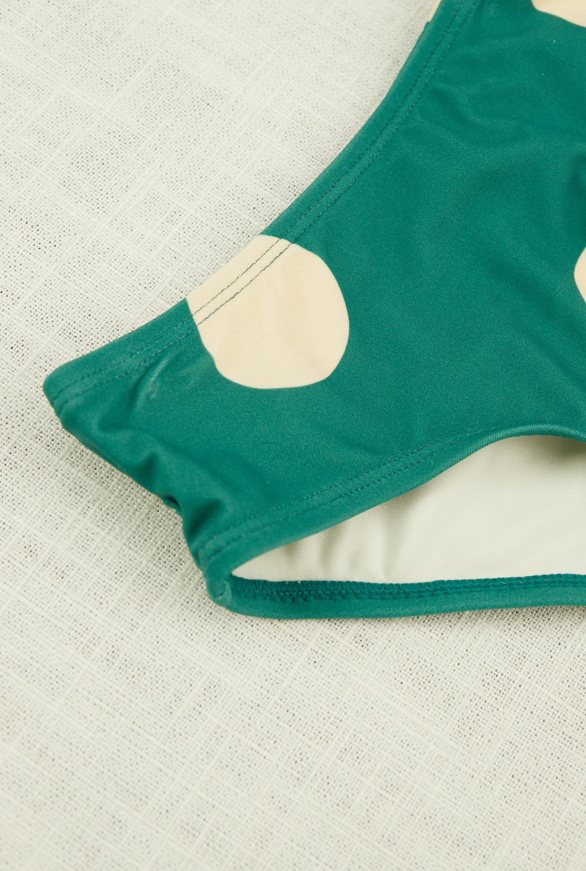Bikini forrada de nylon elastizado. Detalle de volados en terminaciones, Estampado con lunares oversize