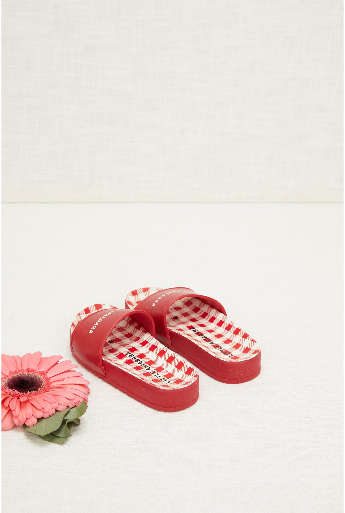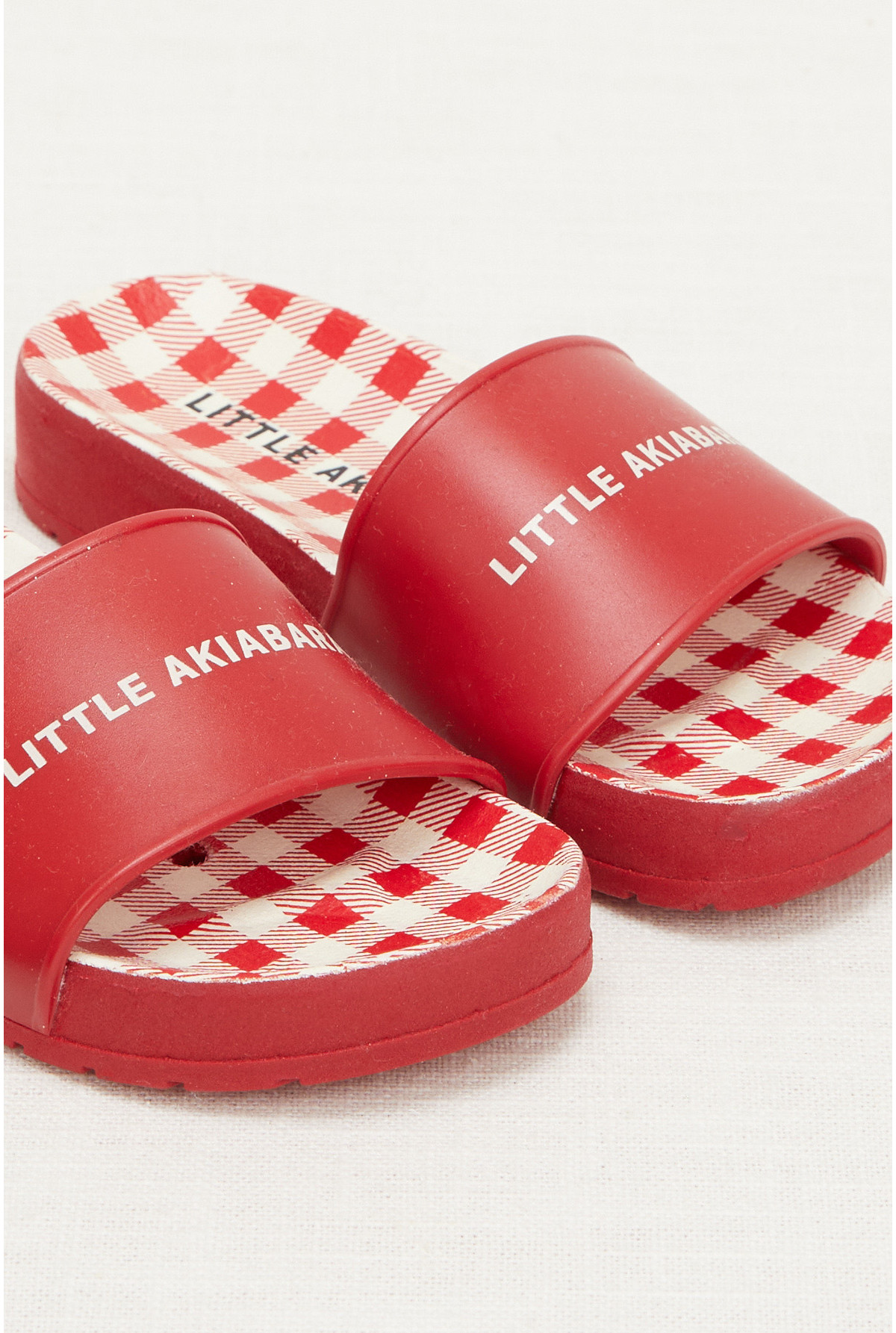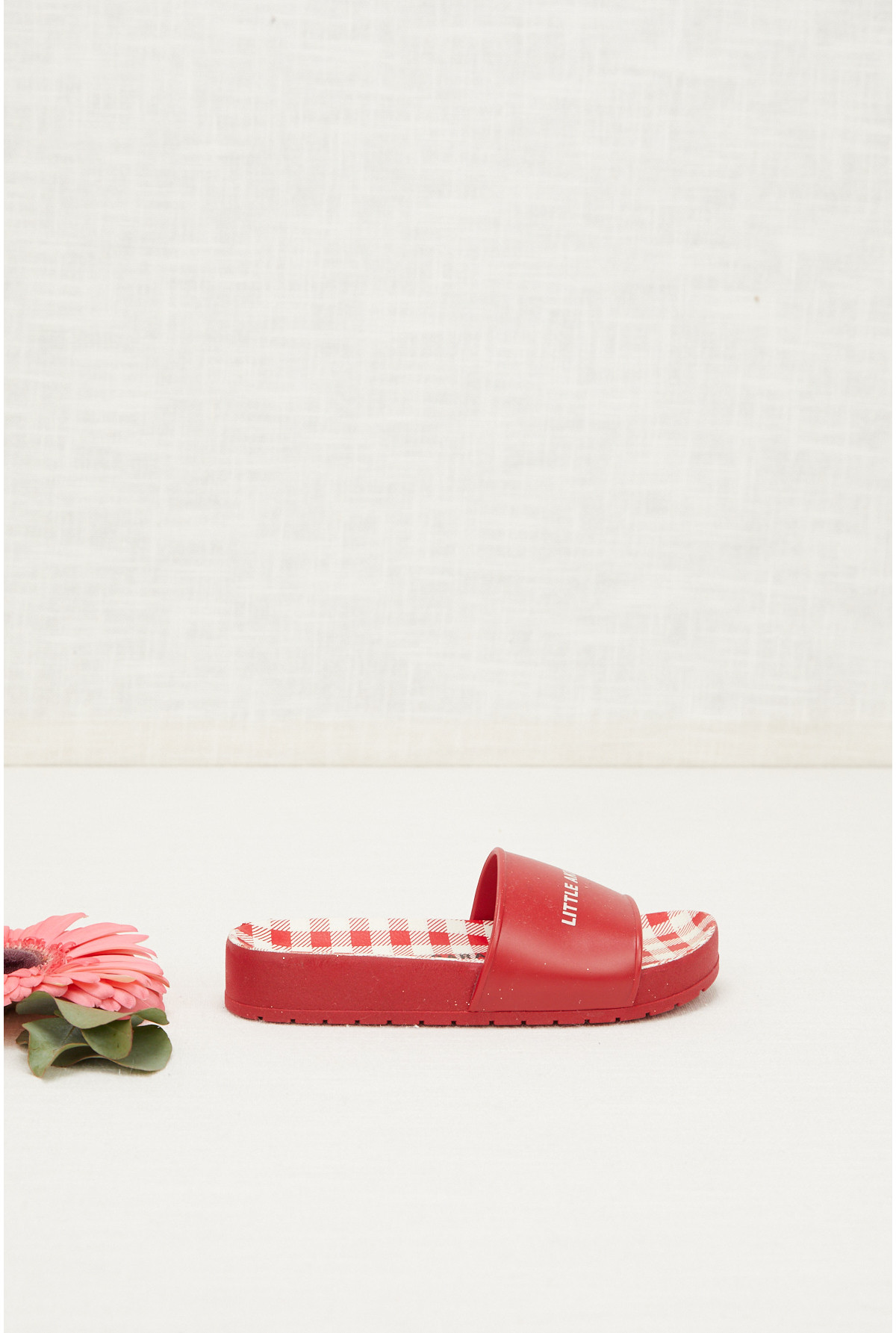 Sandalia tipo ojota de goma con una tira ancha superior para su agarre. Estampado tranfer de marca.