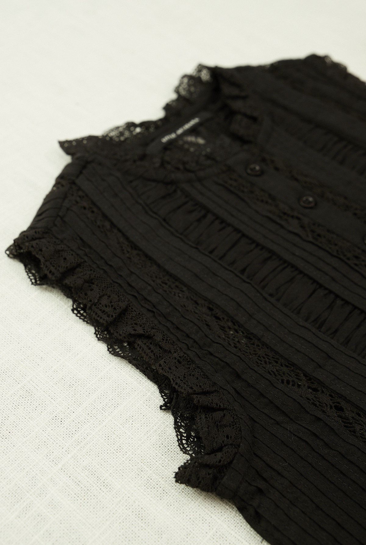 Musculosa corta con cartera delantera. Tiene detalles de tablas y puntillas