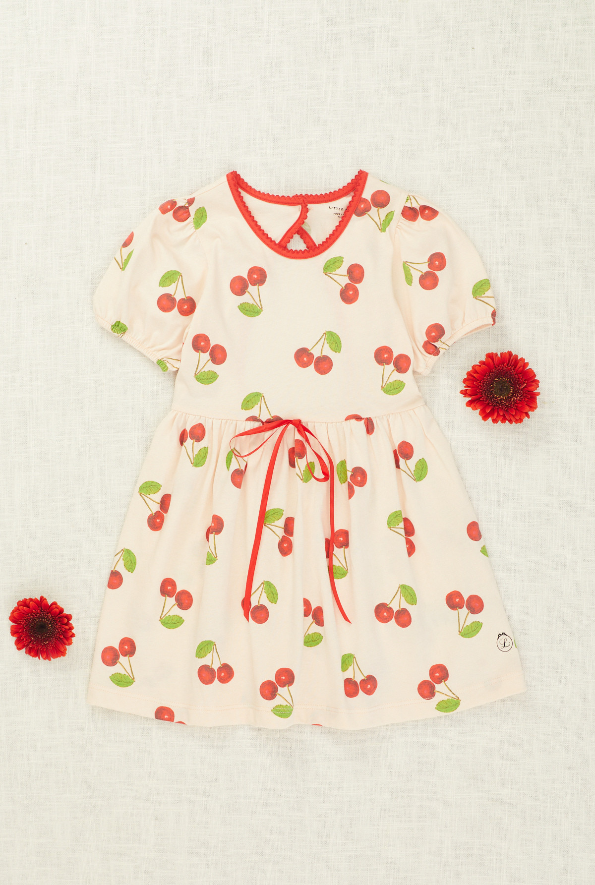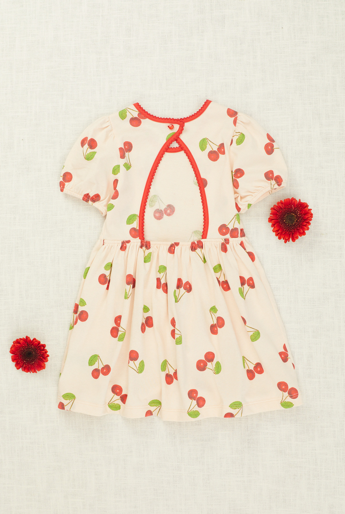Vestido estampado con cuello redondo, ajustado en la parte superior y con vuelo en la parte inferior. La espalda se abre para facilitar el acceso y el ajuste es mediante botón en el escote y elástico en la cintura. Tiene un moño con pompones decorativo en el centro espalda. La espalda queda semi descubierta.