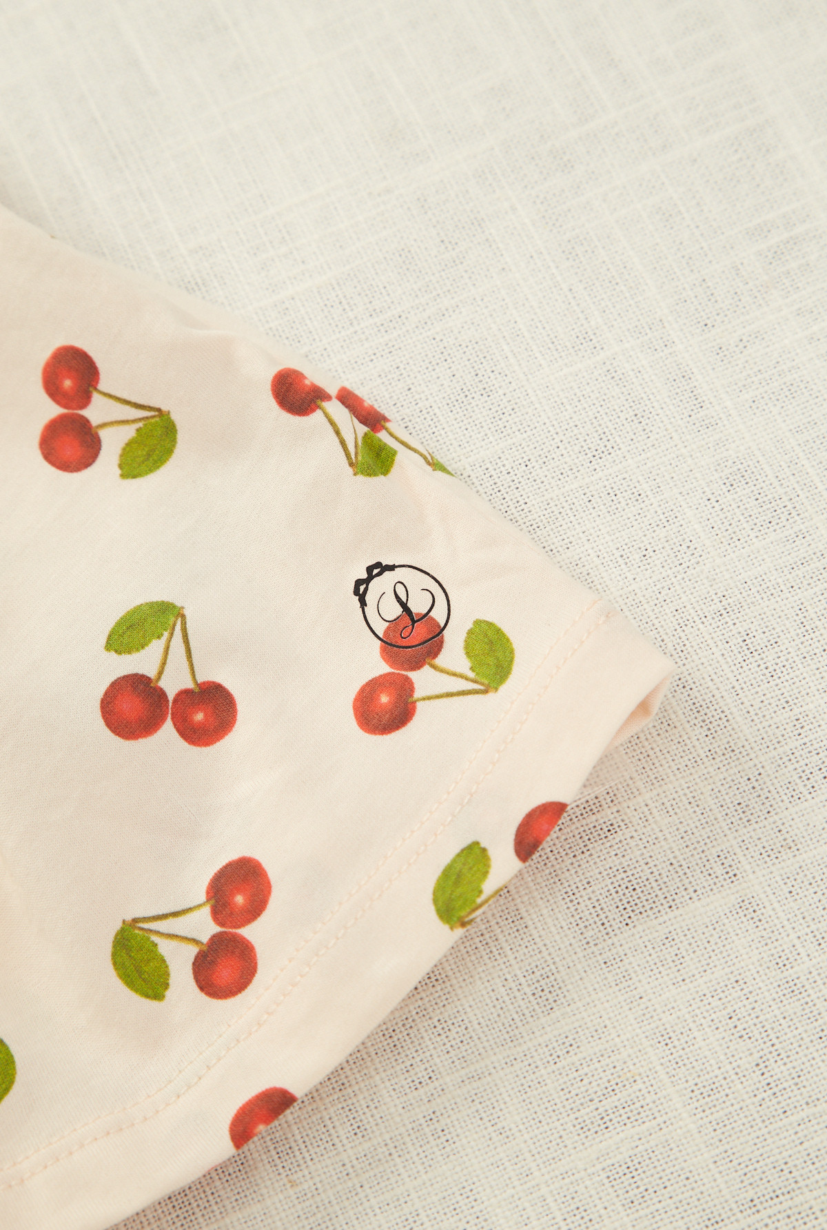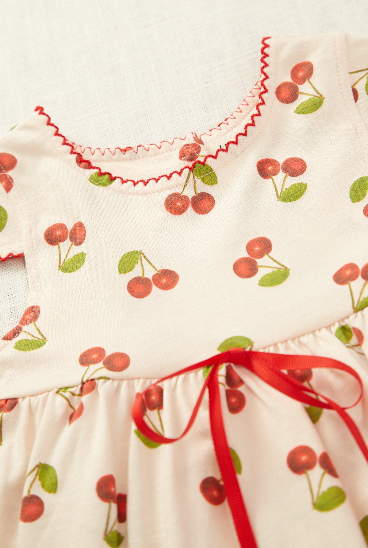 Vestido estampado con cuello redondo, ajustado en la parte superior y con vuelo en la parte inferior. La espalda se abre para facilitar el acceso y el ajuste es mediante botón en el escote y elástico en la cintura. Tiene un moño con pompones decorativo en el centro espalda. La espalda queda semi descubierta.