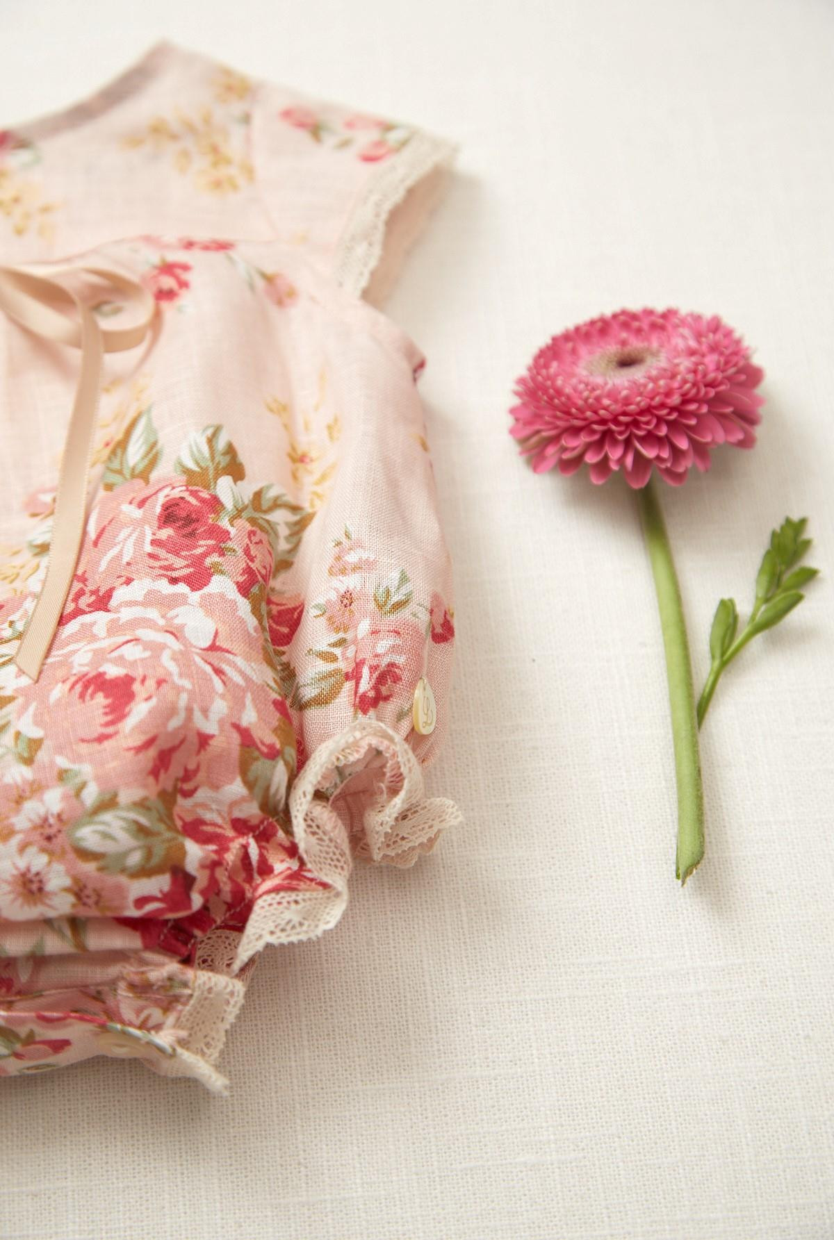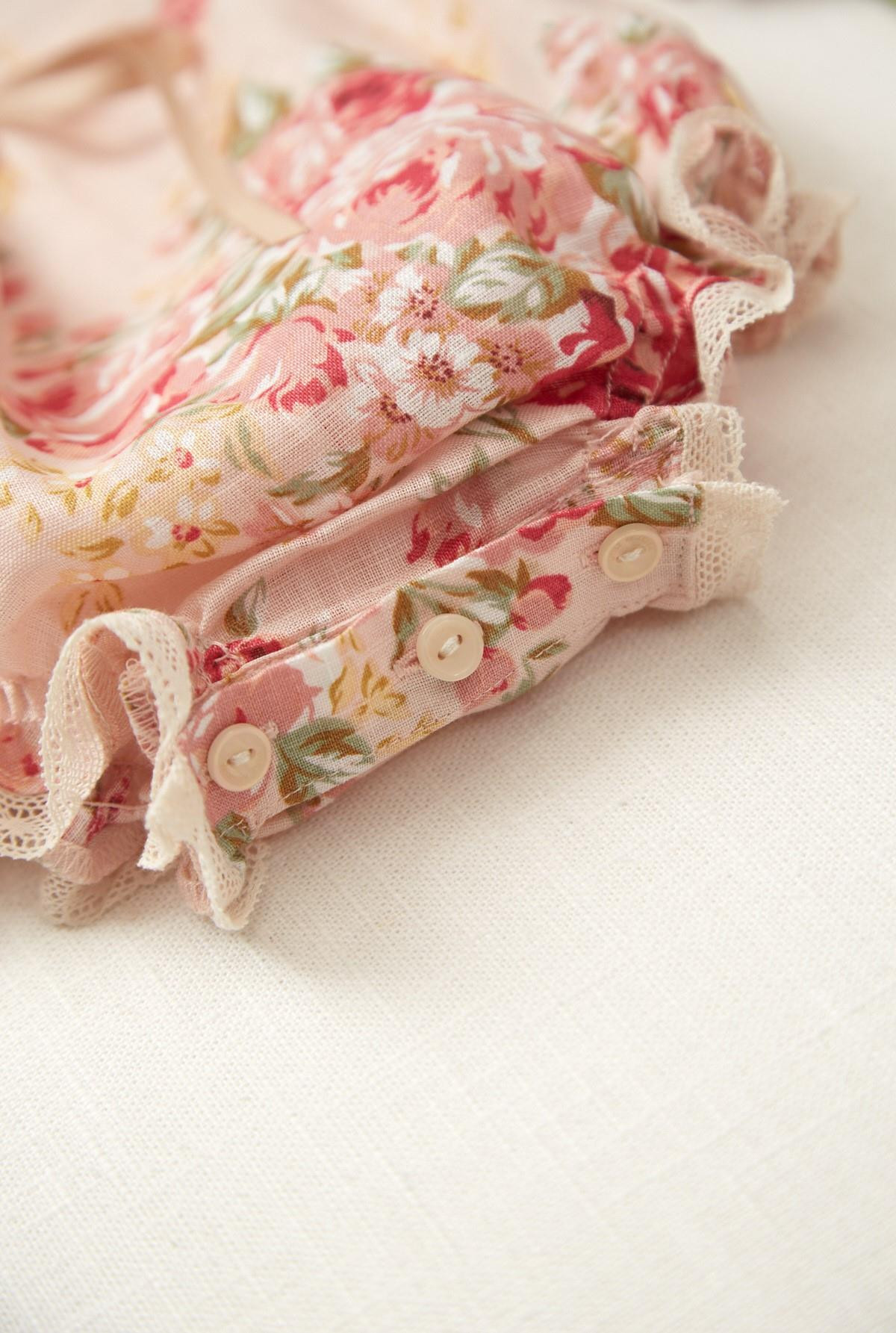 Body manga corta de lino estampado con rosas victorianas. Detalle de puntillas de algodón y voladitos en las piernas. Cartera con botones en espalda y entrepierna.