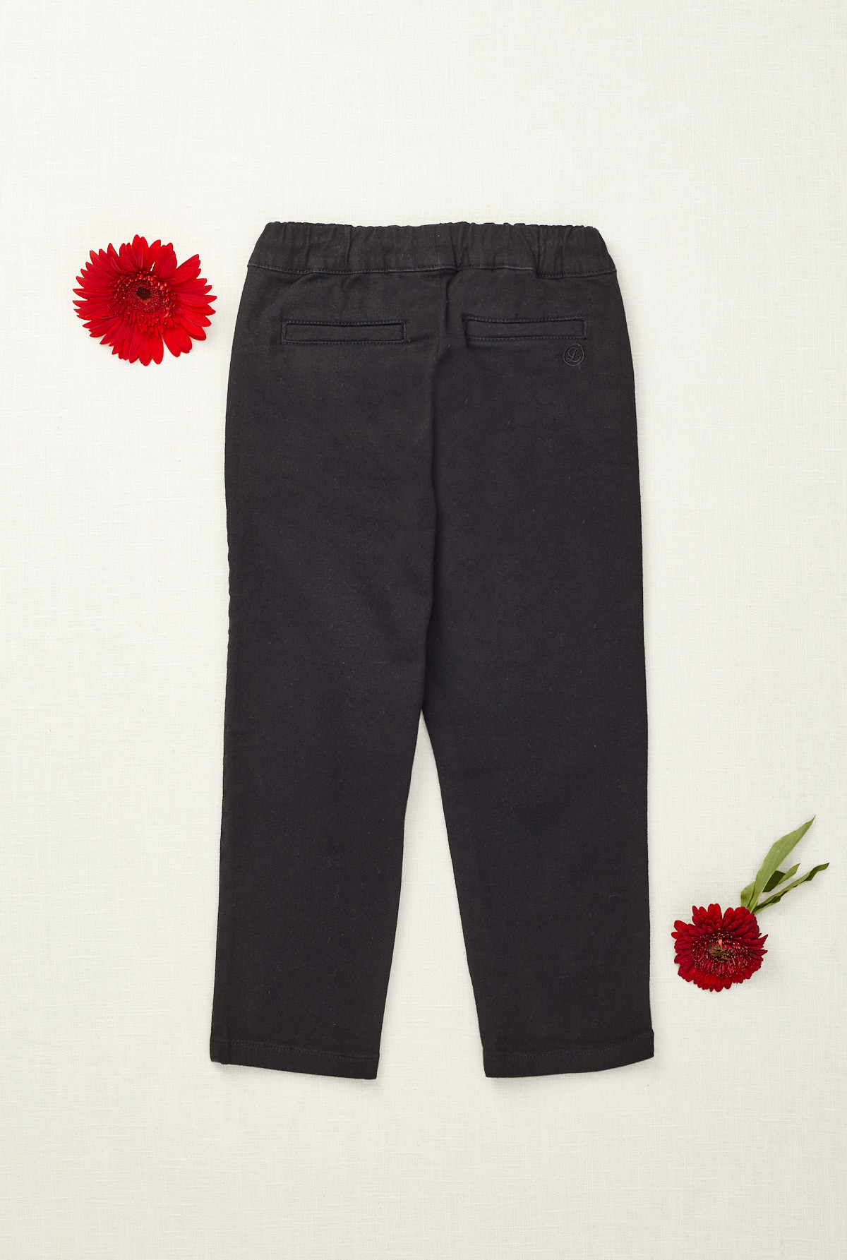 Pantalón de gabardina de algodón con elastano y elástico en la cintura para mayor comodidad y calce. Con cordones de algodón color crudo y terminación con puntera de goma.