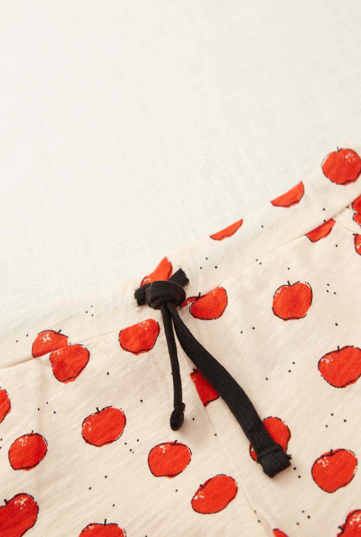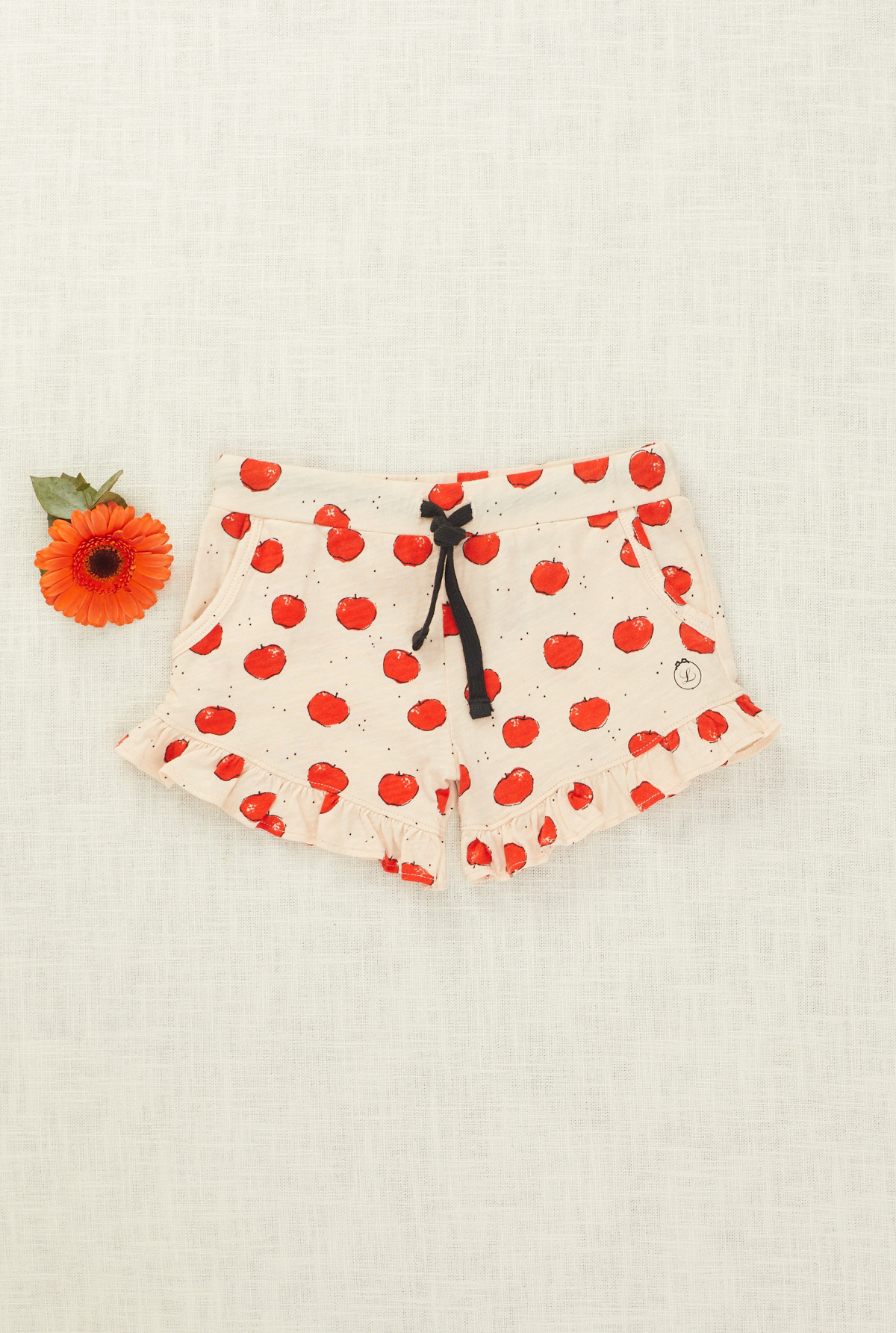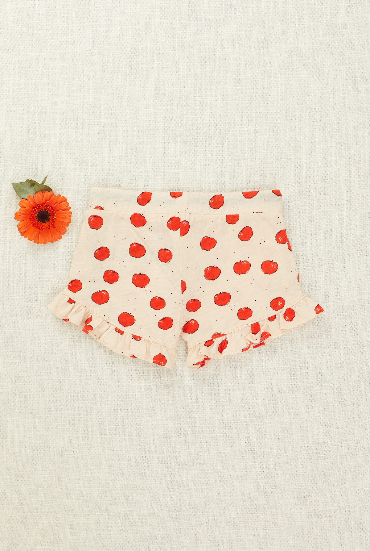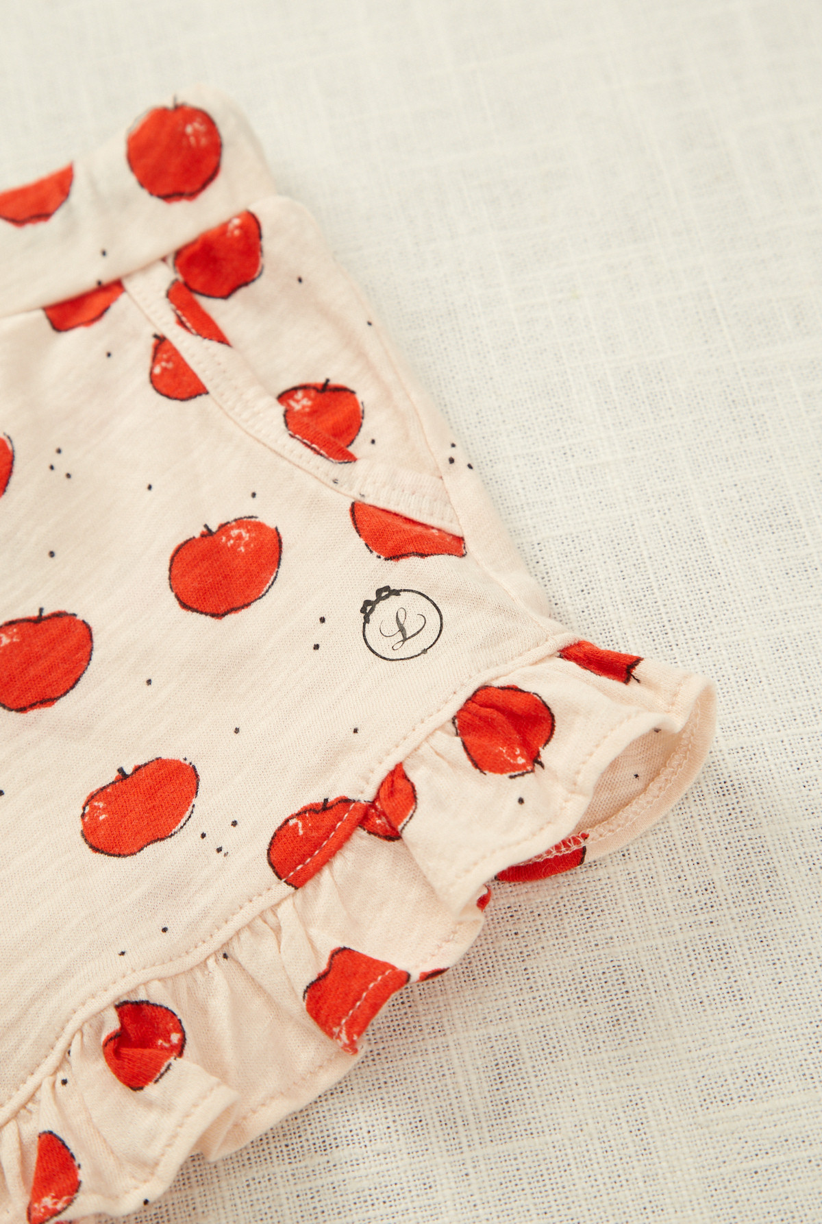 Short estampado con cintura elastizada y la terminación de las piernas con volados. también tiene un moño decorativo en el centro delantero, sobre la cintura y bolsillos en ambos costados de la prenda.