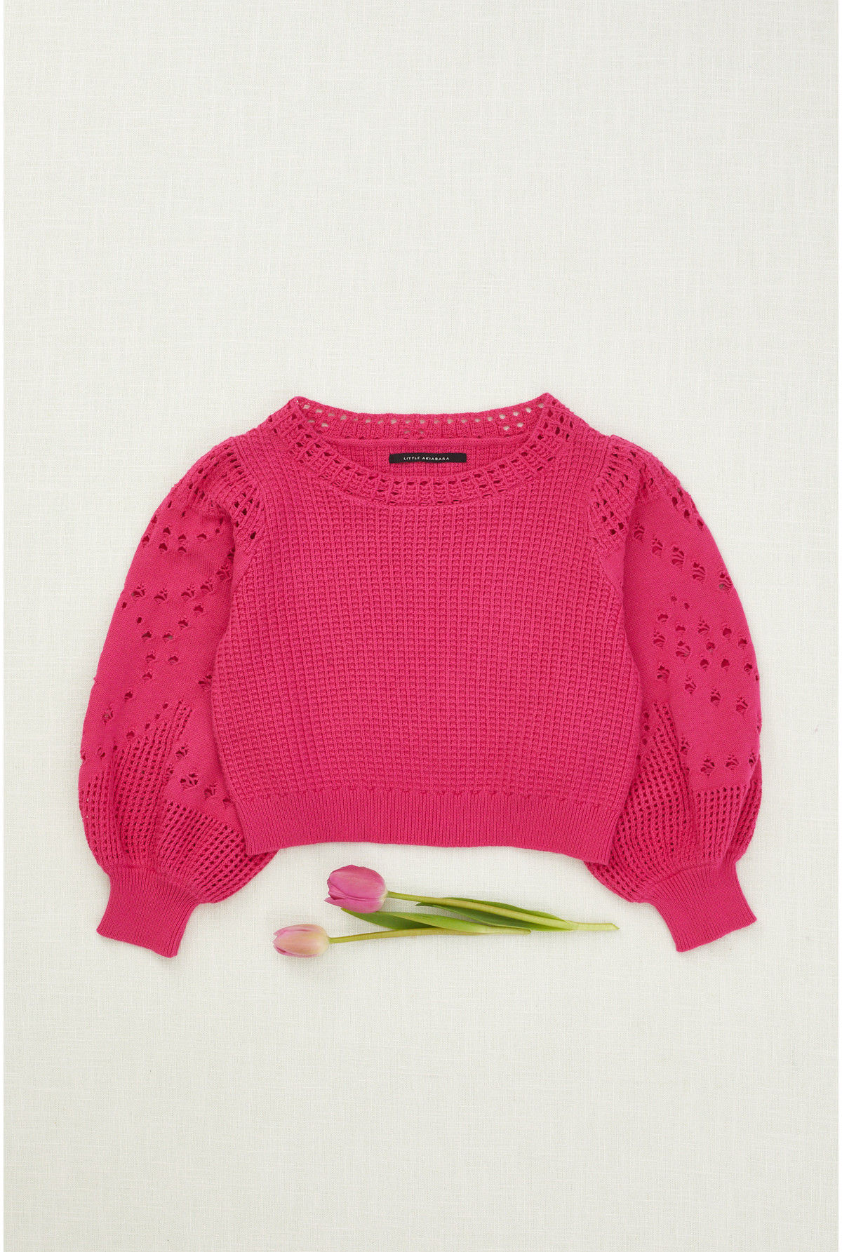 Sweater con cuello redondo y manga larga con detalle de tejido en crochet. Calce amplio
