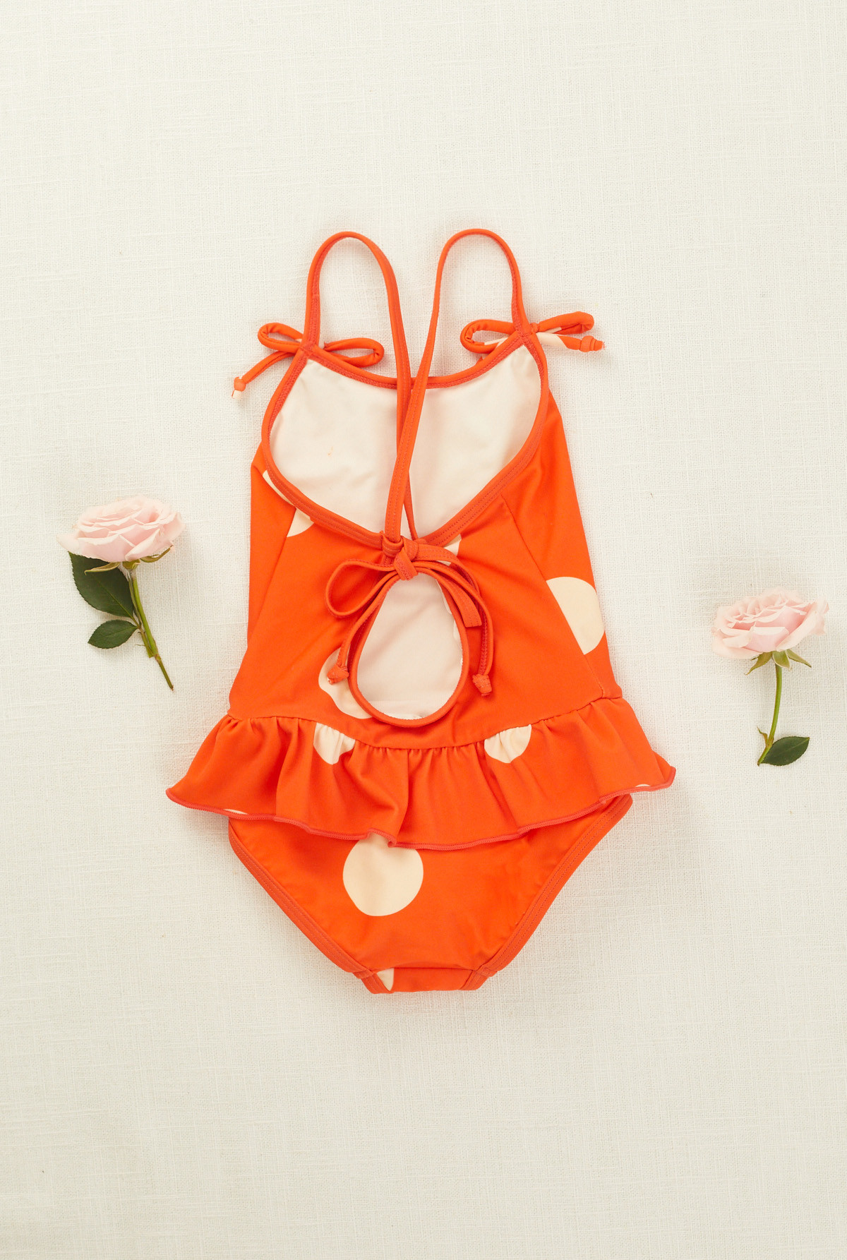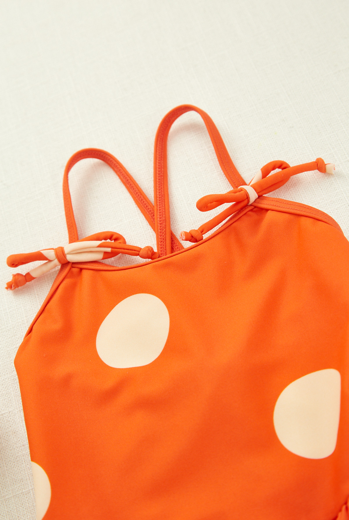 Enteriza con faldon fruncido, forrada de nylon elastizado. Estampado con lunares oversize