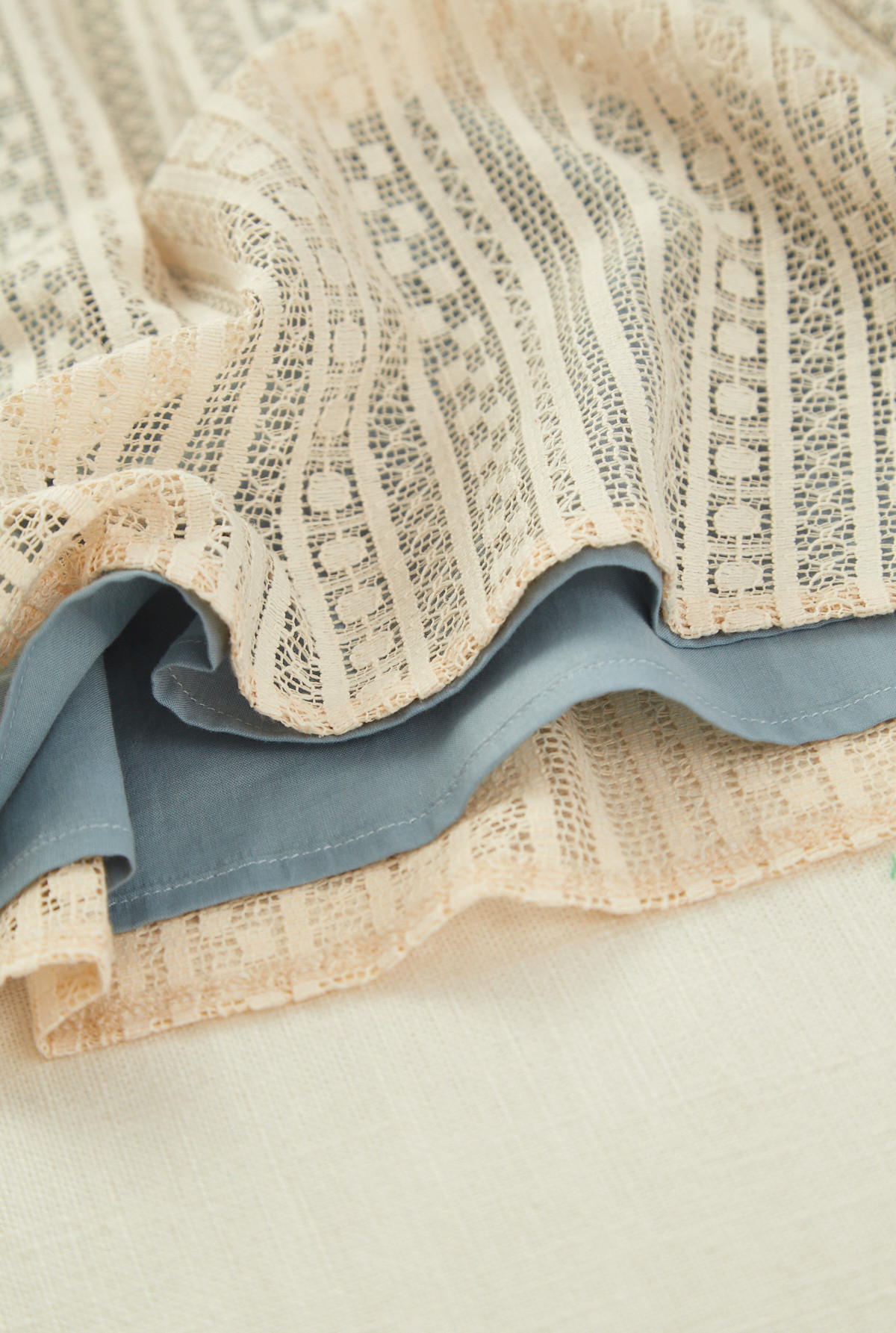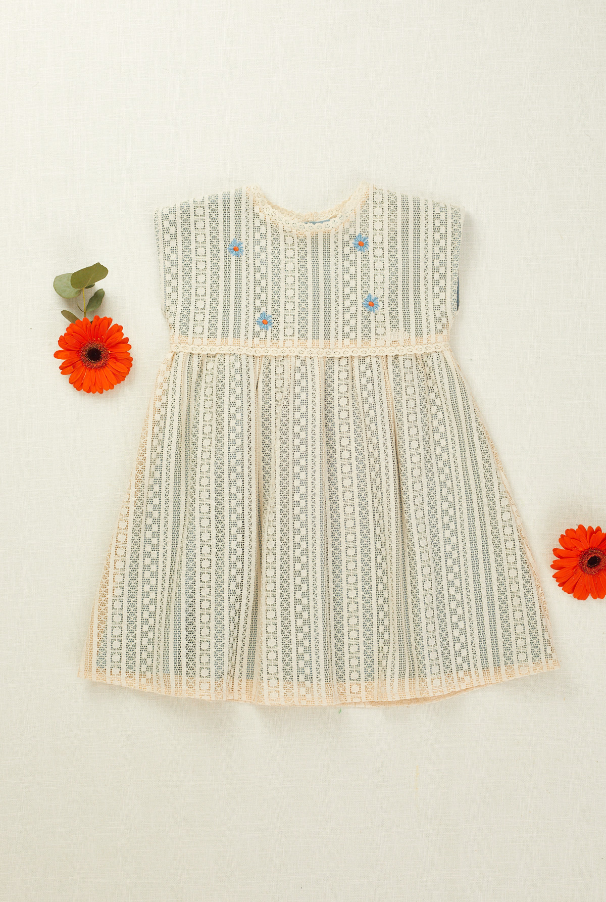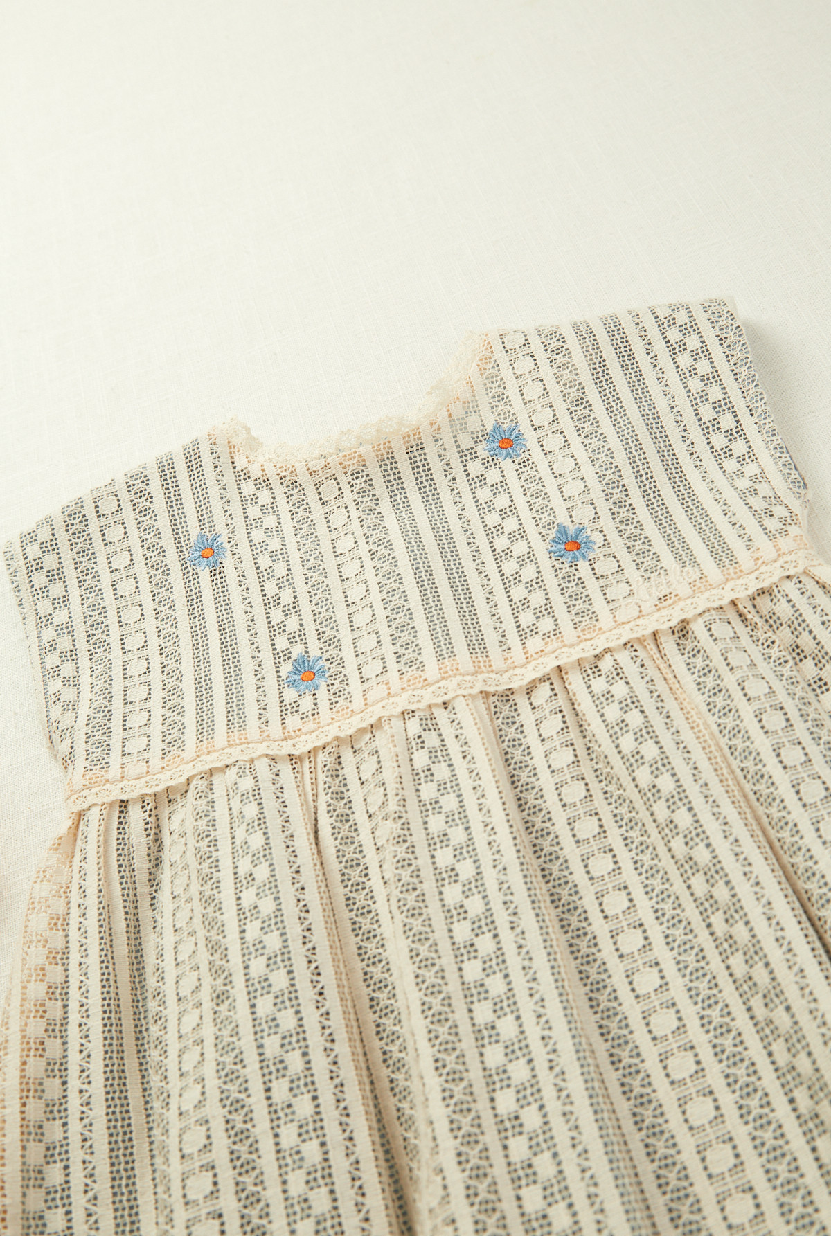 Vestido doble manga corta, cuello redondo y corte en pechera. Tiene tterminacion con puntillas en cuello, y mangas. Capa superior bordada, y viso interior de algodón.