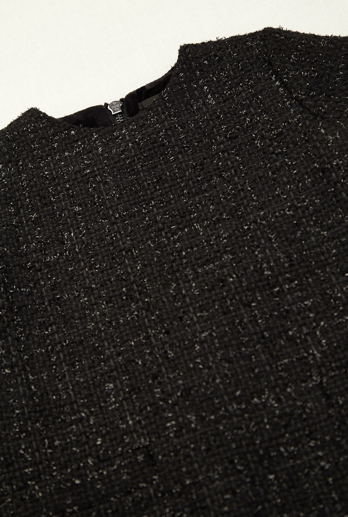 Vestido de paño brillante. Corto por arriba de la rodilla y manga corta. Cierre metalico en espalda y bolisllo en frente. Forreria interna y recumbrimiento en terciopelo en interior del cuello.