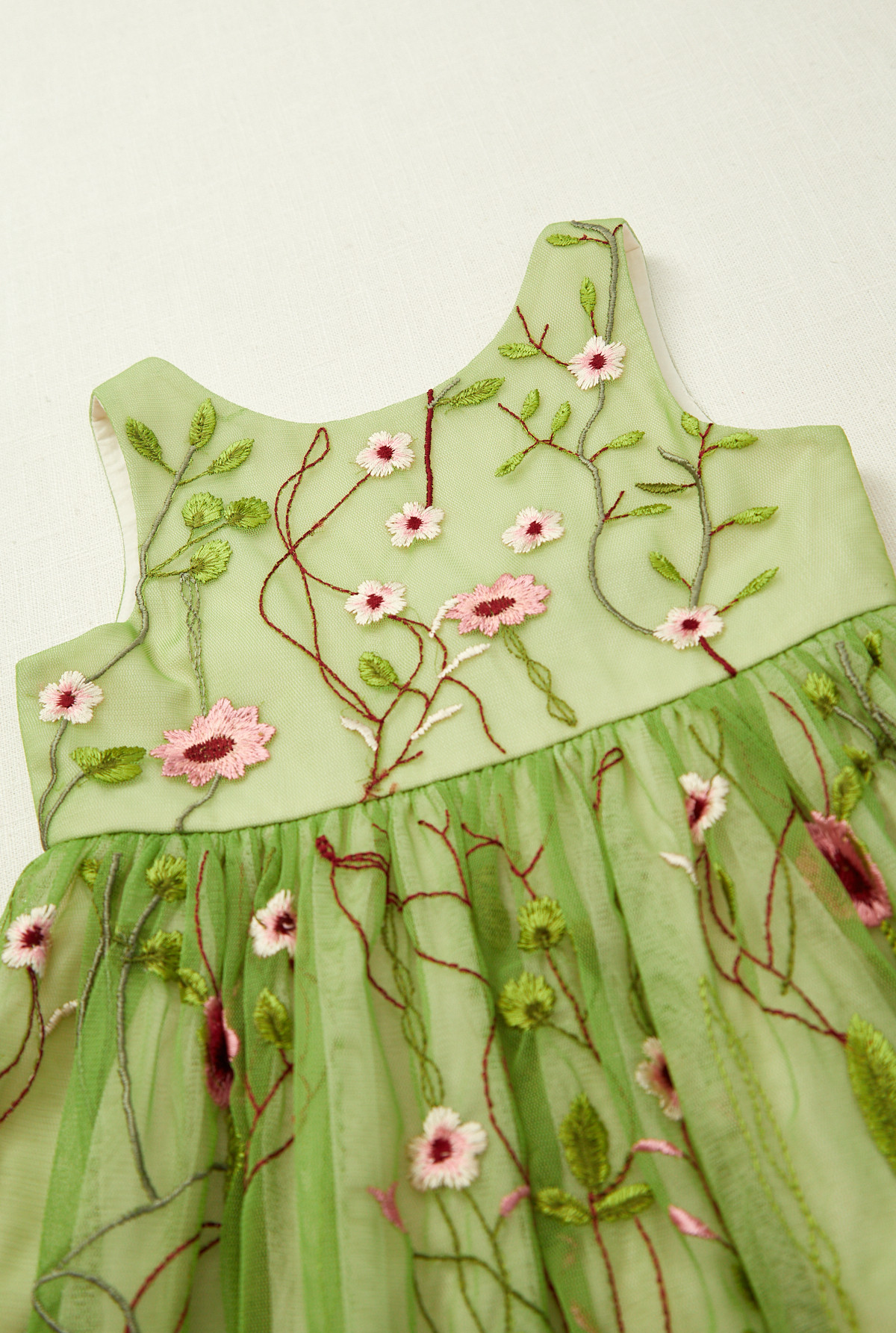 Vestido corto sin mangas, bordado. Tiene falda amplia y espalda abierta con botones. Forrado en su totalidad en algodon.
