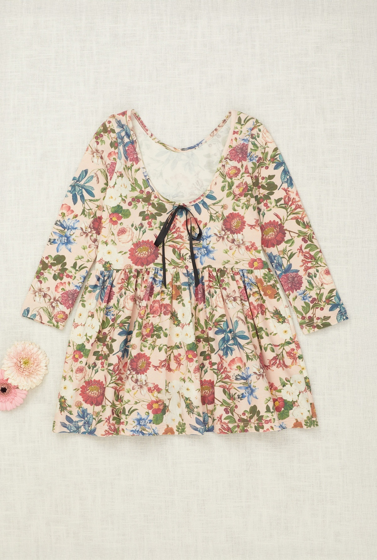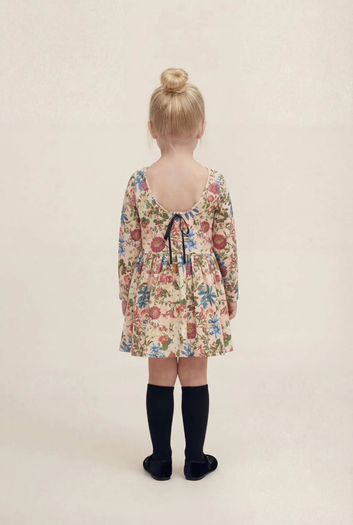 Vestido de cuello redondo y manga larga con estampa floreada. La falda está fruncida, lo que le da vuelo. En la espalda tiene un moño de cinta a modo de ornamento.