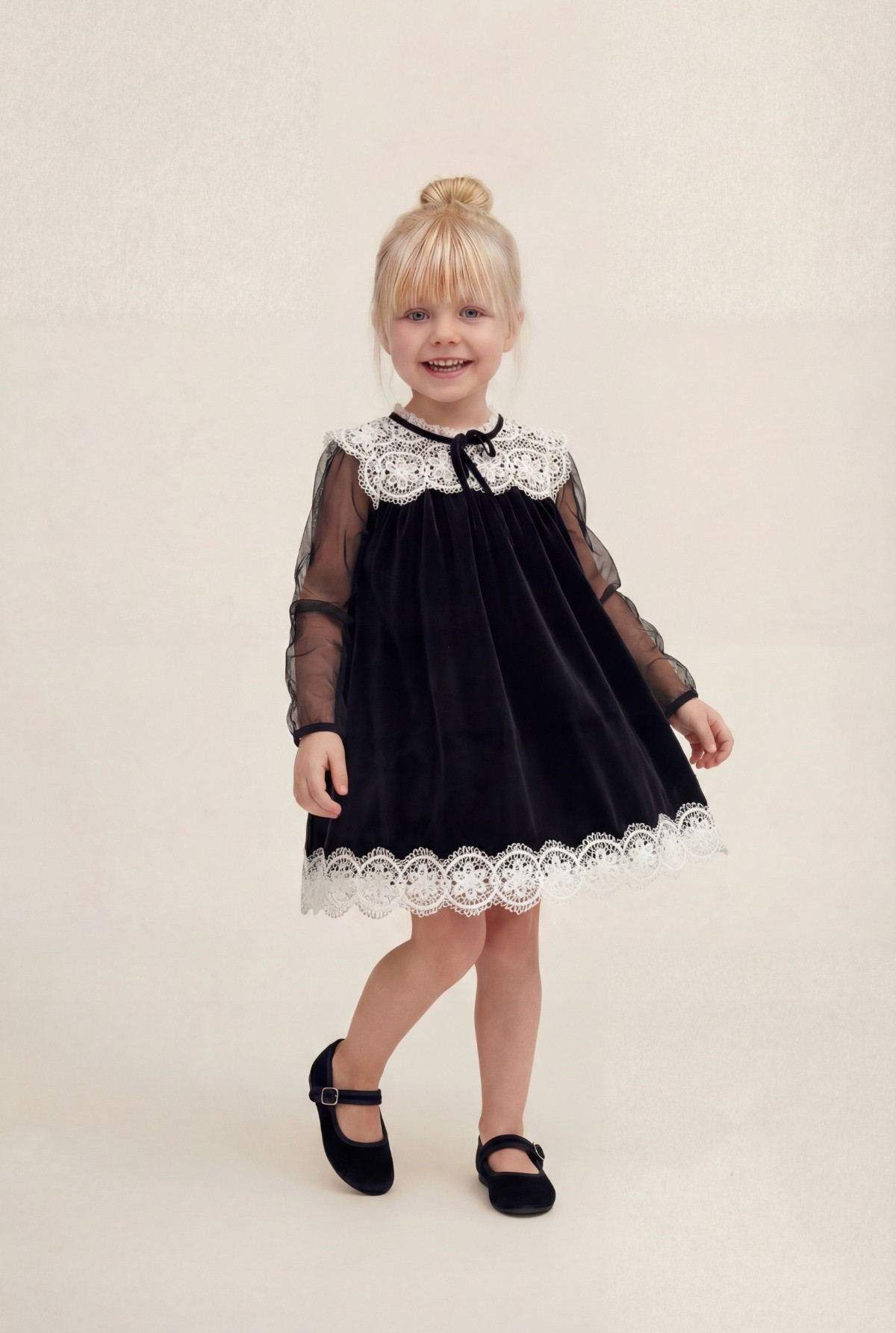Vestido de velvet, con mangas largas de tul y puntilla ancha en el ruedo y canesú. Tiene gota con un boton en la espalda. Forreria de algodon