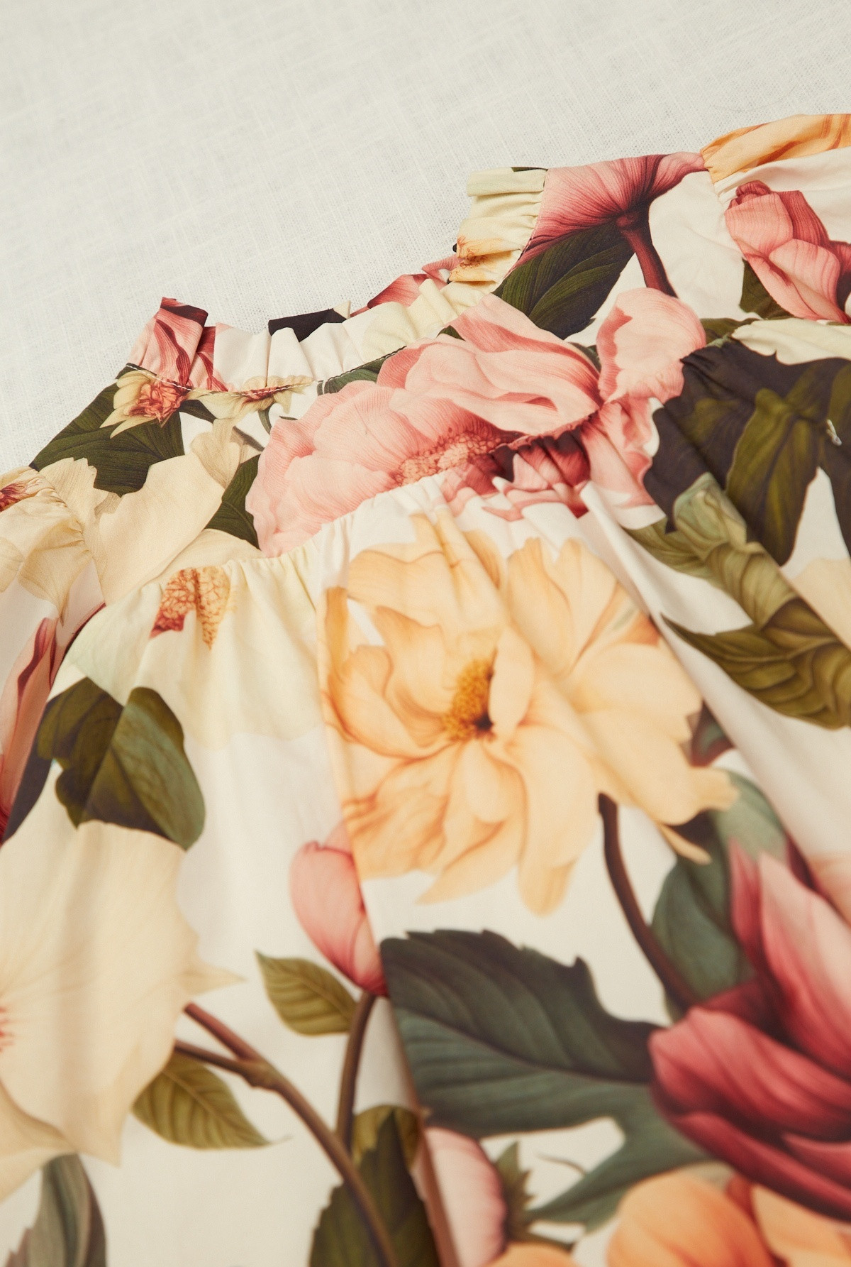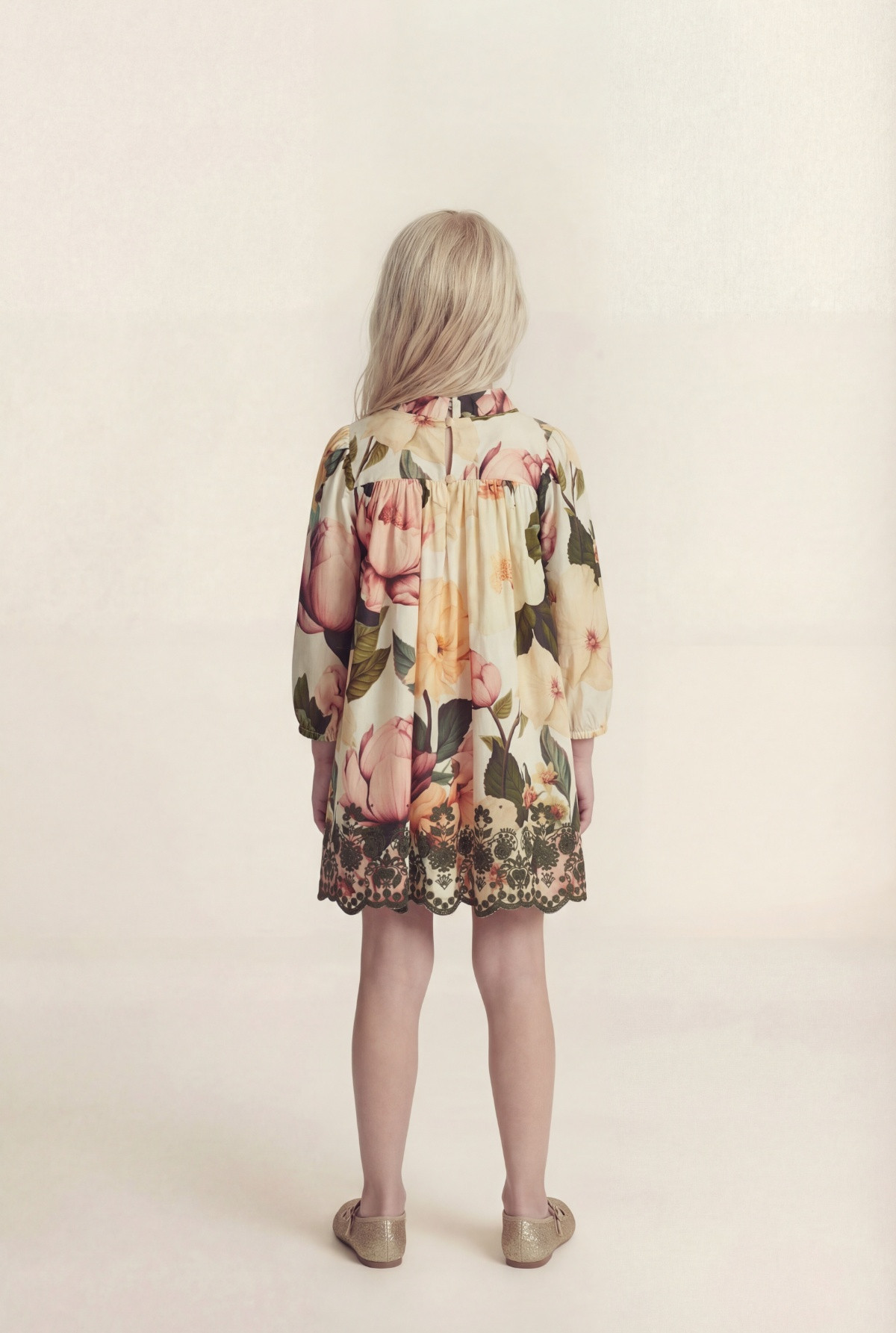 Vestido estampado manga larga fruncida, y bordado a contratono en el ruedo. Recorte en pechera y pollera amplia fruncida. Tiene gota con boton forrado en la espalda. Forreria de algodon