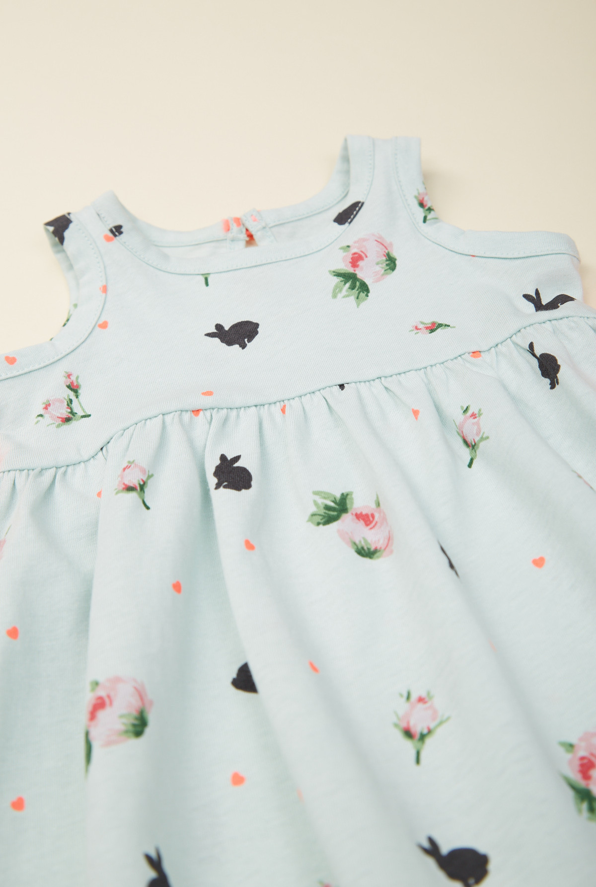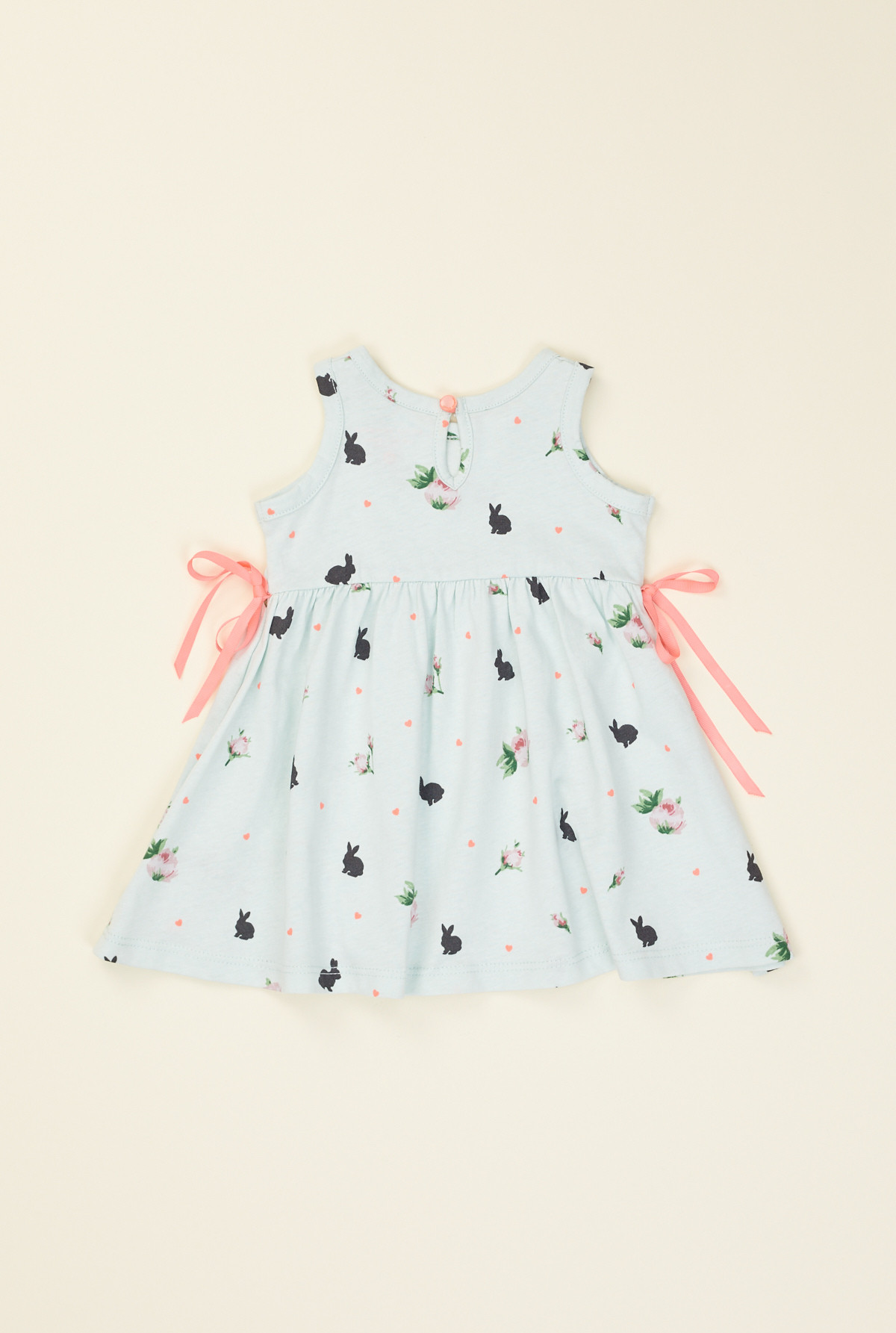 Vestido sobre la rodilla estampado con florcitas, conejos y corazones. Recorte en cintura, falda fruncida y acceso trasero con ojal y botón. Moños laterales en cintas gross a contratono.