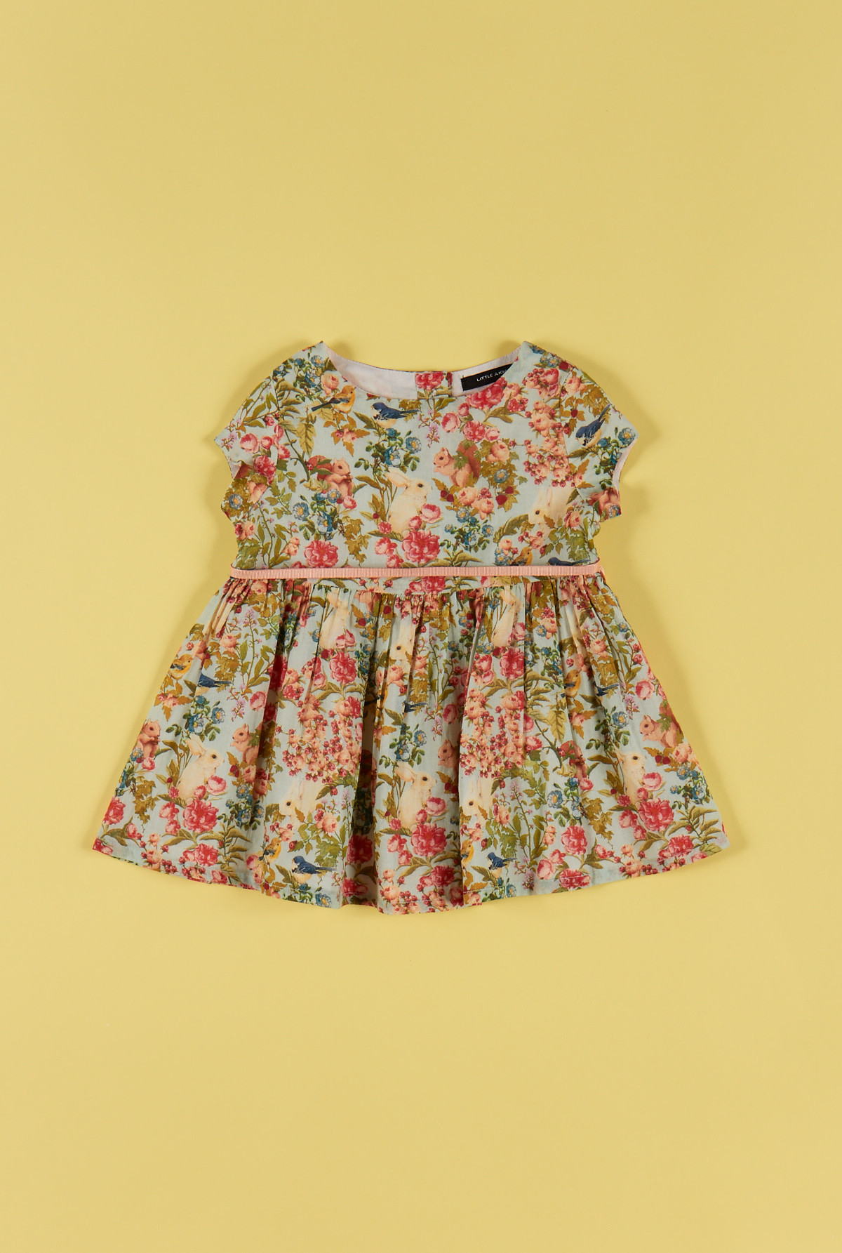Vestido manga corta, forrado y largo arriba de la rodilla de voile de algodón estampado con bosque de animalitos. Cinto extraible a contratono. Tiene cartera de apertura completa con botones en espalda.